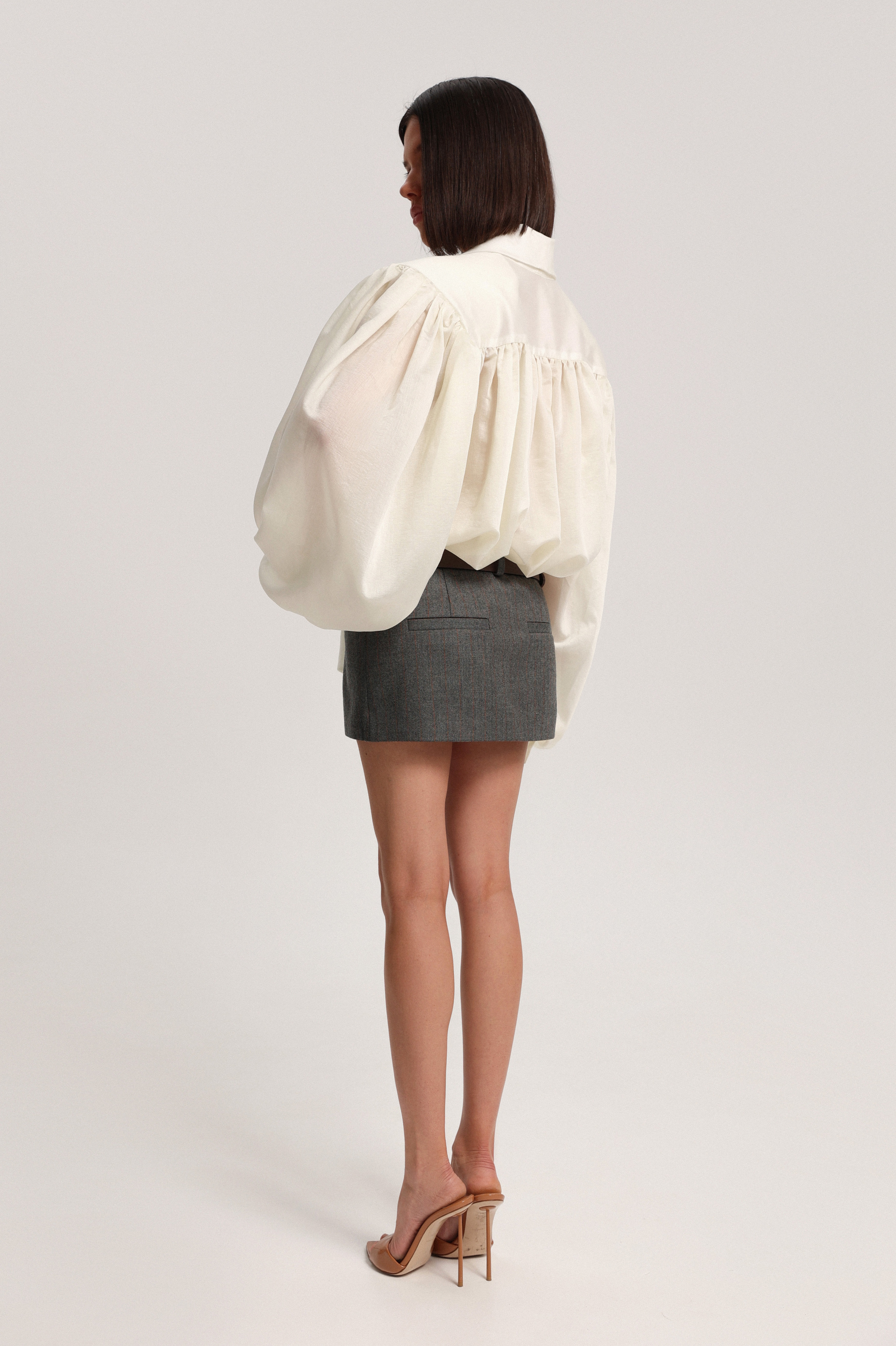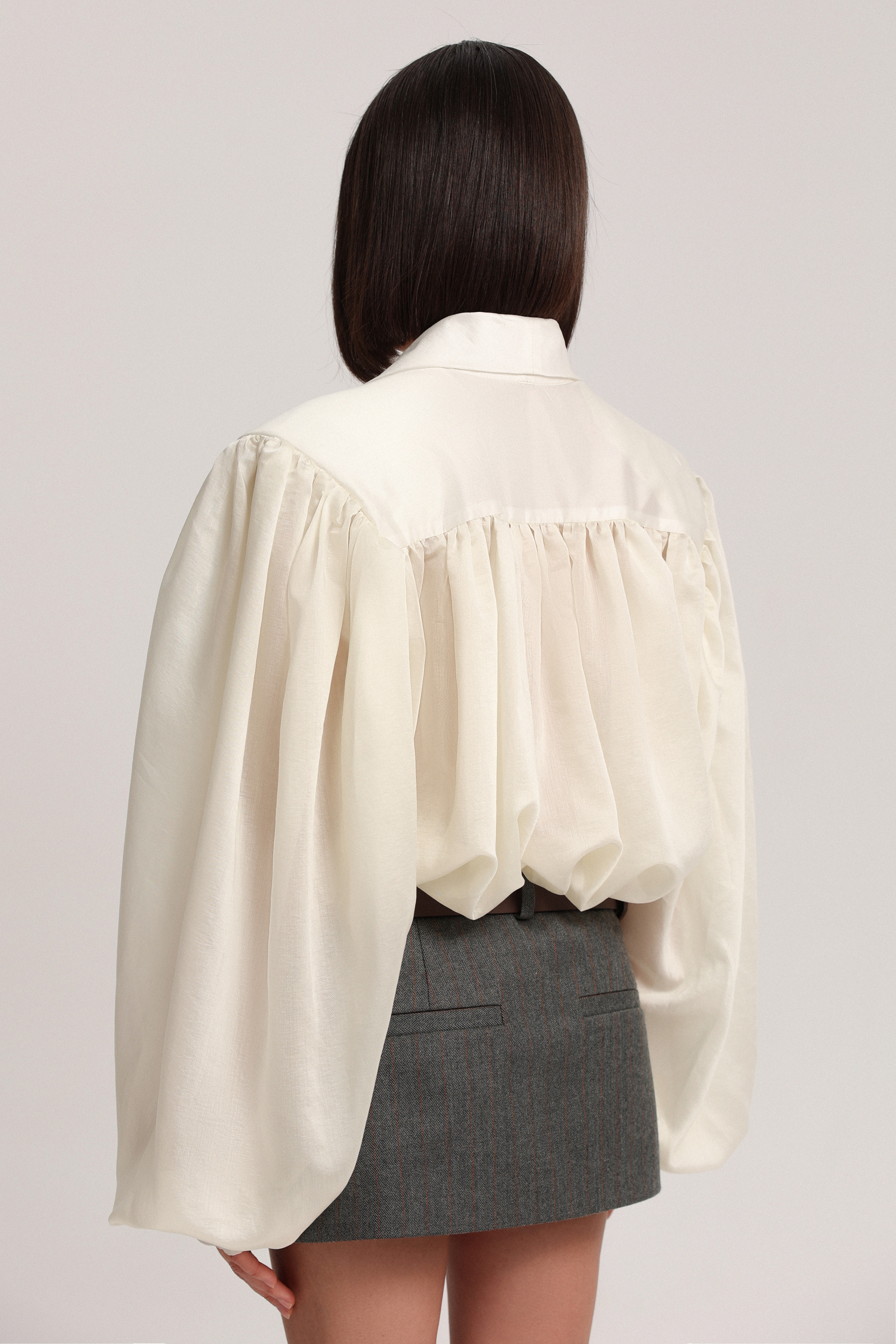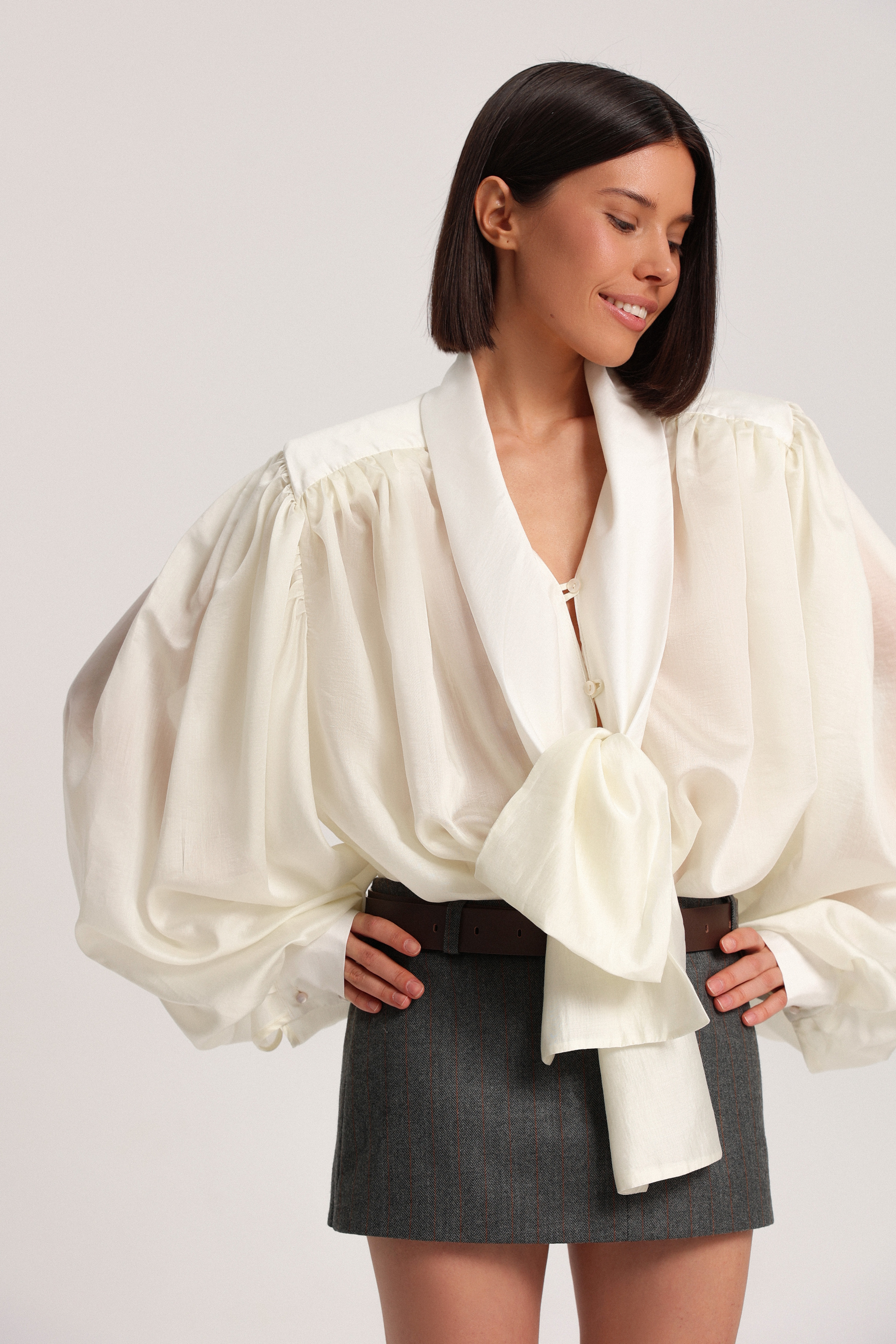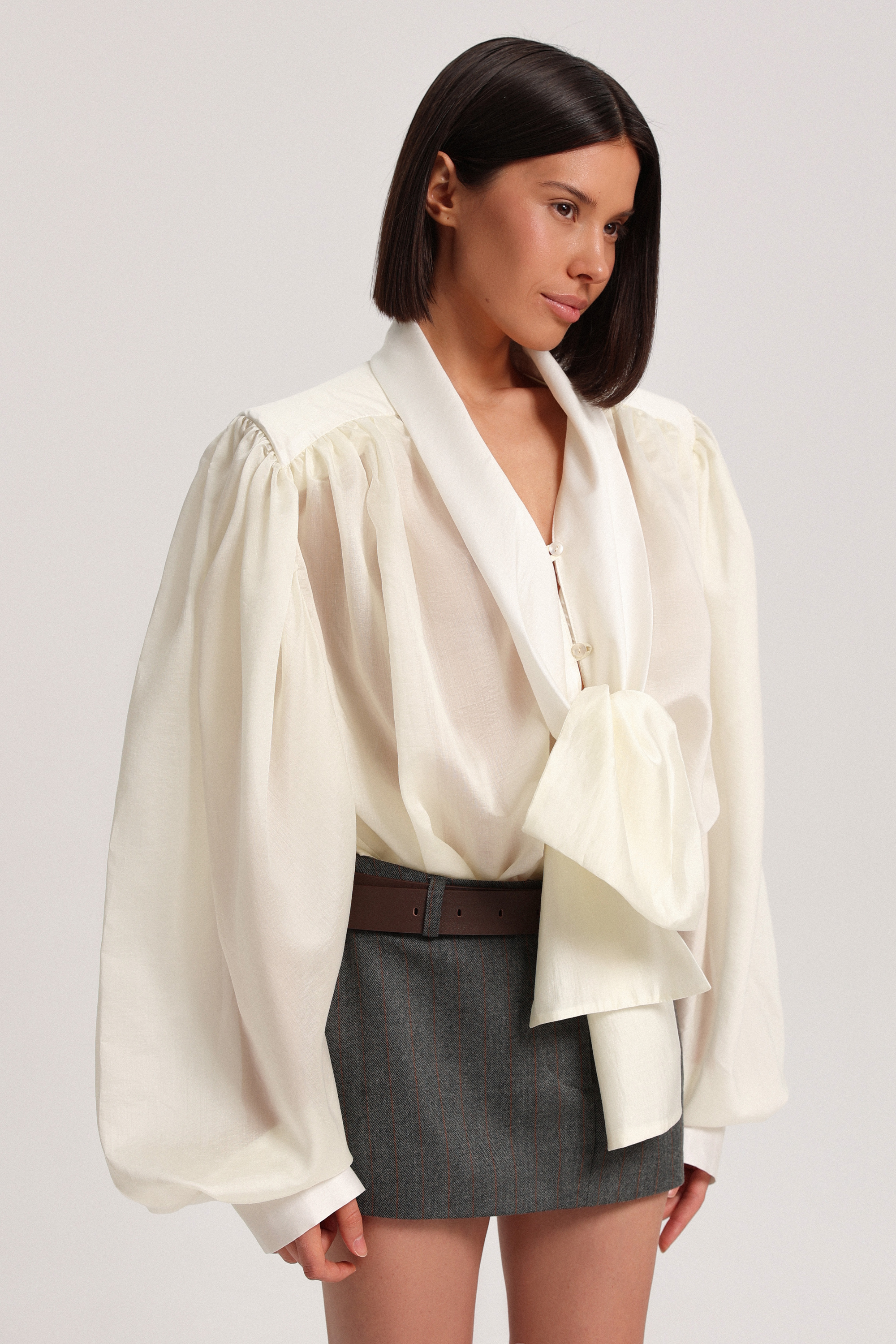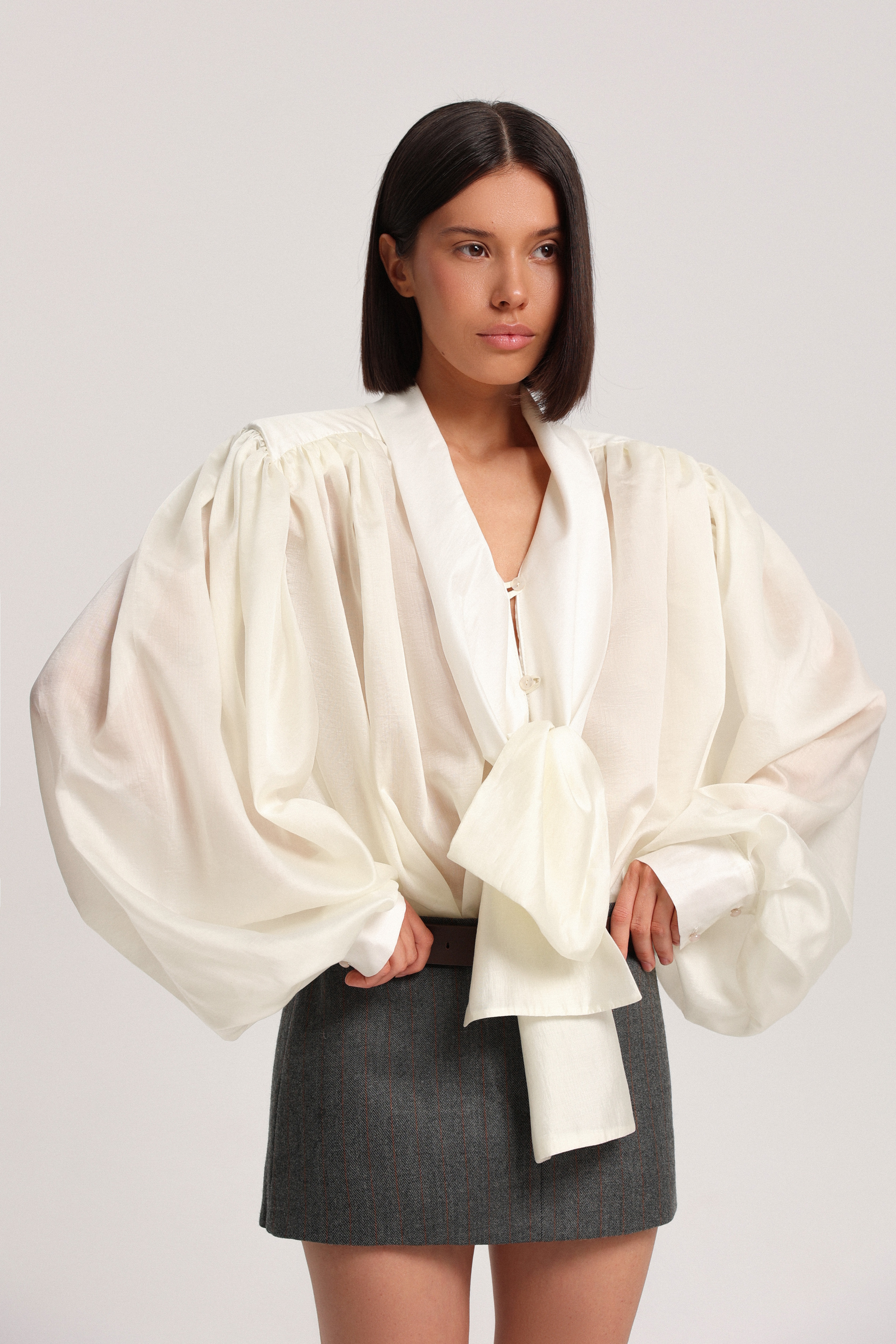 Блуза с бантом из тонкой вуалевой ткани. Модель дополнена обильной драпировкой на рукавах и по спинке, создающей выразительный объём. Несъёмные подплечники формируют характерный силуэт. В зоне декольте предусмотрены две пуговицы для регулирования глубины выреза, манжеты застёгиваются на пуговицы.