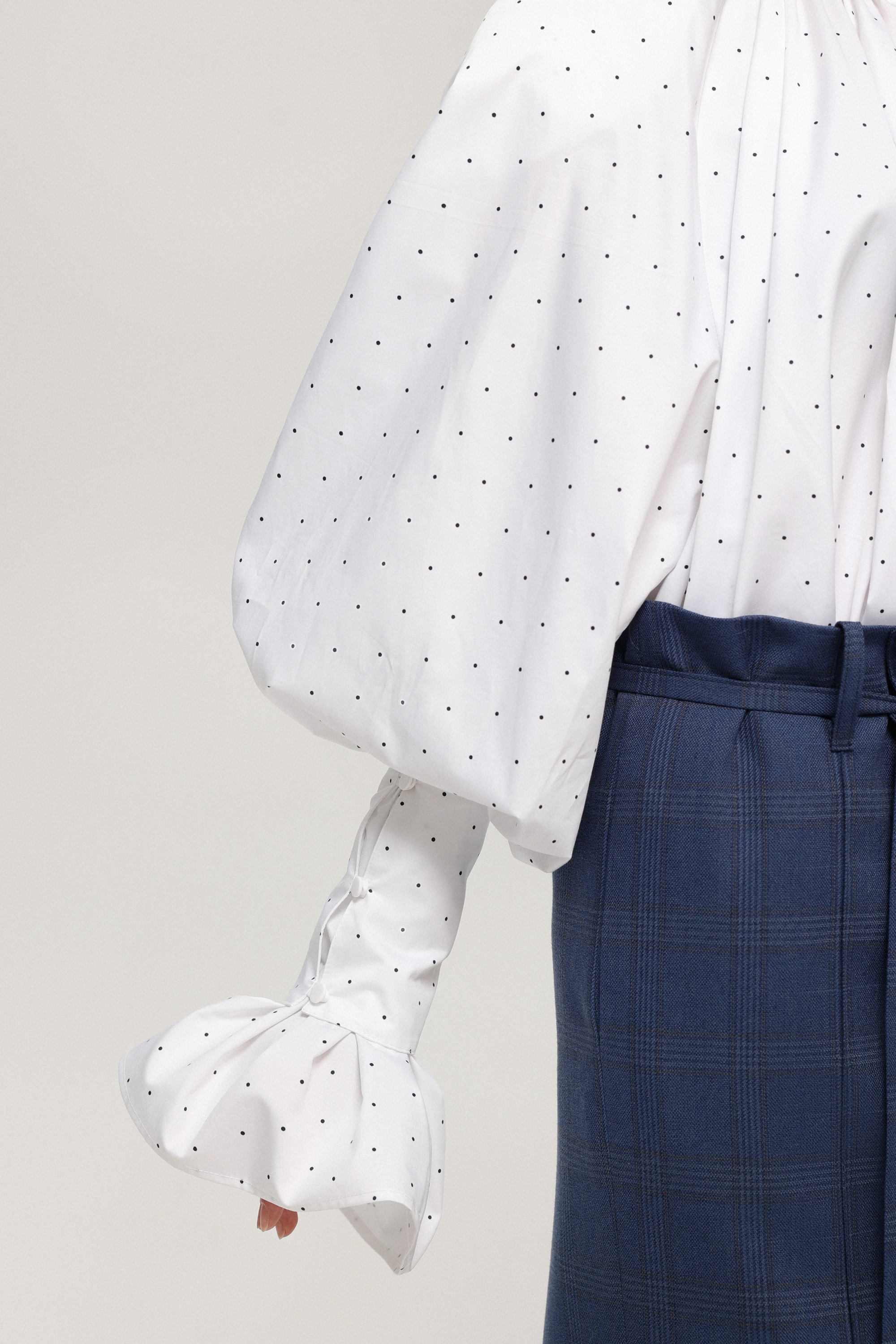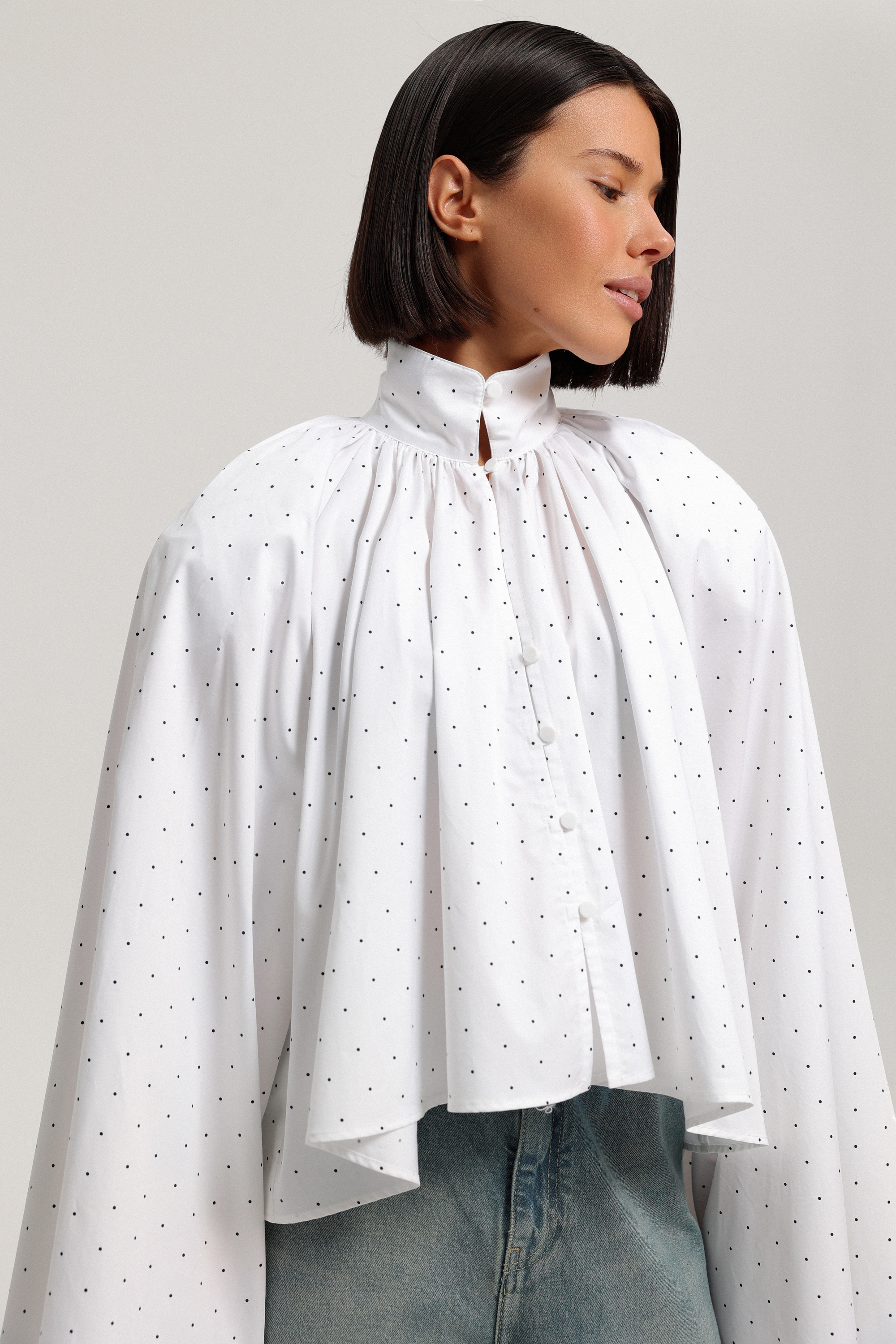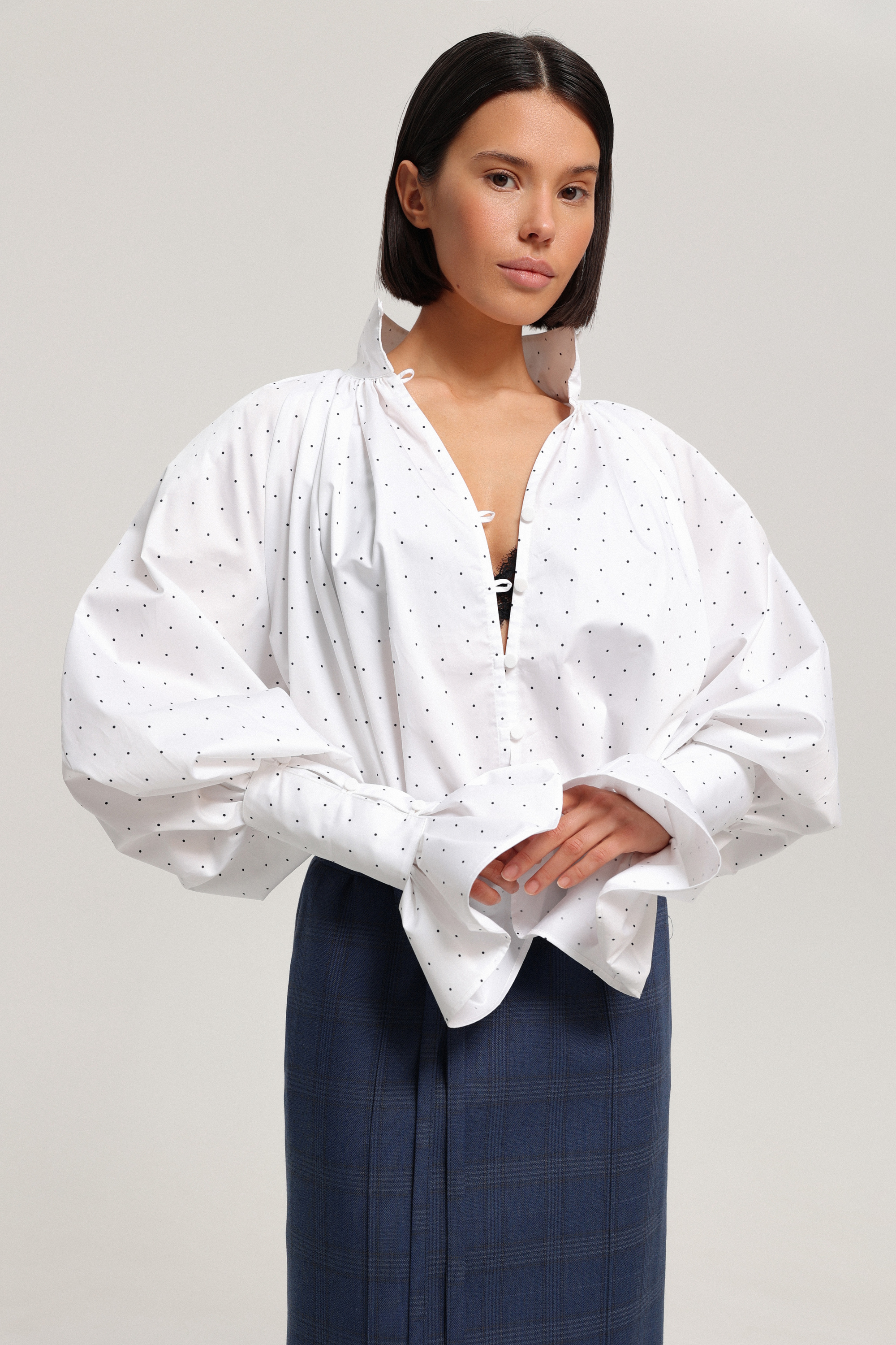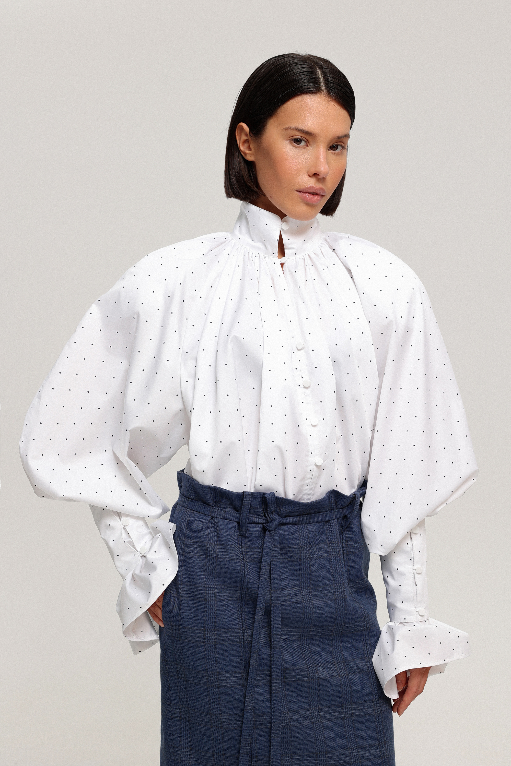 Блуза реглан на пуговицах с объёмными длинными рукавами и съёмными подплечниками. Съёмные манжеты можно носить выше или ниже, по-разному драпируя силуэт. Для разнообразной стилизации блузу можно застёгивать полностью или частично, меняя настроение образа.
