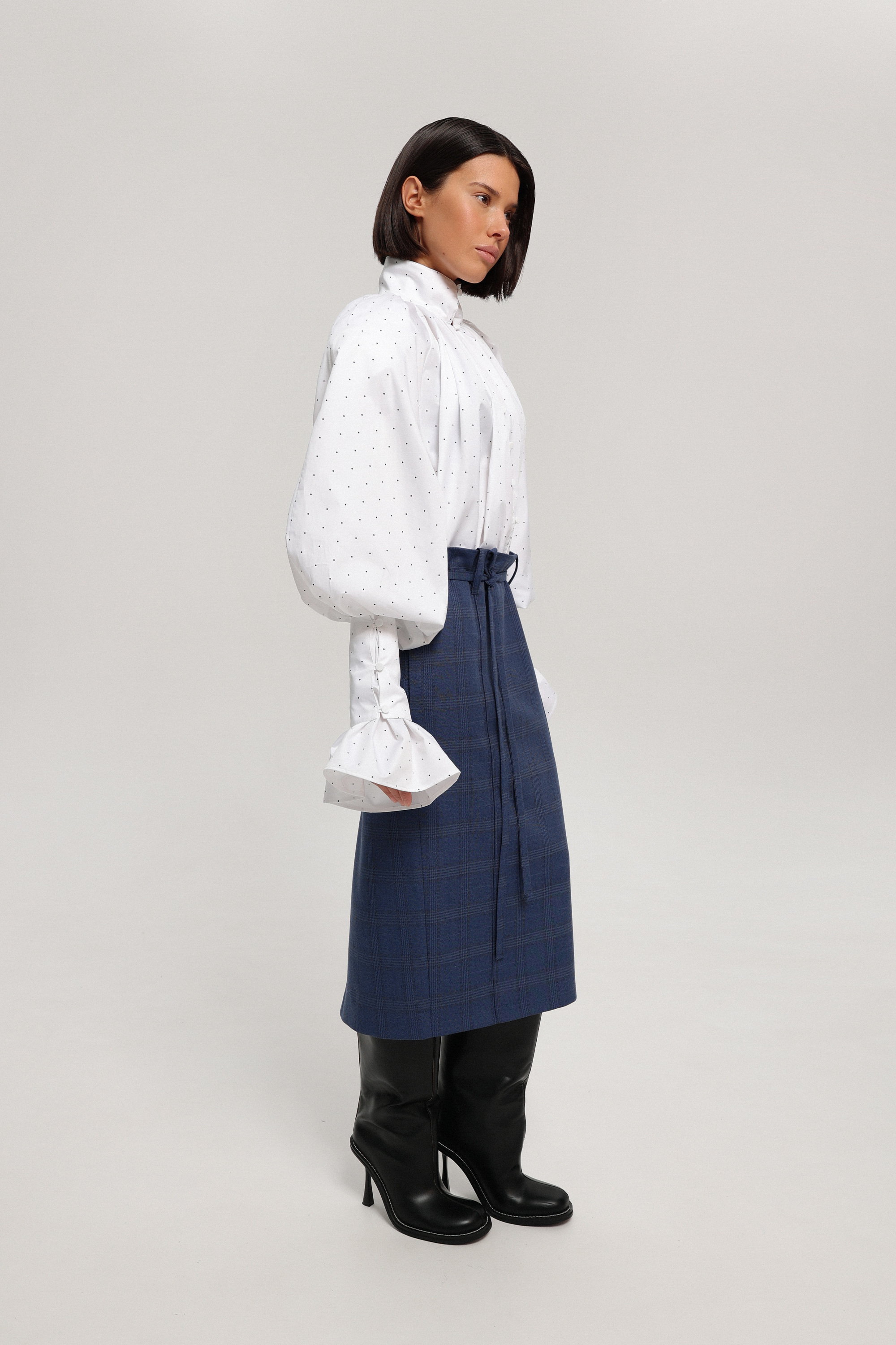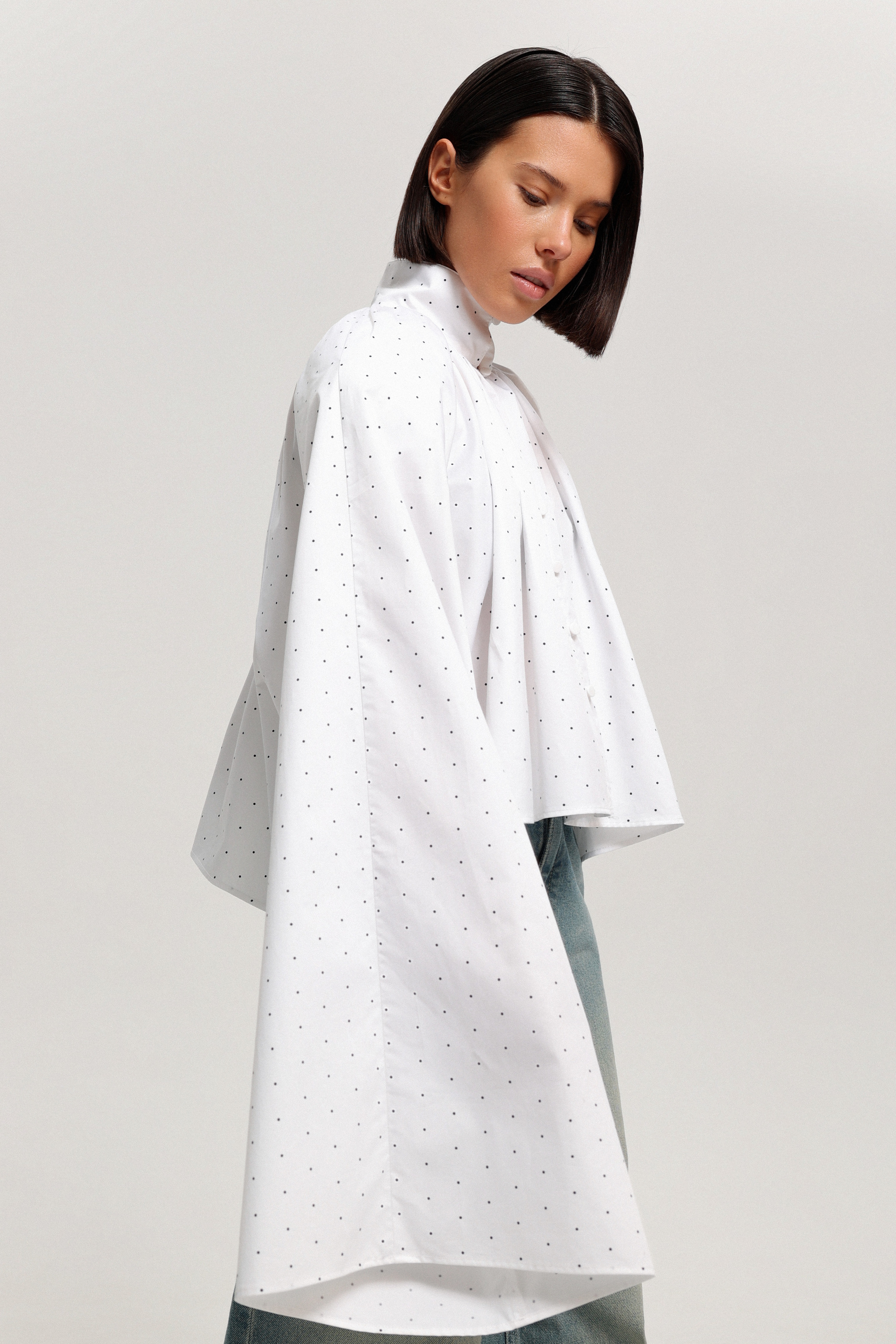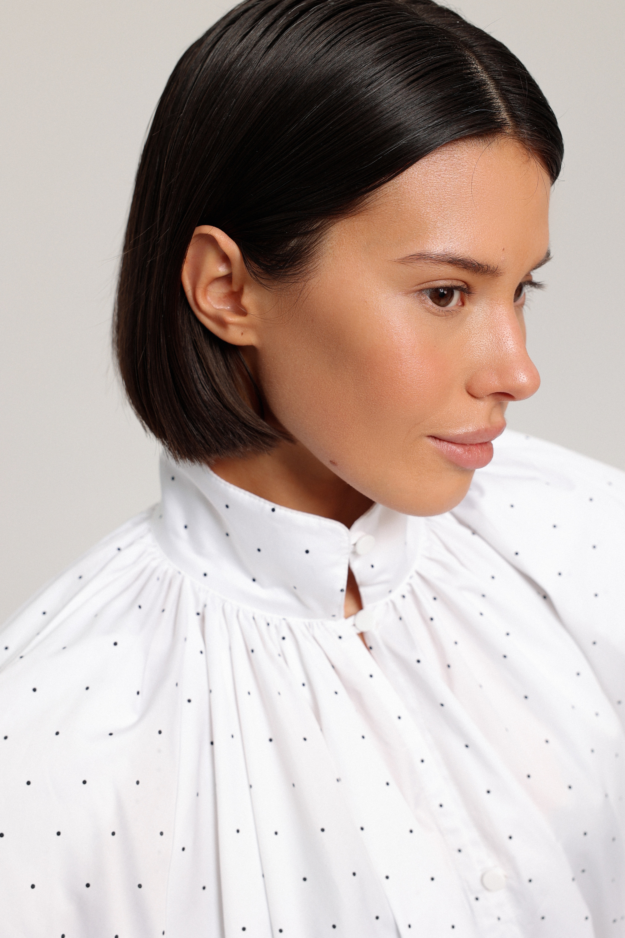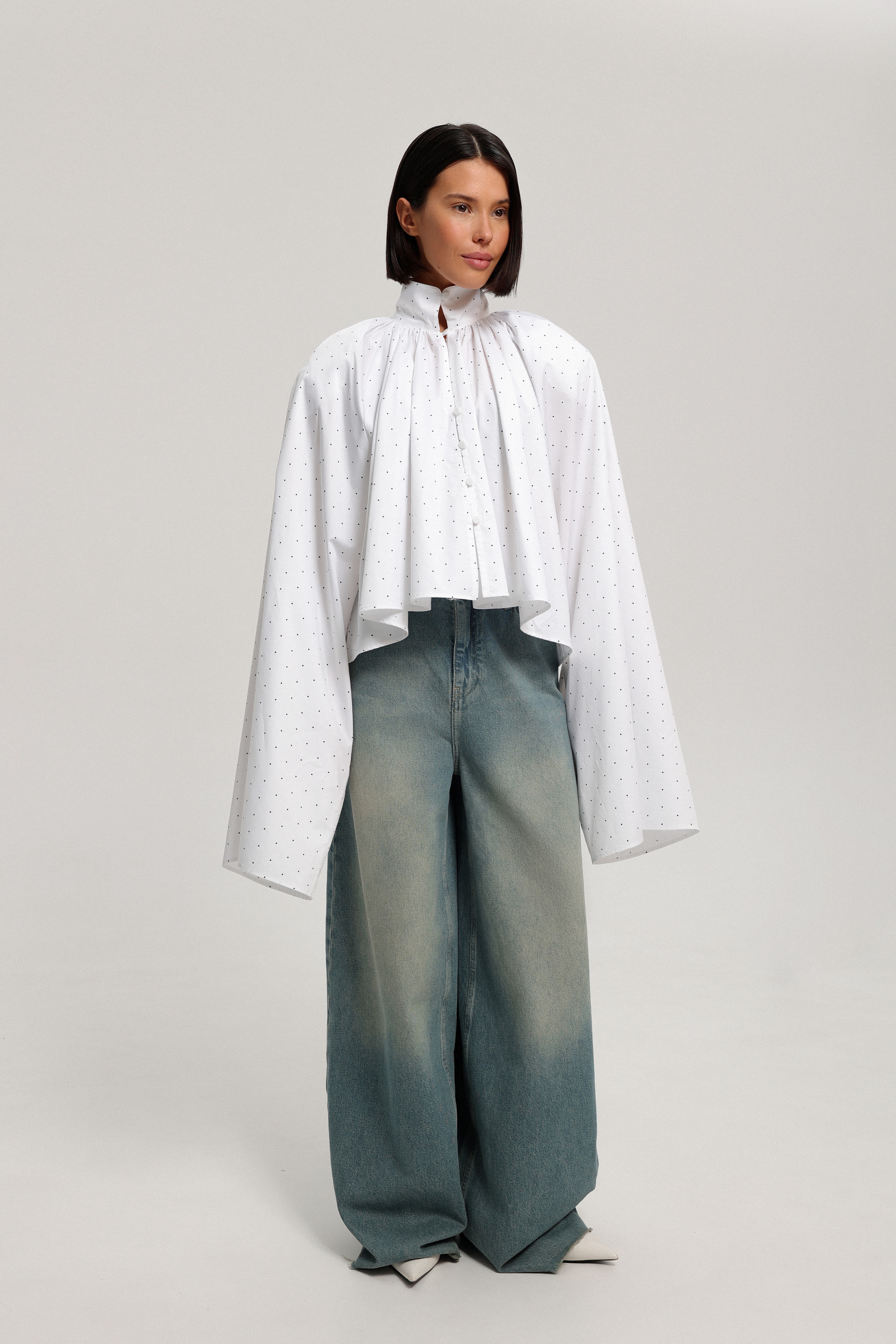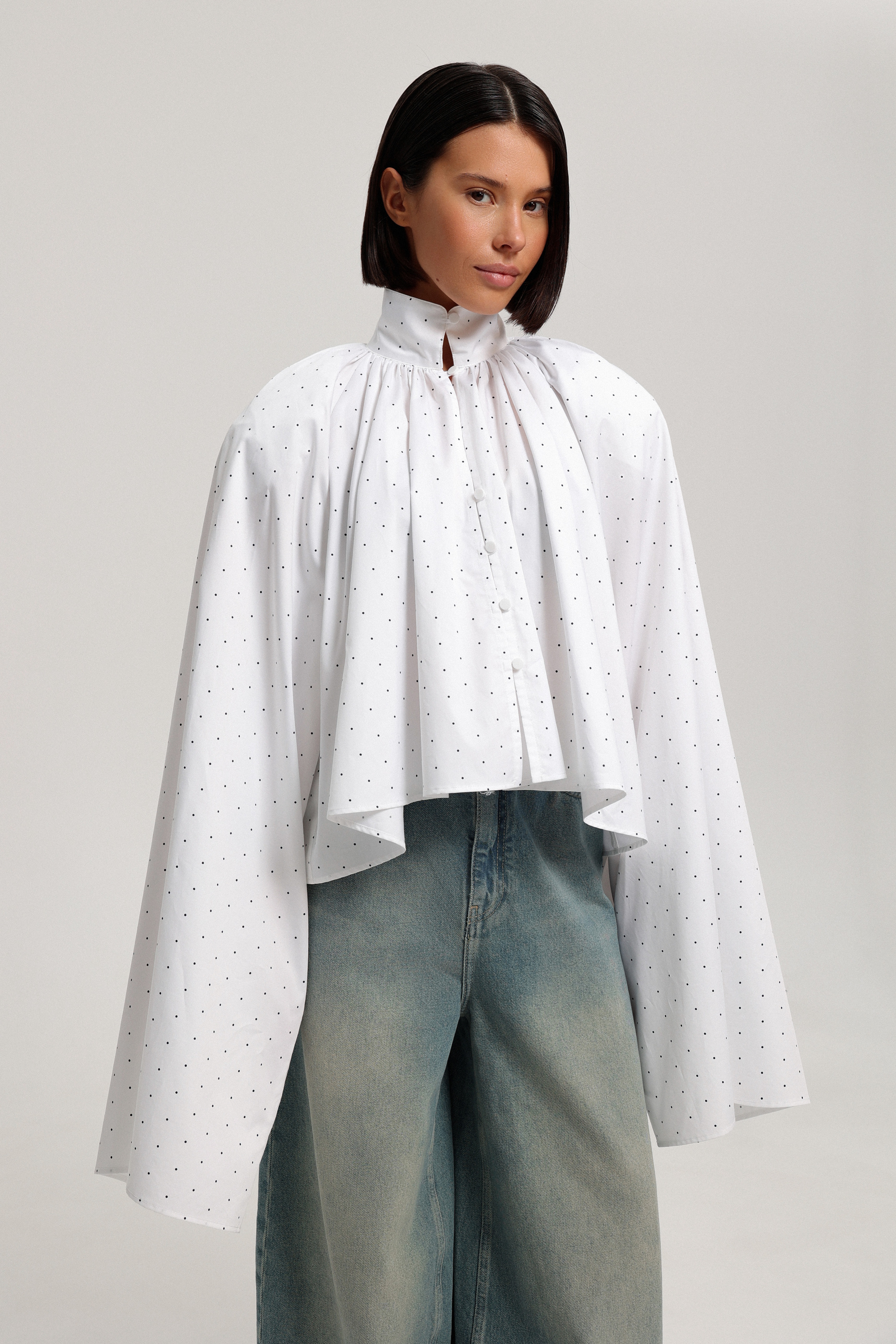 Блуза реглан на пуговицах с объёмными длинными рукавами и съёмными подплечниками. Съёмные манжеты можно носить выше или ниже, по-разному драпируя силуэт. Для разнообразной стилизации блузу можно застёгивать полностью или частично, меняя настроение образа.