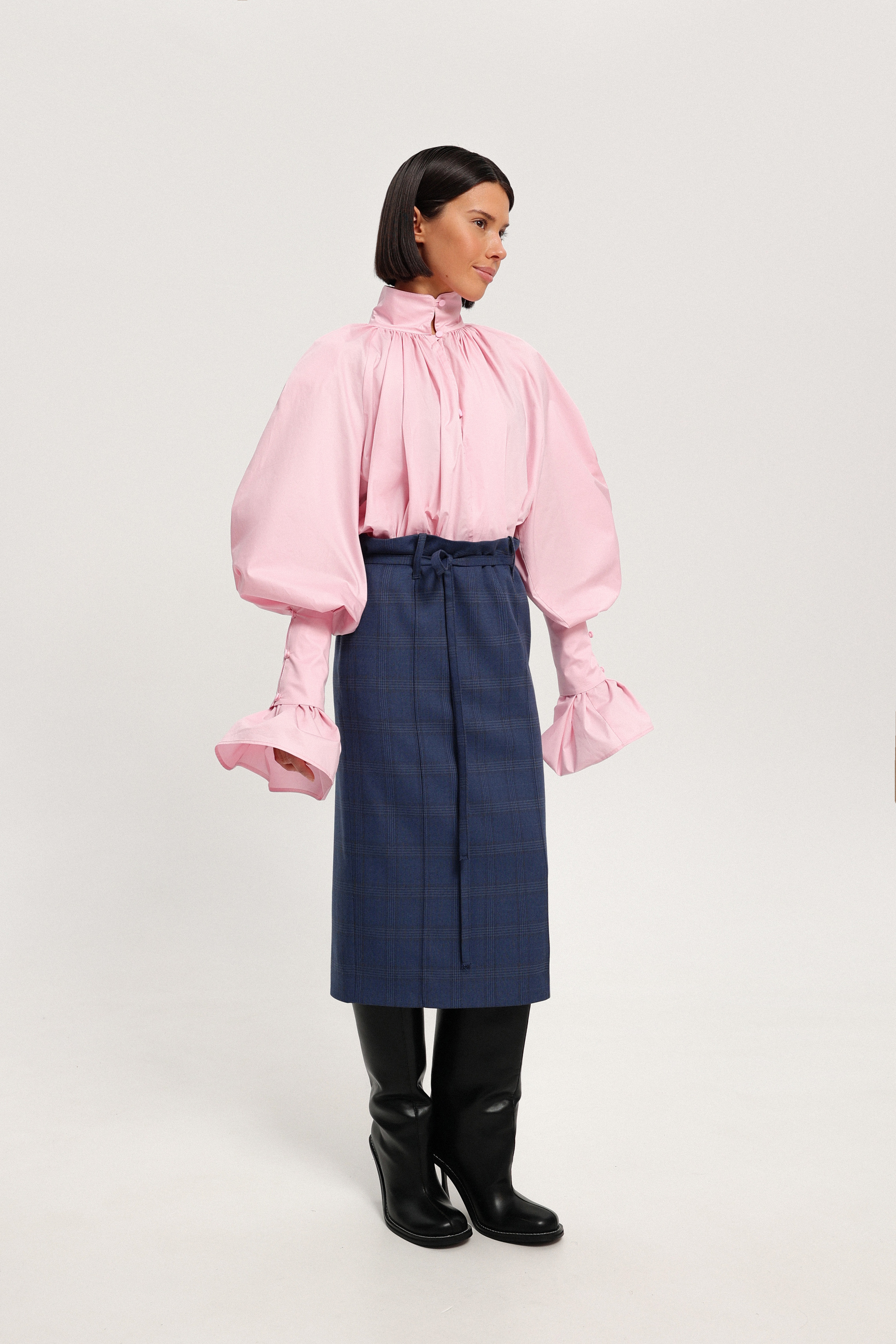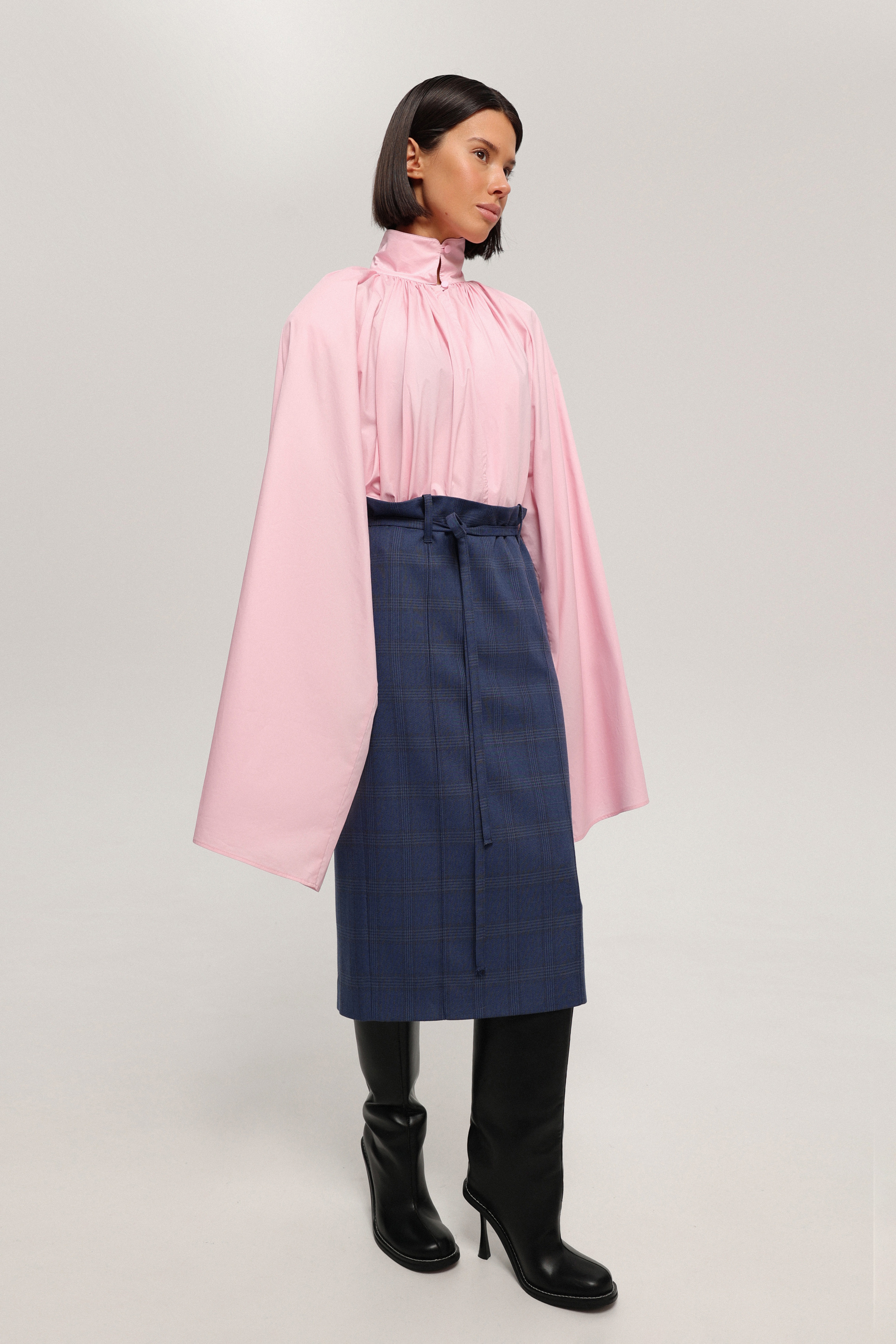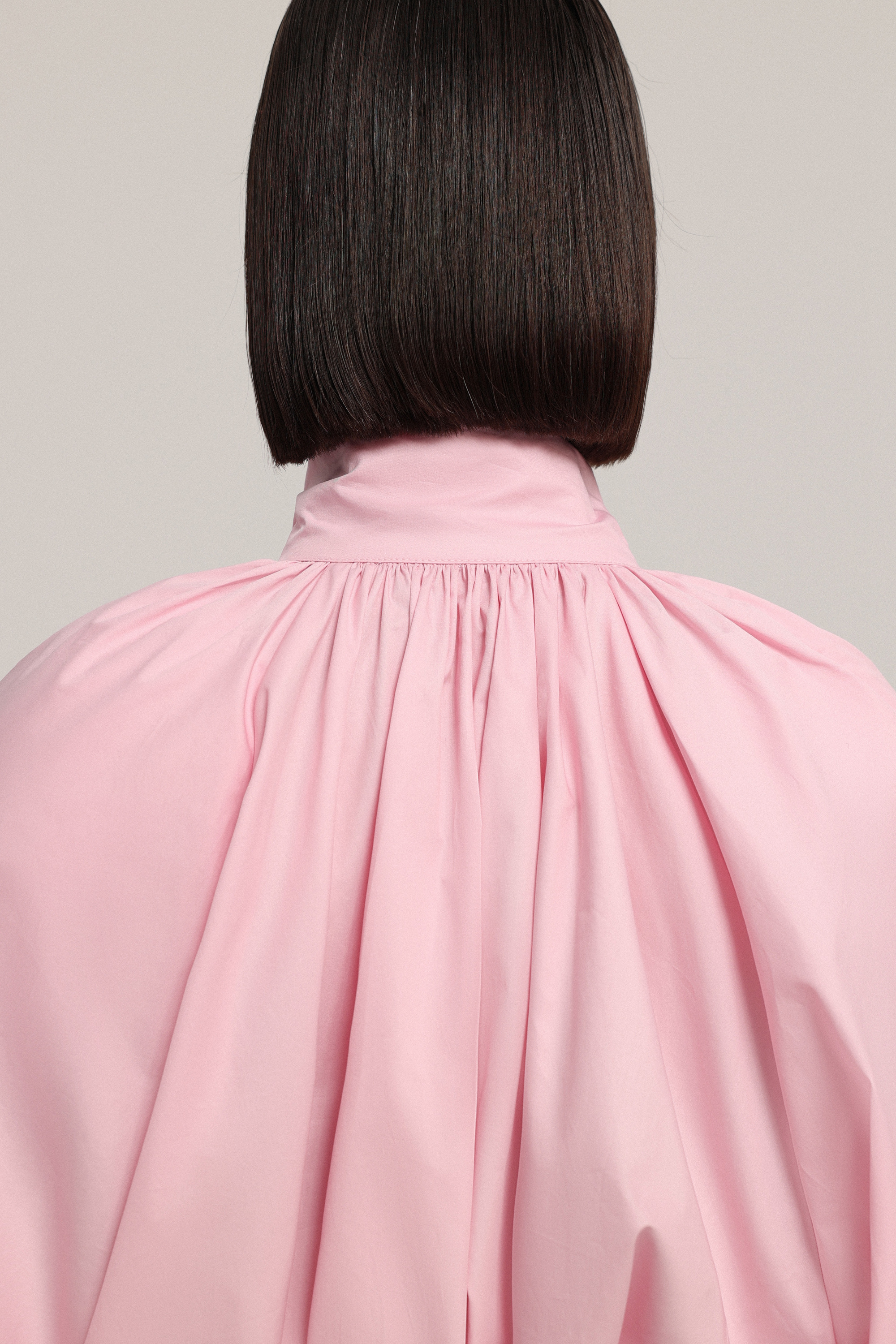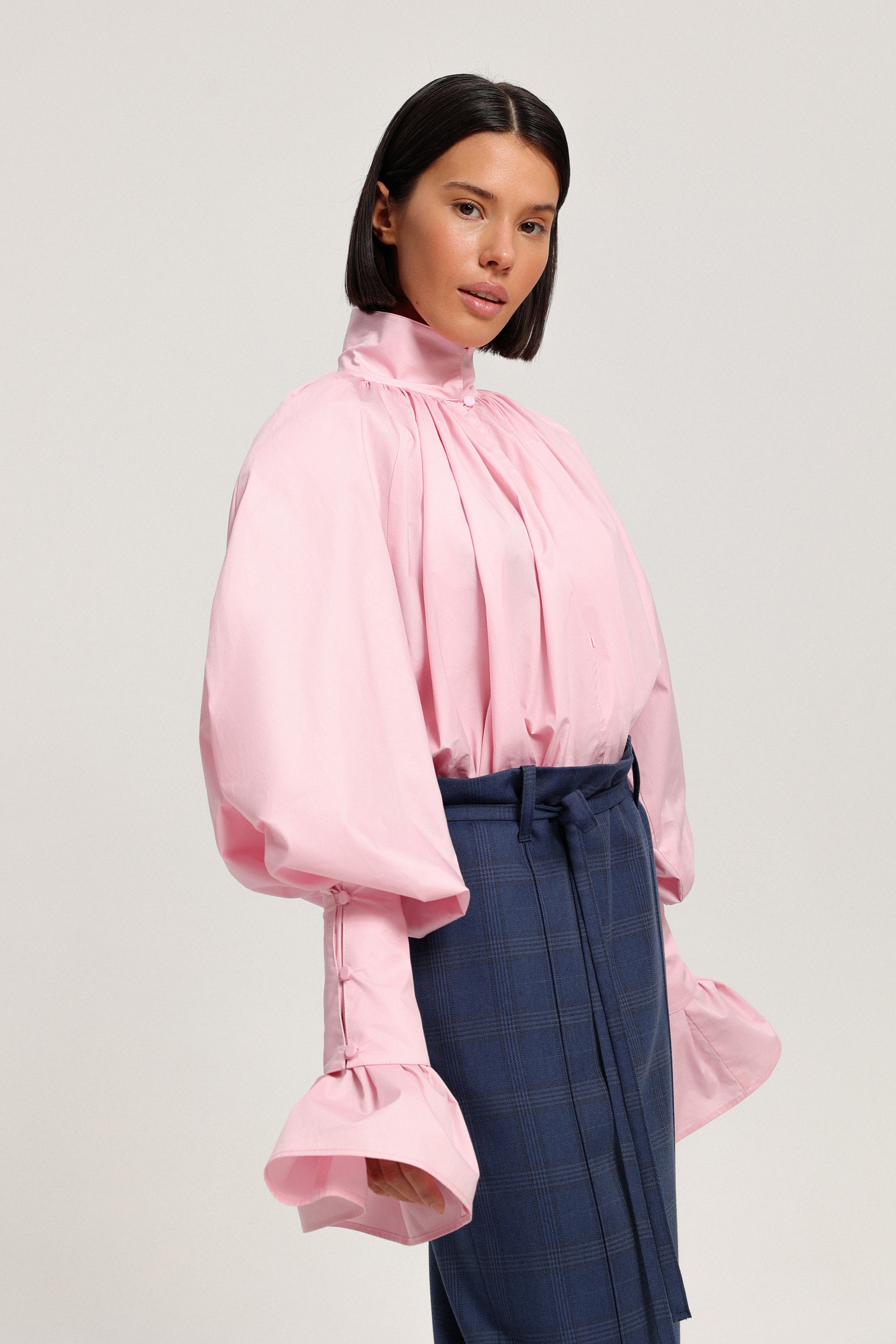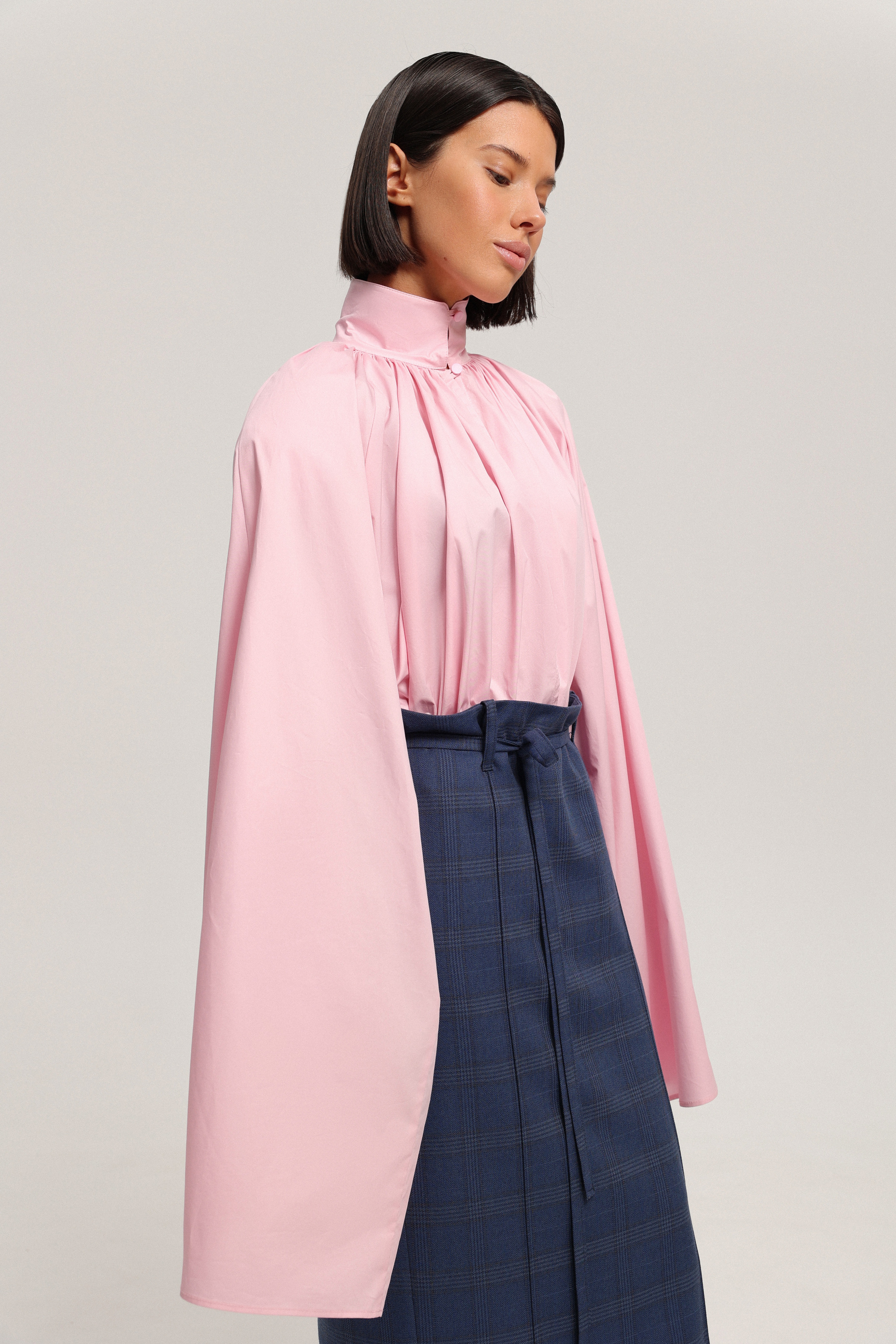 Блуза реглан на пуговицах с объёмными длинными рукавами и съёмными подплечниками. Съёмные манжеты можно носить выше или ниже, по-разному драпируя силуэт. Для разнообразной стилизации блузу можно застёгивать полностью или частично, меняя настроение образа.