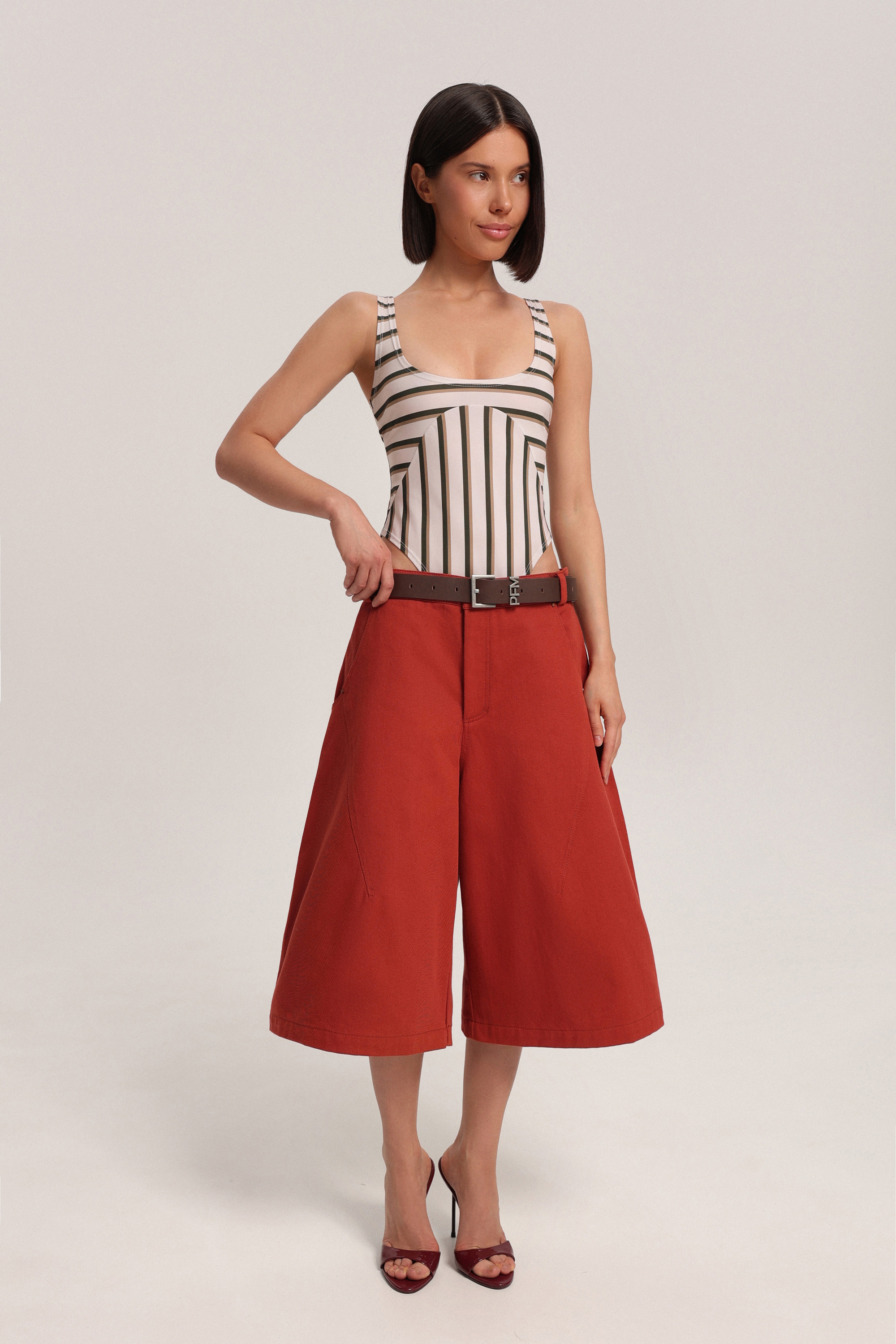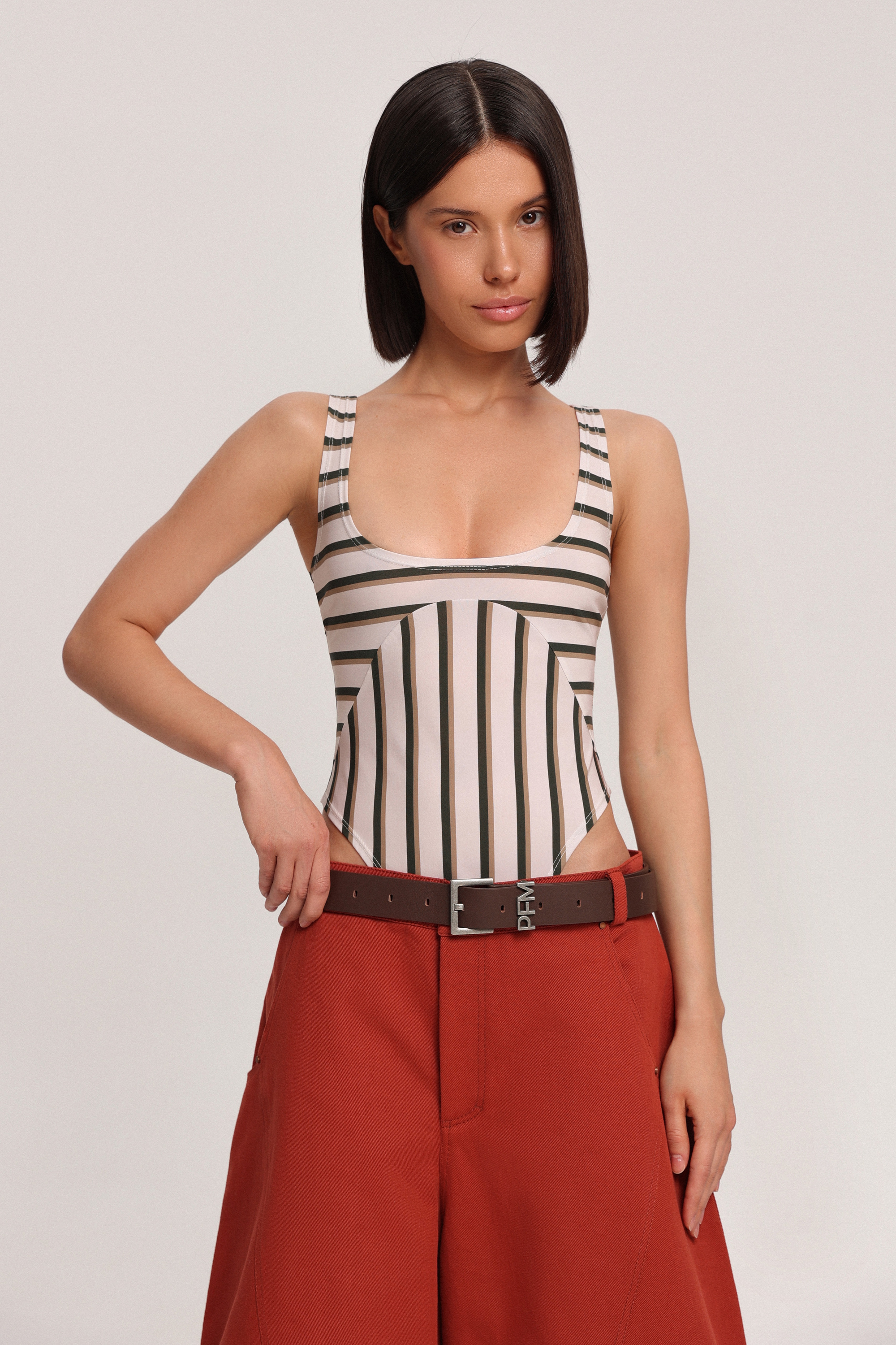 Боди в полоску с вырезом, который мягко подчёркивает линию декольте. Модель аккуратно облегает фигуру и легко вписывается как в повседневные, так и в более праздничные образы.