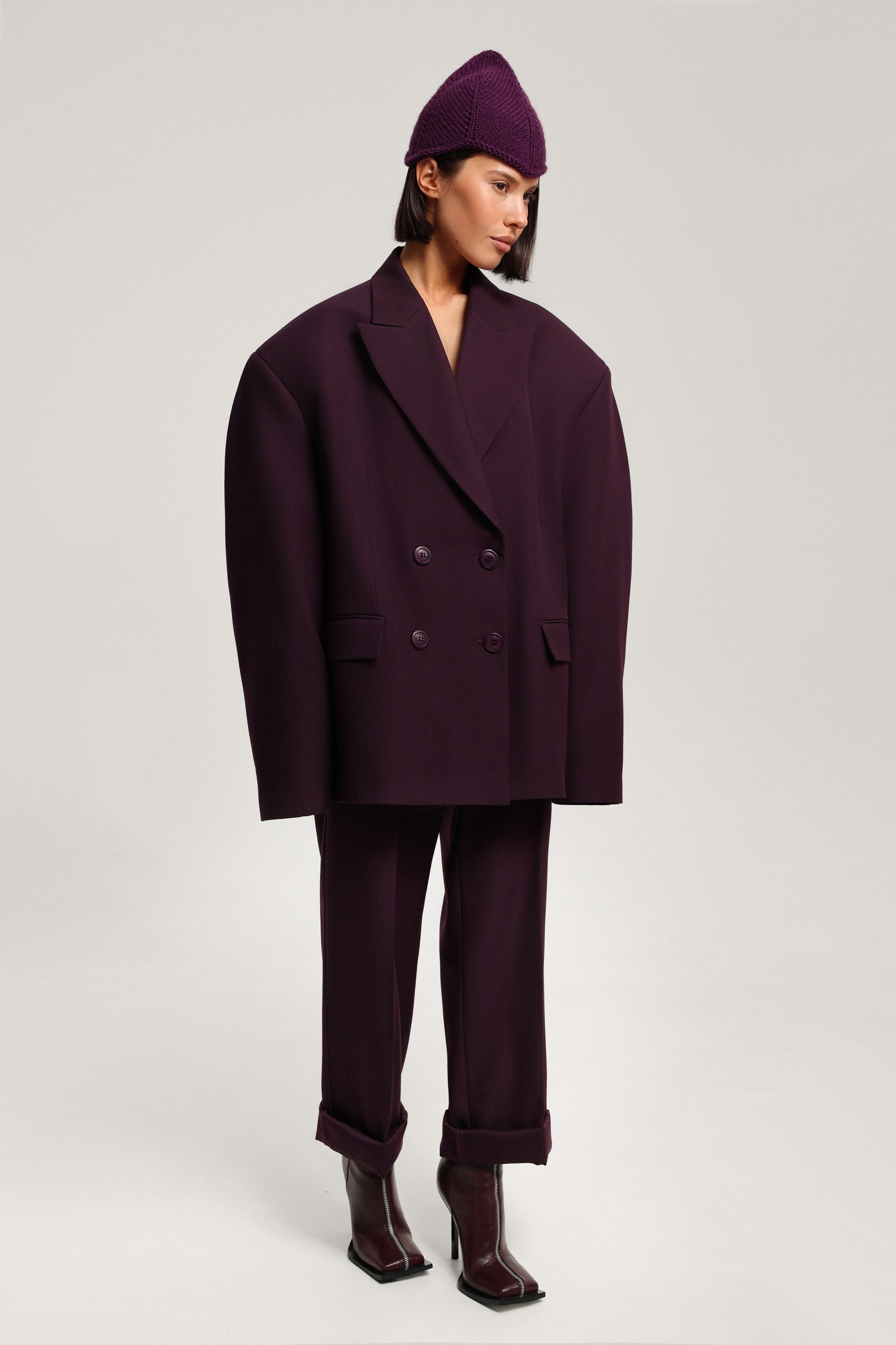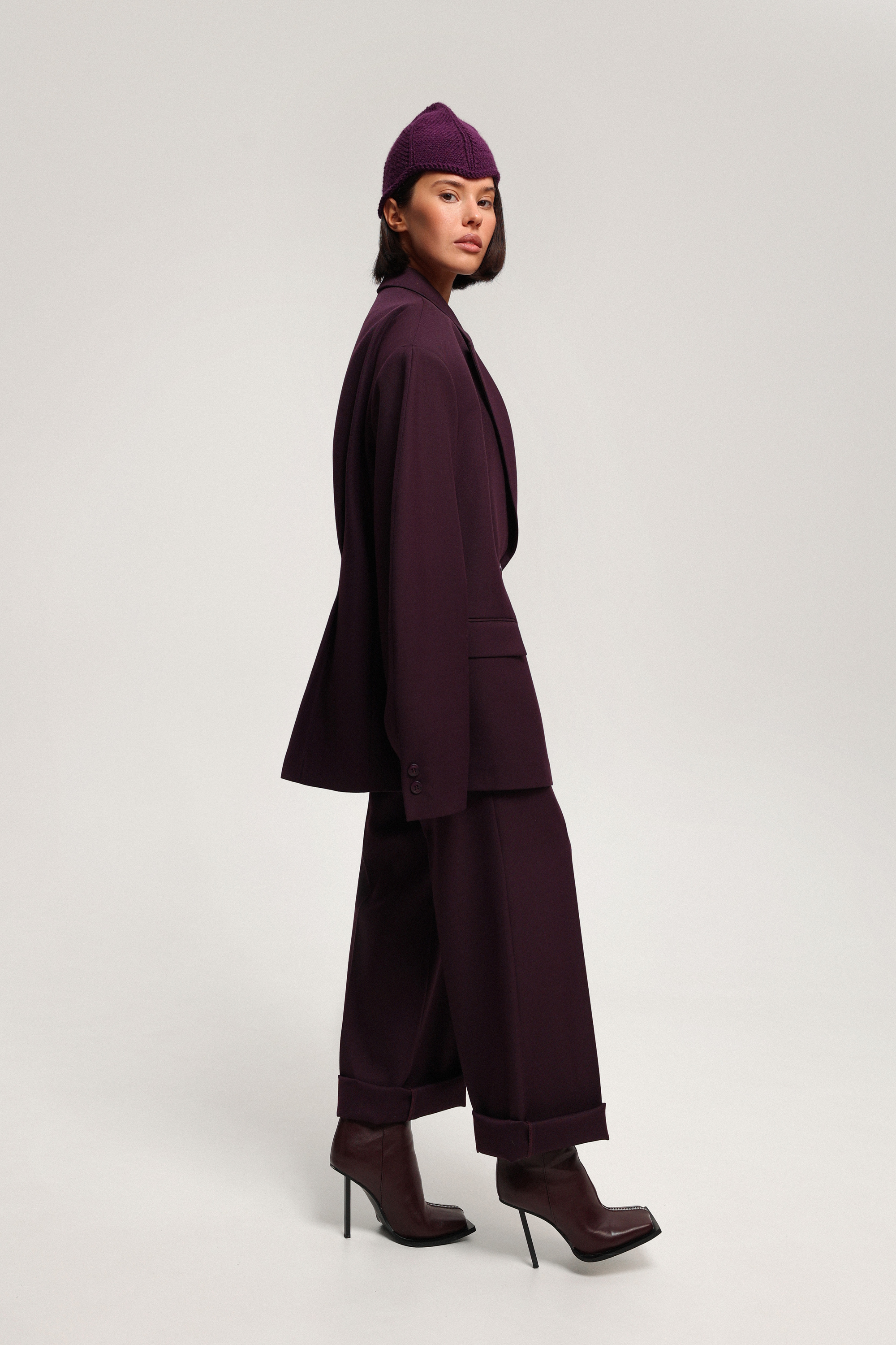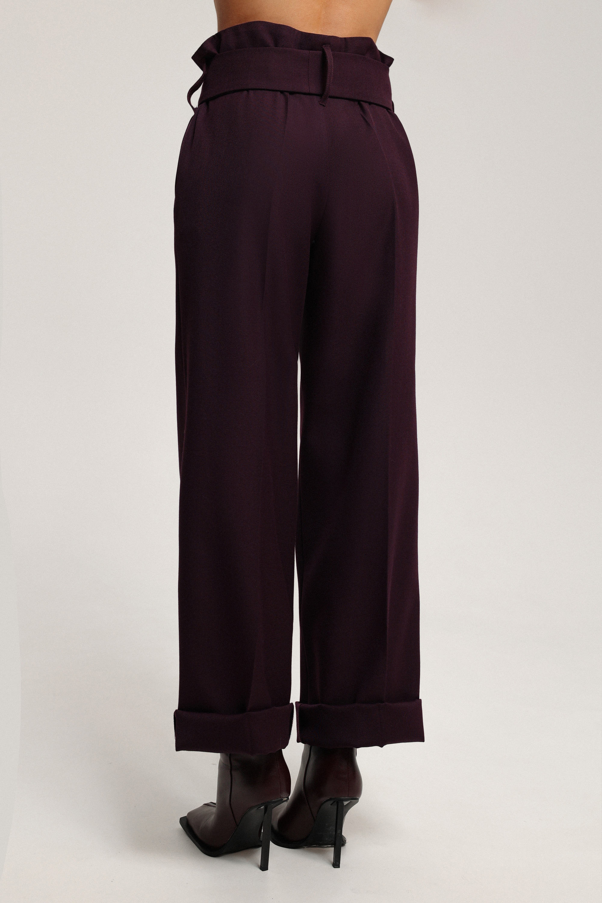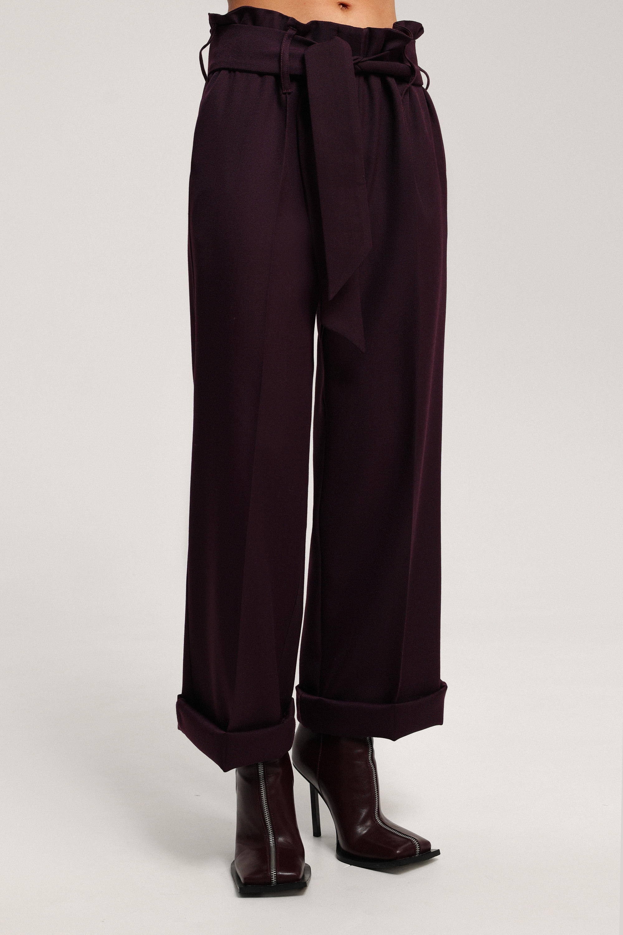 Брюки с посадкой на бёдрах и с низкой линией сидения, позволяющей подтянуть модель выше — к талии. Широкие шлёвки и пояс подчёркивают посадку, а возможность подвернуть низ добавляет образу выразительный акцент.