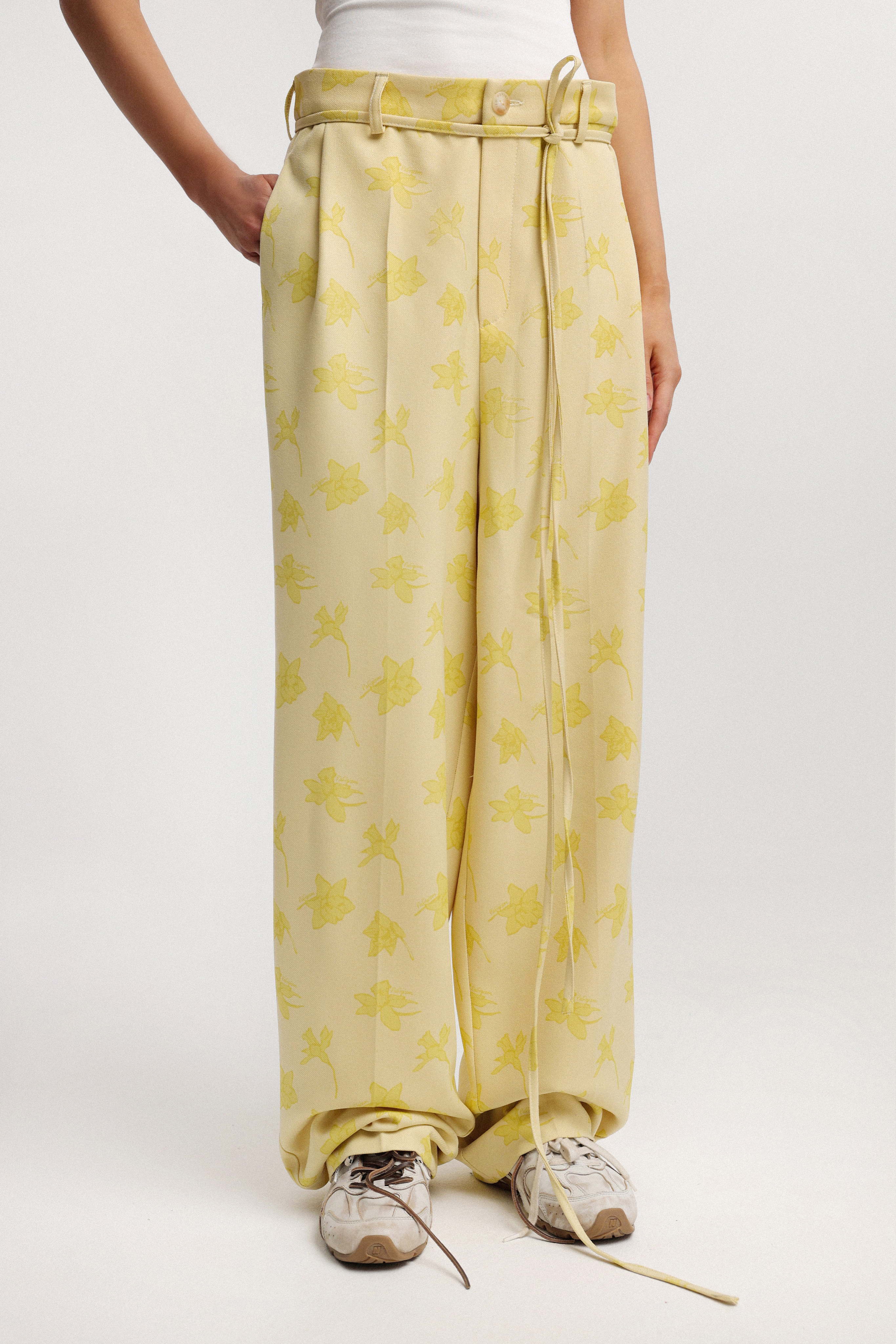 Брюки с высокой посадкой из классической костюмной ткани с чёткими стрелками. В комплекте — тонкий пояс-шнурок для регулировки посадки и дополнительного комфорта. Элегантная и практичная модель для повседневных образов.