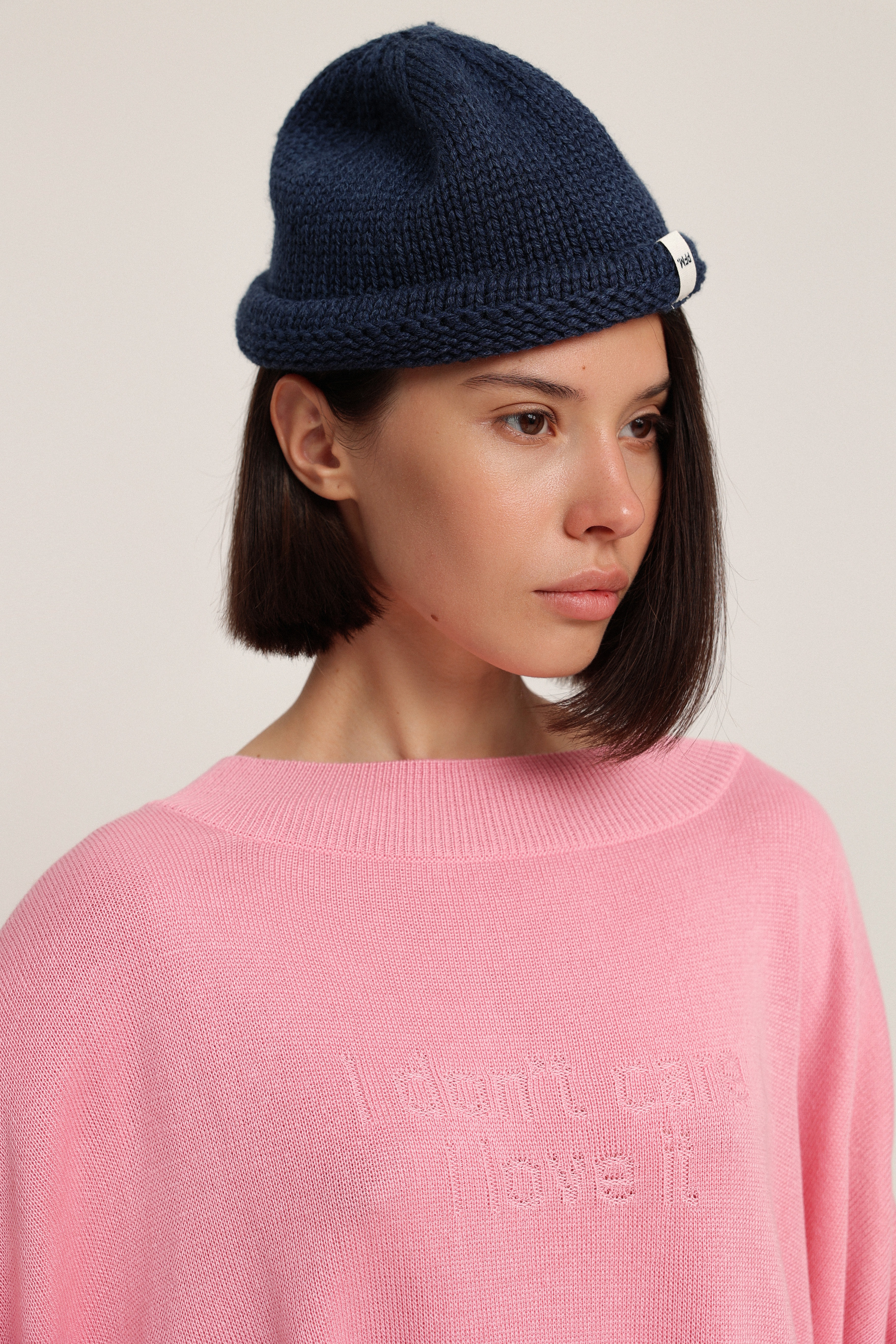 Тонкий вязаный оверсайз джемпер с широкими завязками в районе талии. На груди расположена фактурная надпись "I dont"care" в цвет изделия. На спине - фактурный логотип PFM в цвет джемпера.