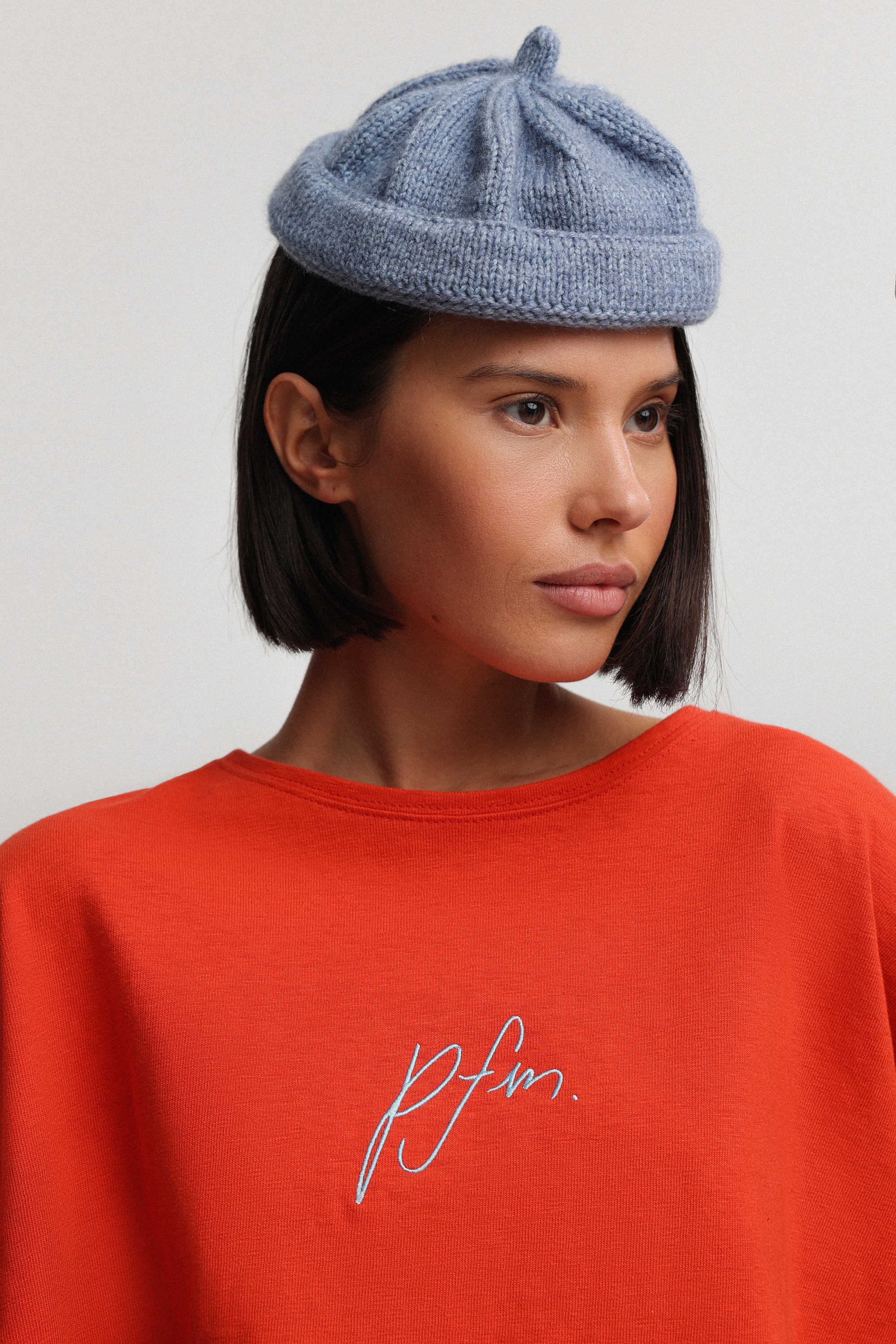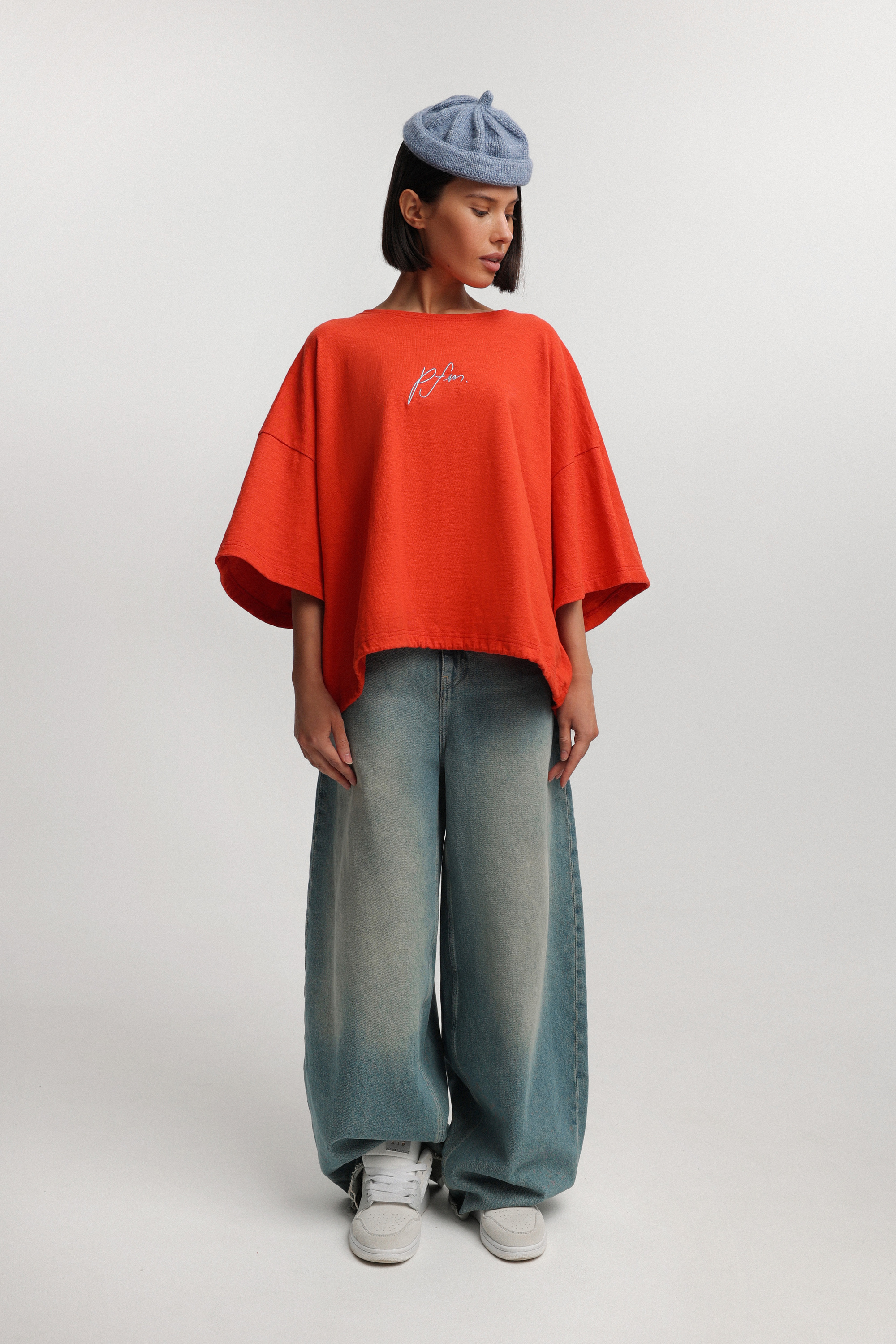 Футболка из плотного хлопка с оранжевой кулиской и контрастной вышивкой PFM в ярко-голубом цвете. Отлётная кокетка на спинке добавляет объёма, а широкая горловина позволяет носить модель, спуская её на плечо.