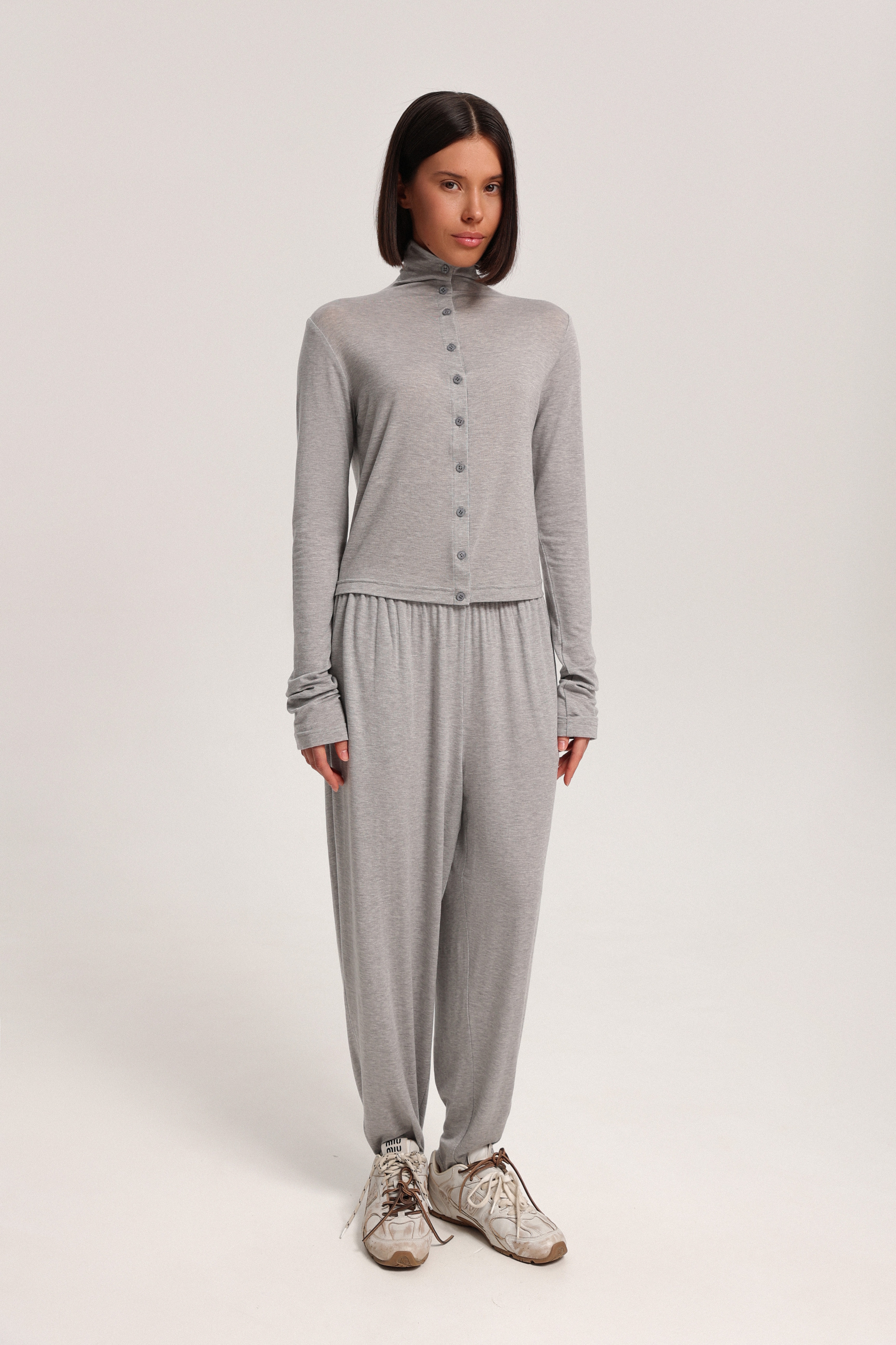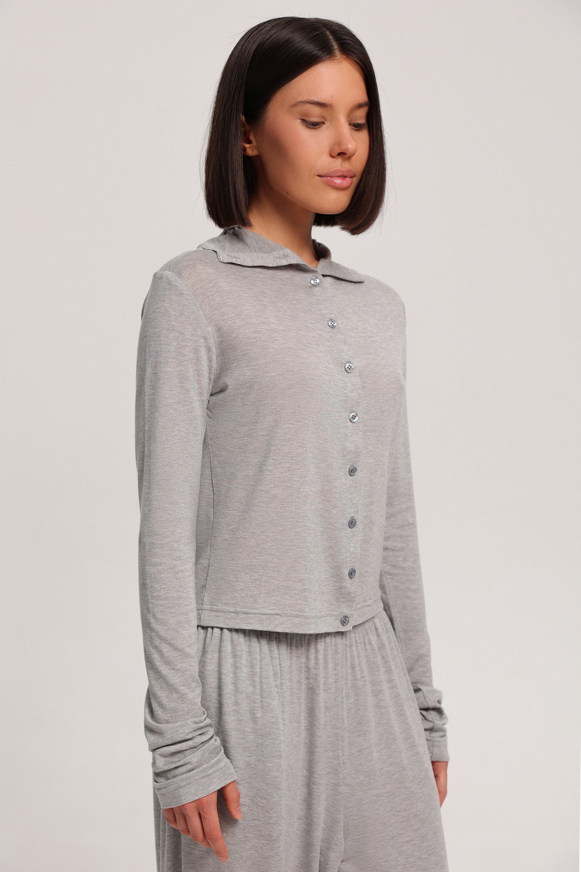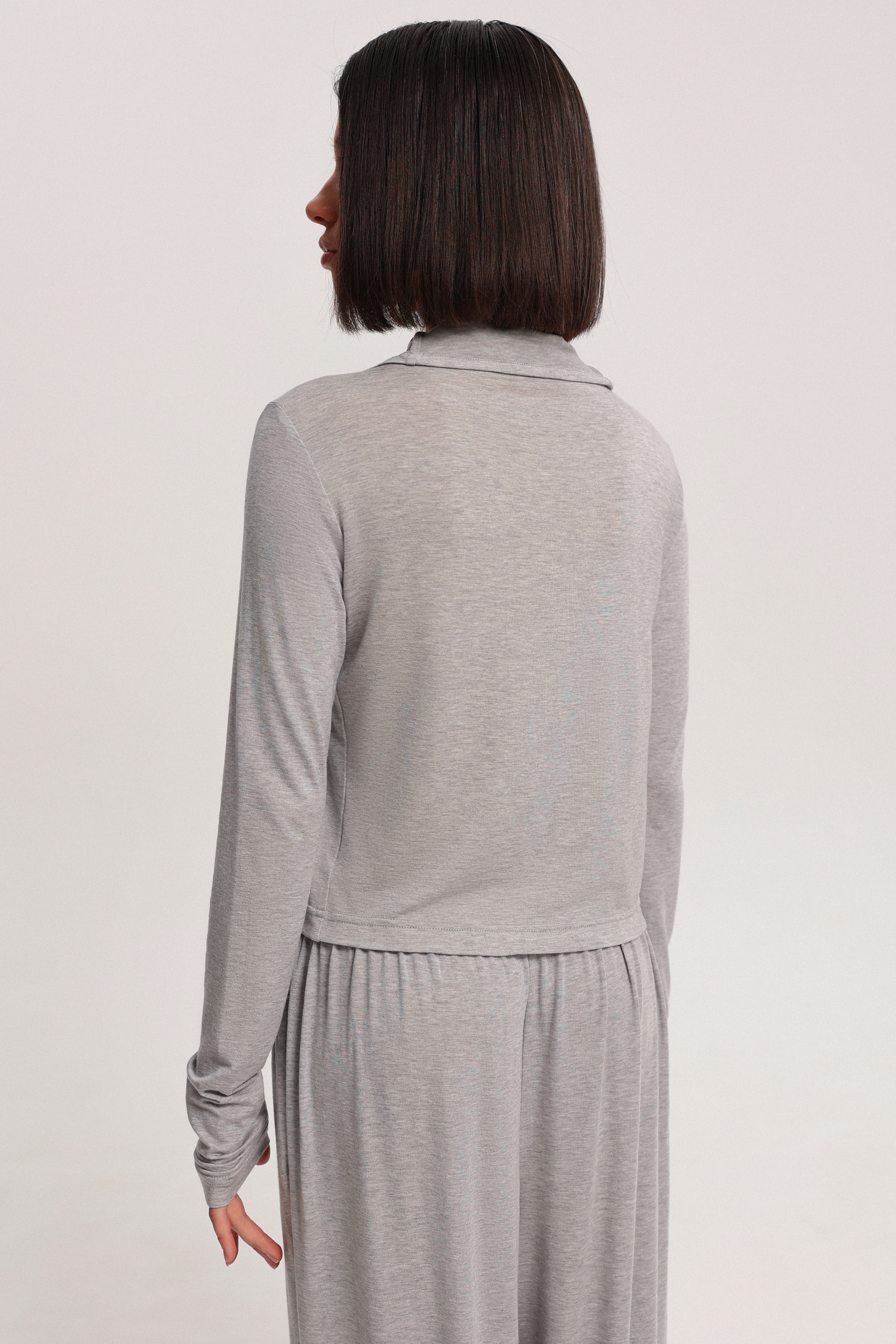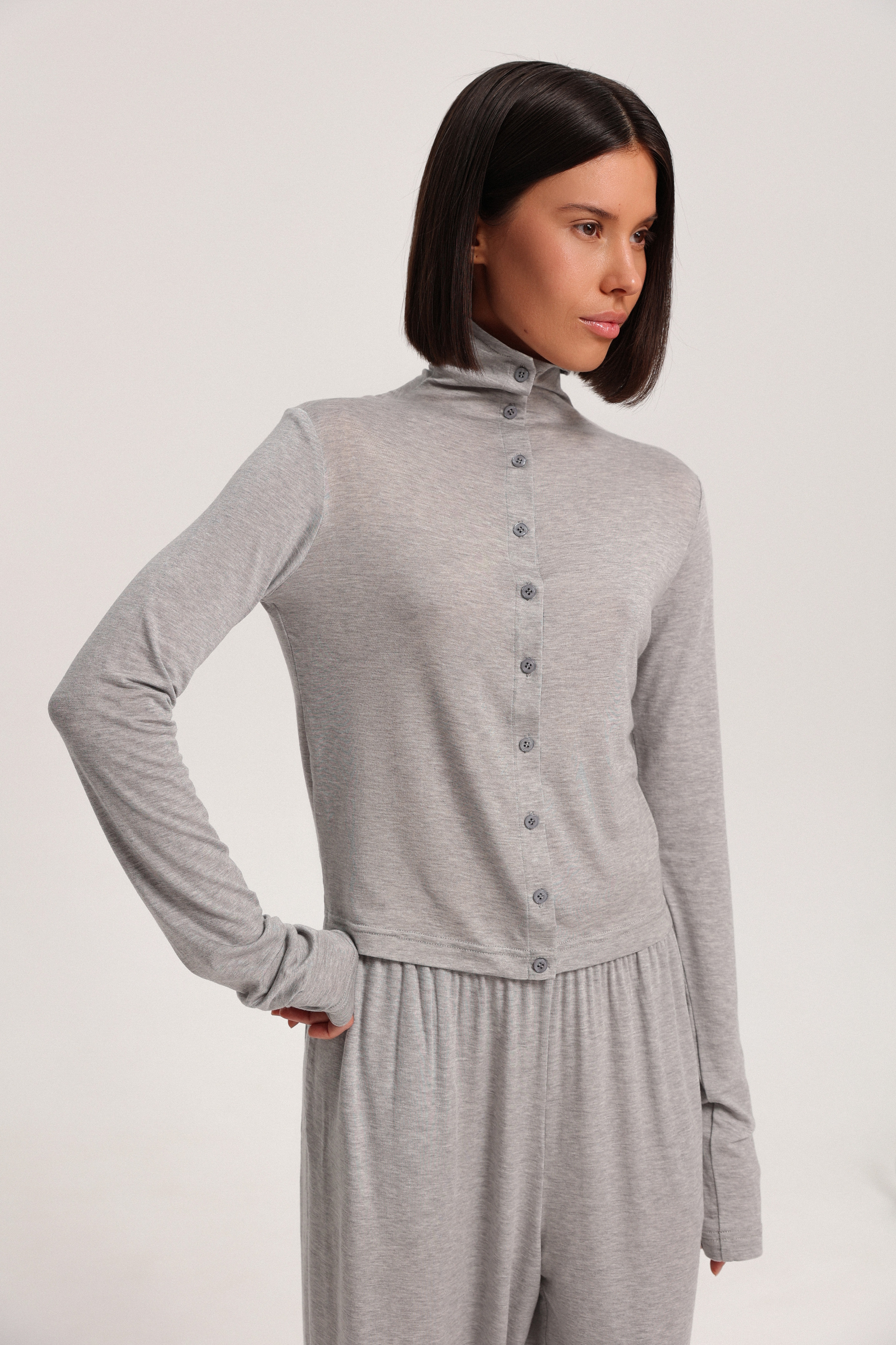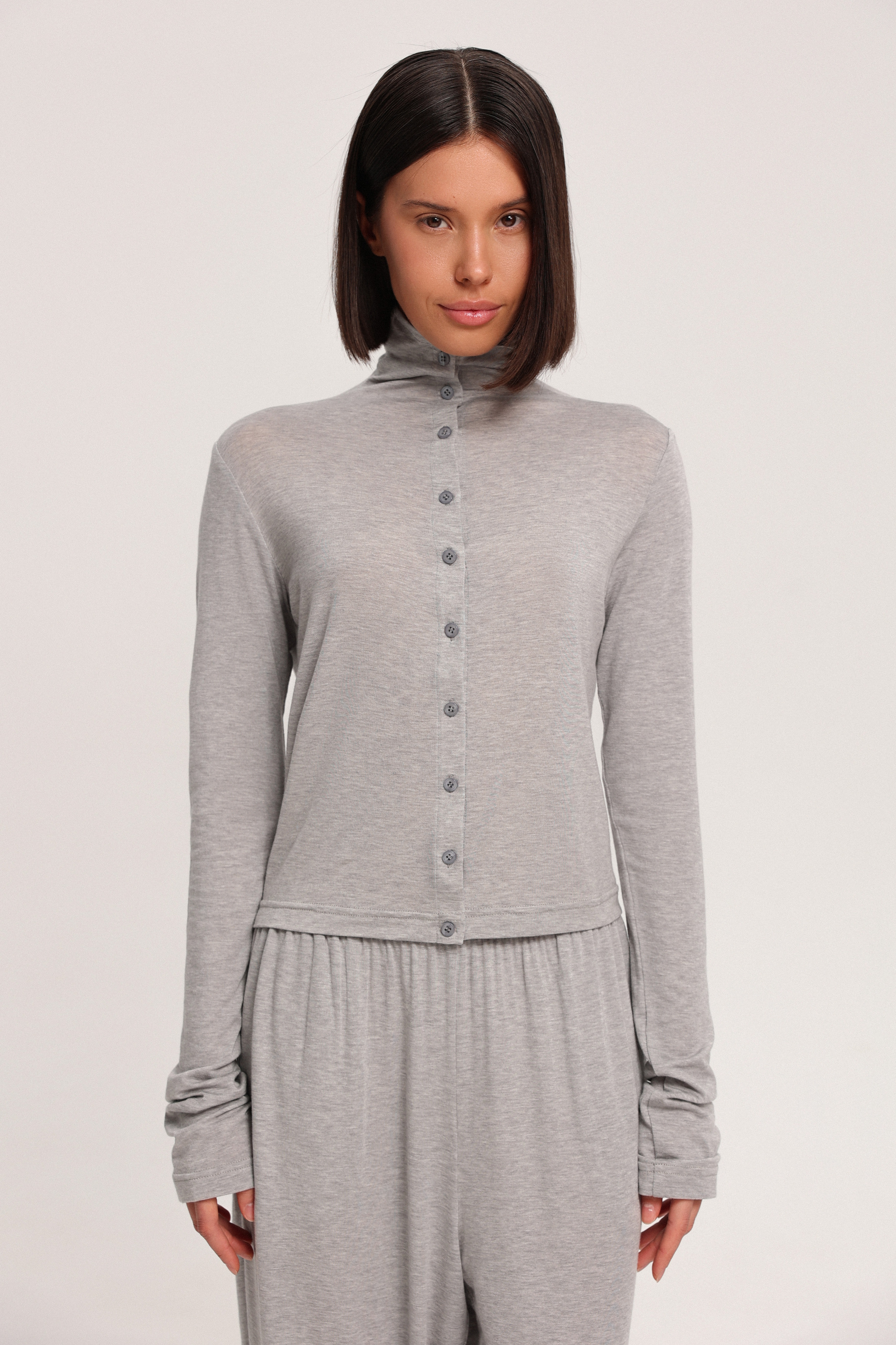 Кардиган с воротником-стойкой на пуговицах. Модель выполнена из мягкой, струящейся ткани, приятной на ощупь, легко вписывается в повседневные образы. Идеально сочетается с трико из тонкого трикотажа