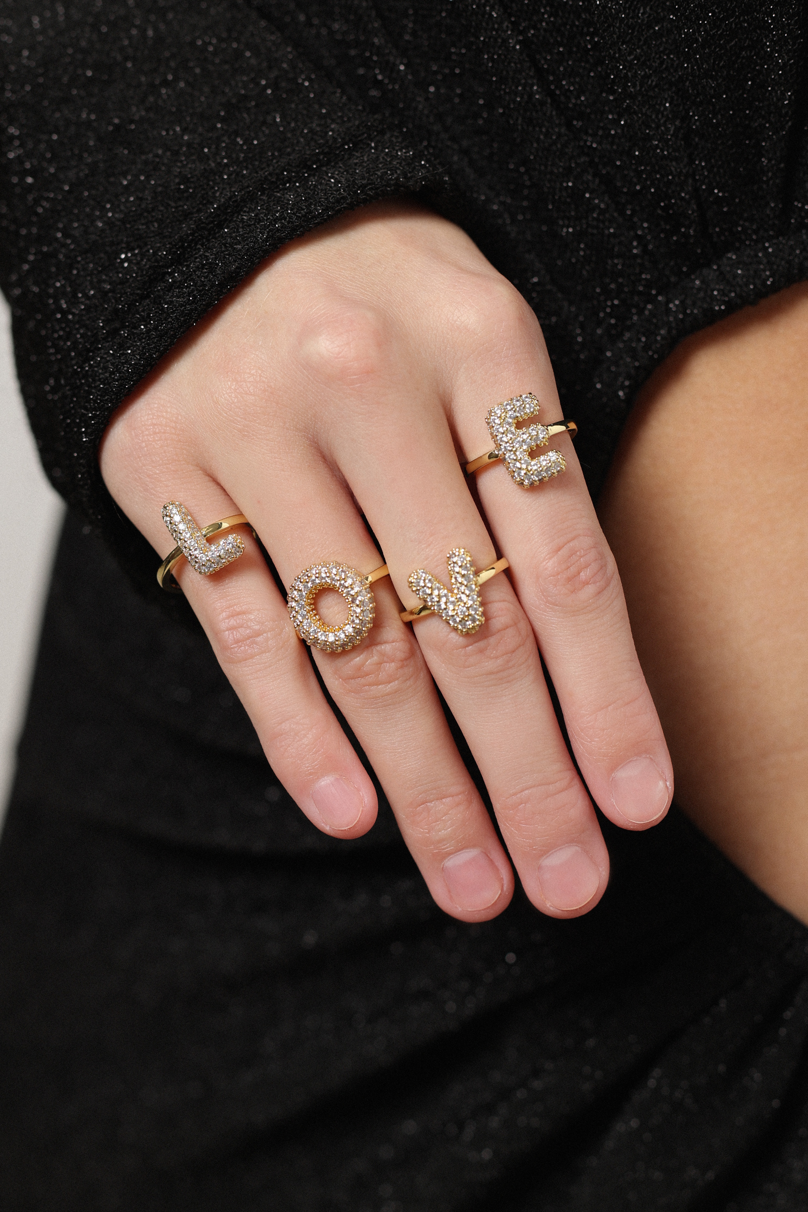 Коллекция колец, где каждая буква - самостоятельный элемент, а вместе они складываются в слово с настроением. Сдержанный блеск камней и чёткая форма превращают минимализм в идею, которую хочется носить.