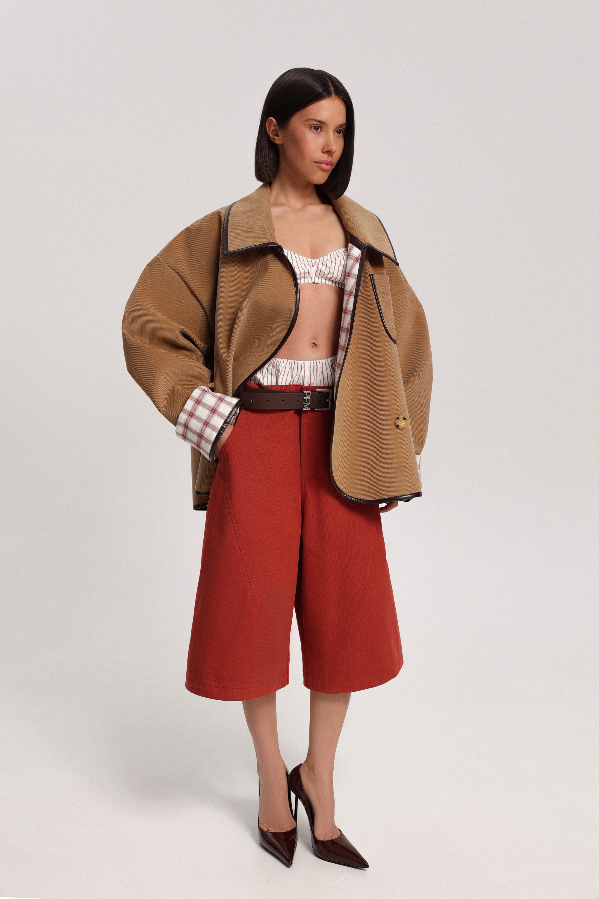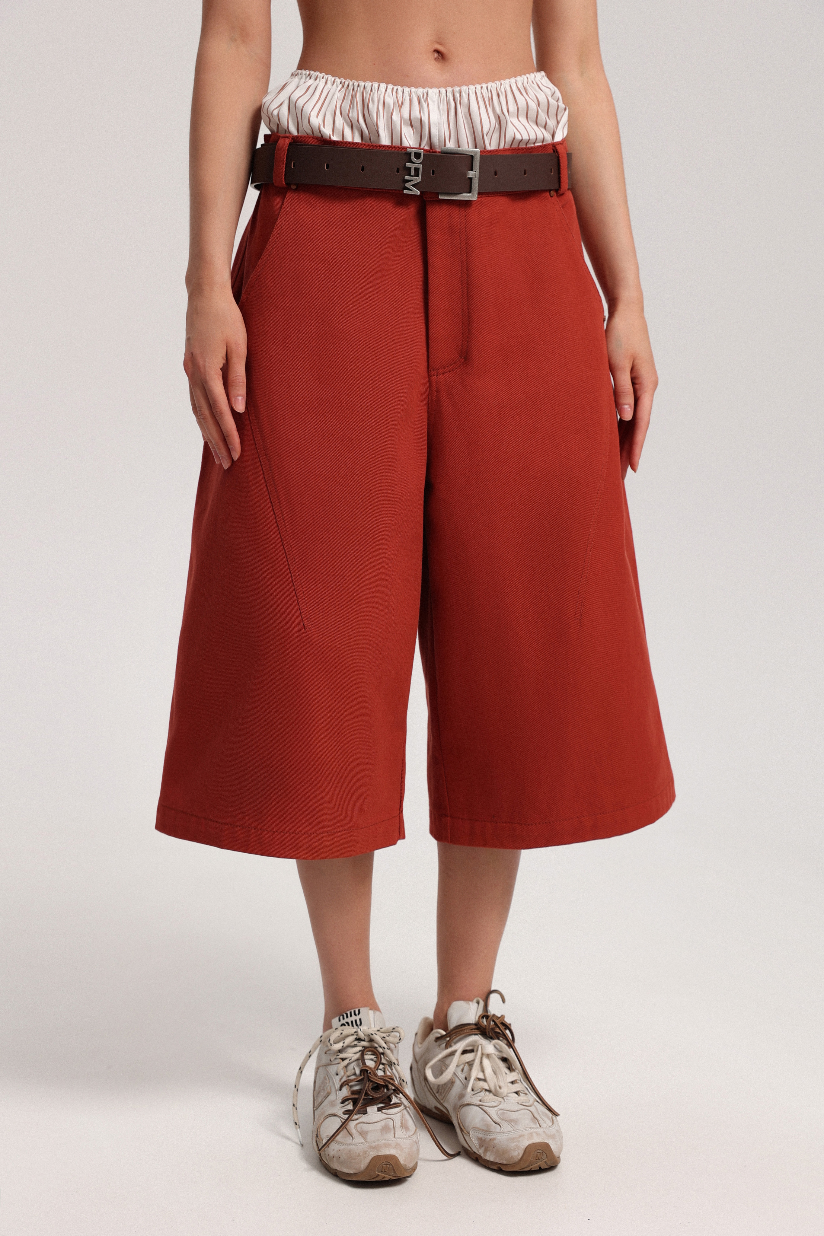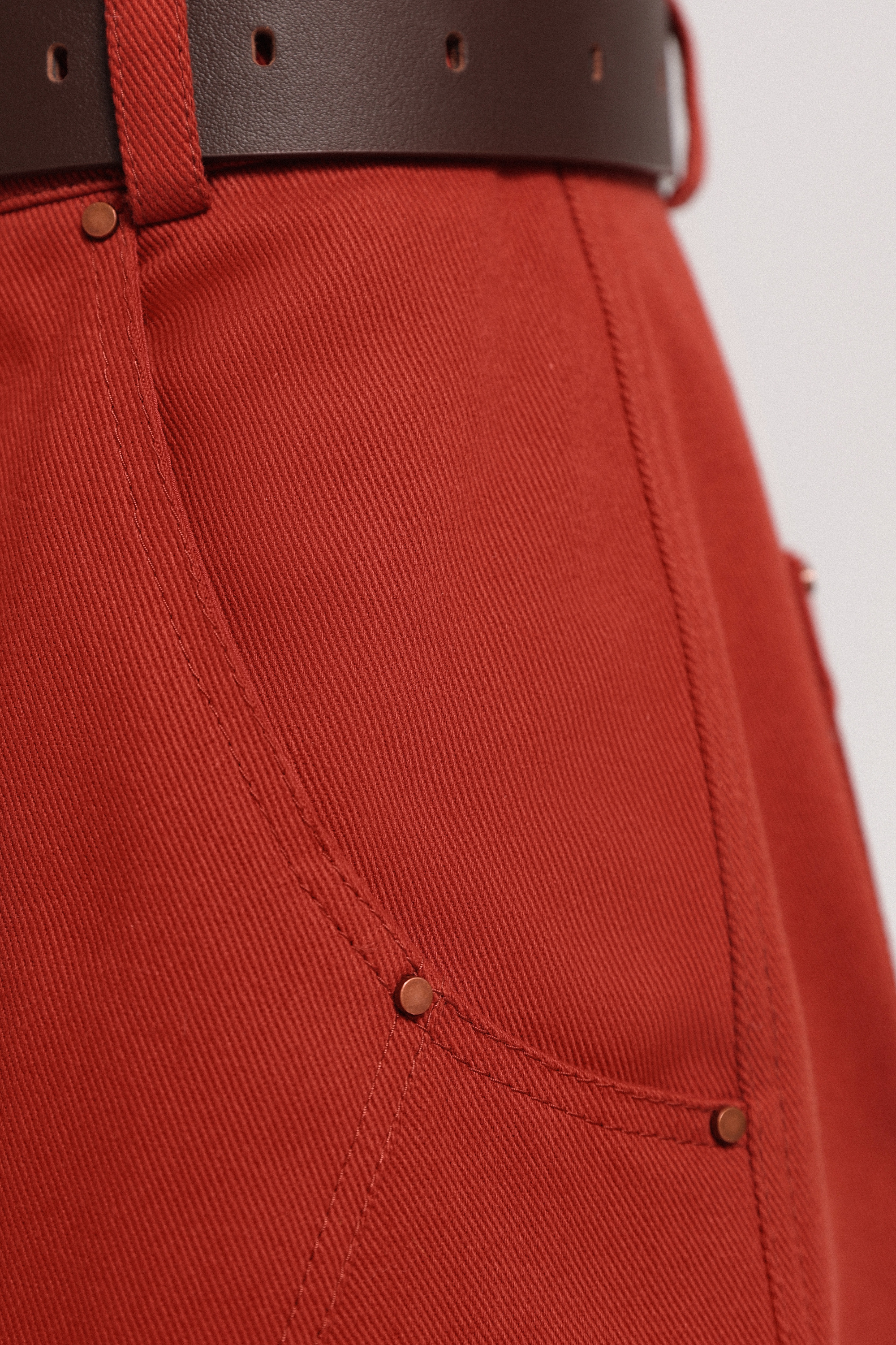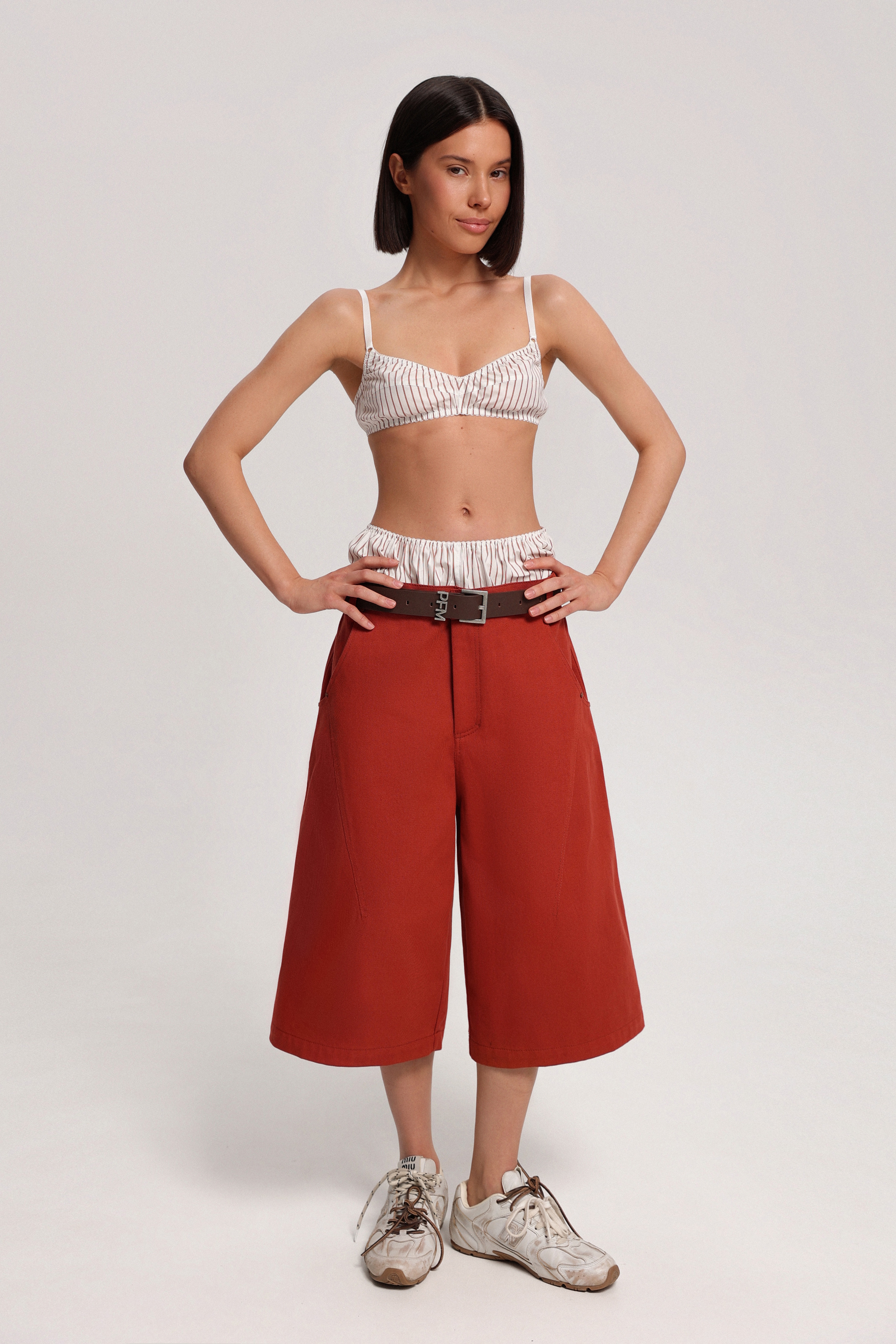 Кюлоты из денима с посадкой на бёдрах и расширенной линией карманов, которая становится выразительной деталью конструкции. Модель легко дополняется ремнём, позволяя менять характер образа.