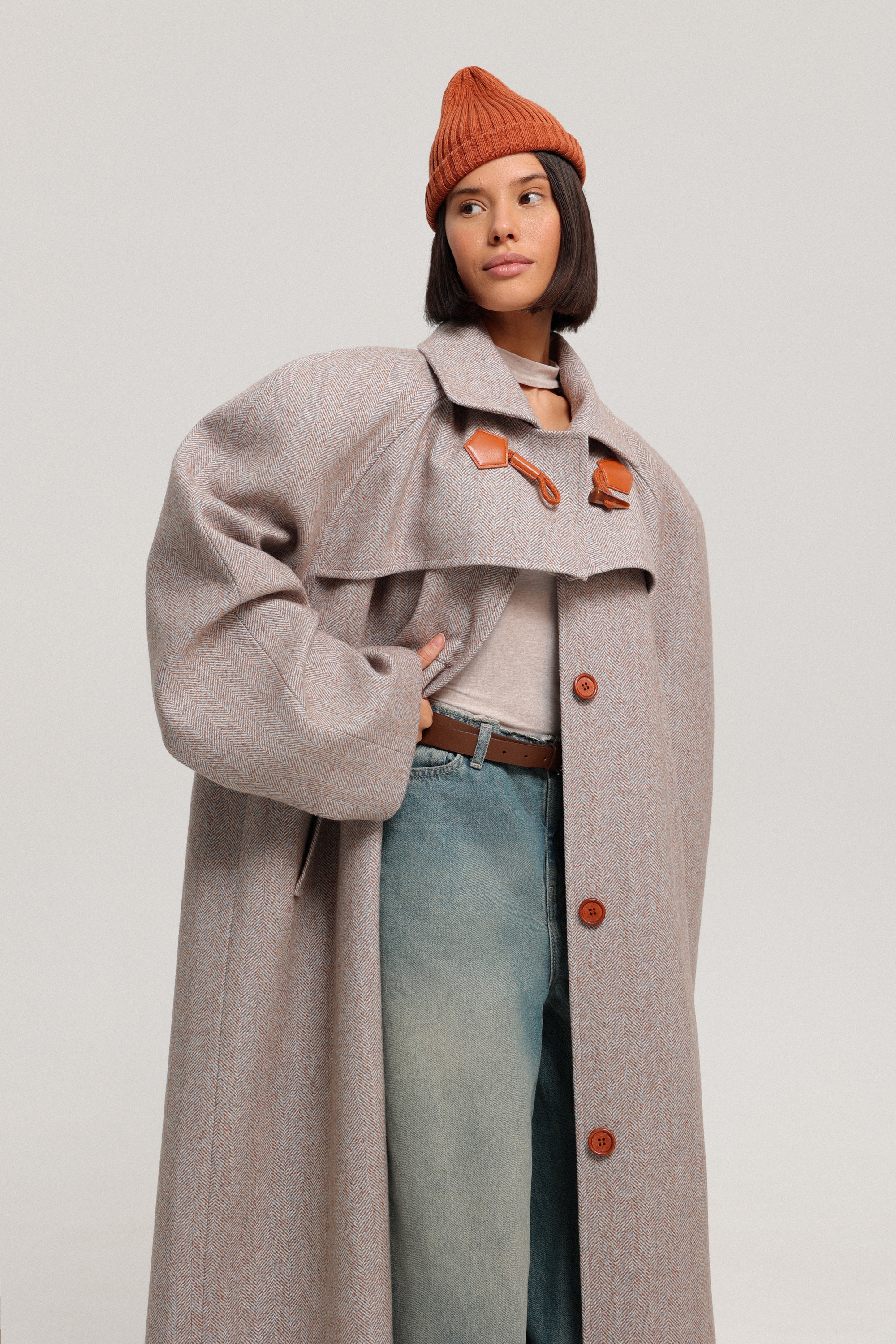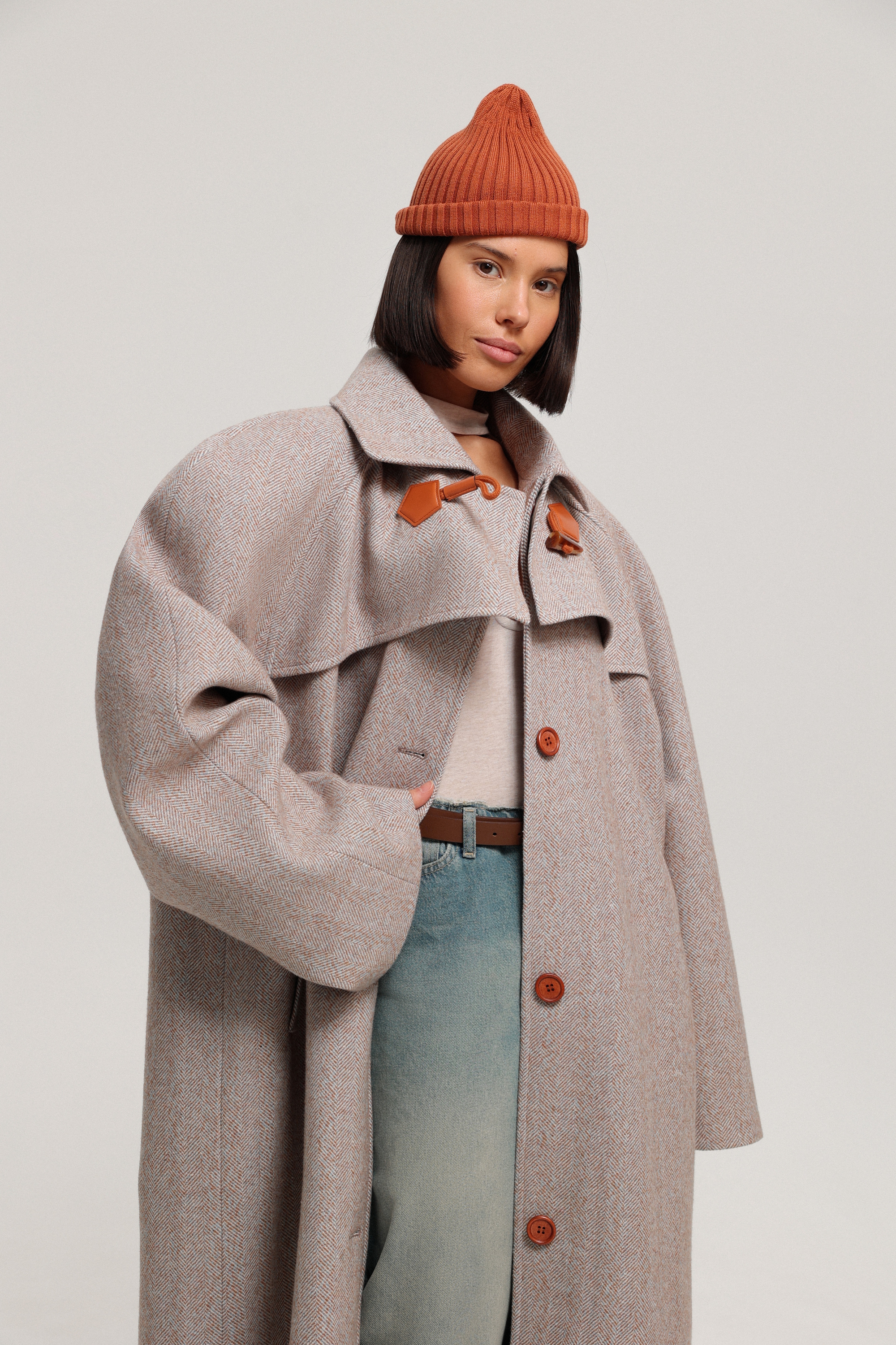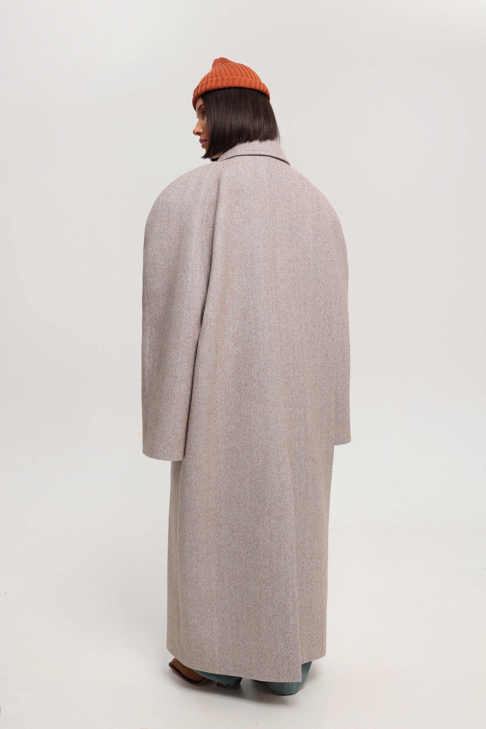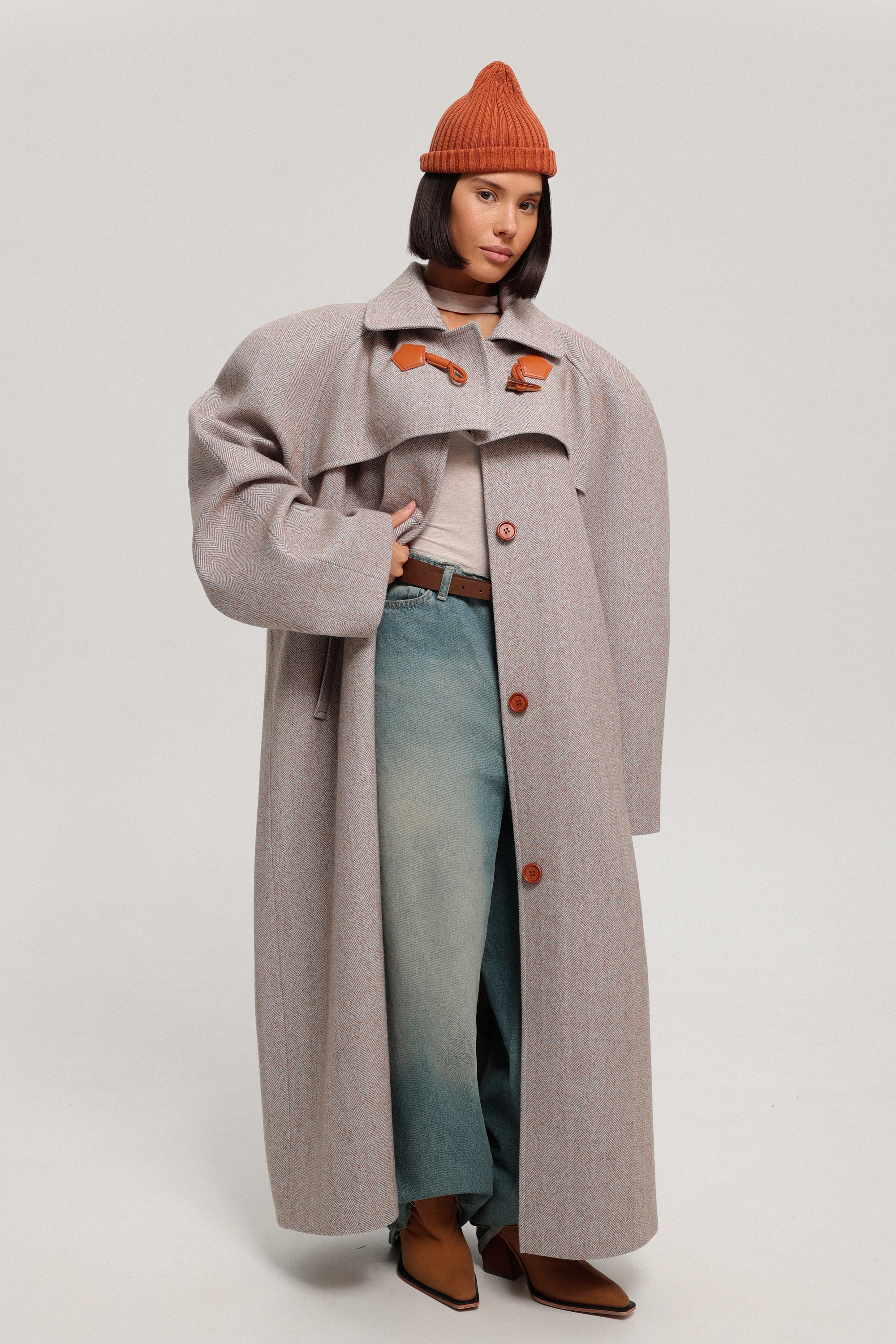 Пальто реглан длины миди на пуговицах по всей длине изделия. Несъёмные подплечники формируют выразительный О-силуэт в верхней части. Застёжка на клевант по кокетке и воротник, который можно поднять, добавляют образу характер. Пояс в комплекте позволяет приталить силуэт, а функциональные карманы завершают образ.
