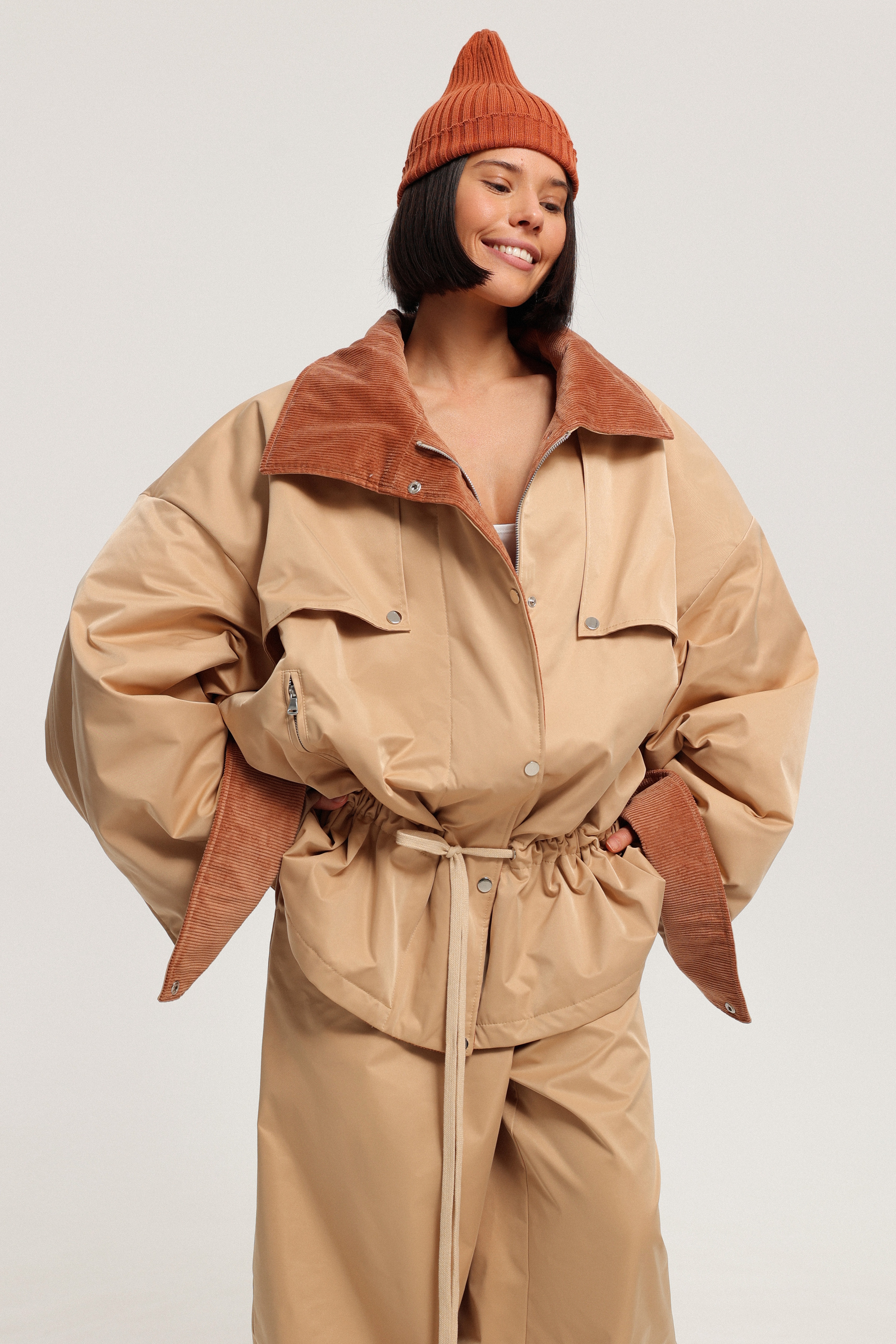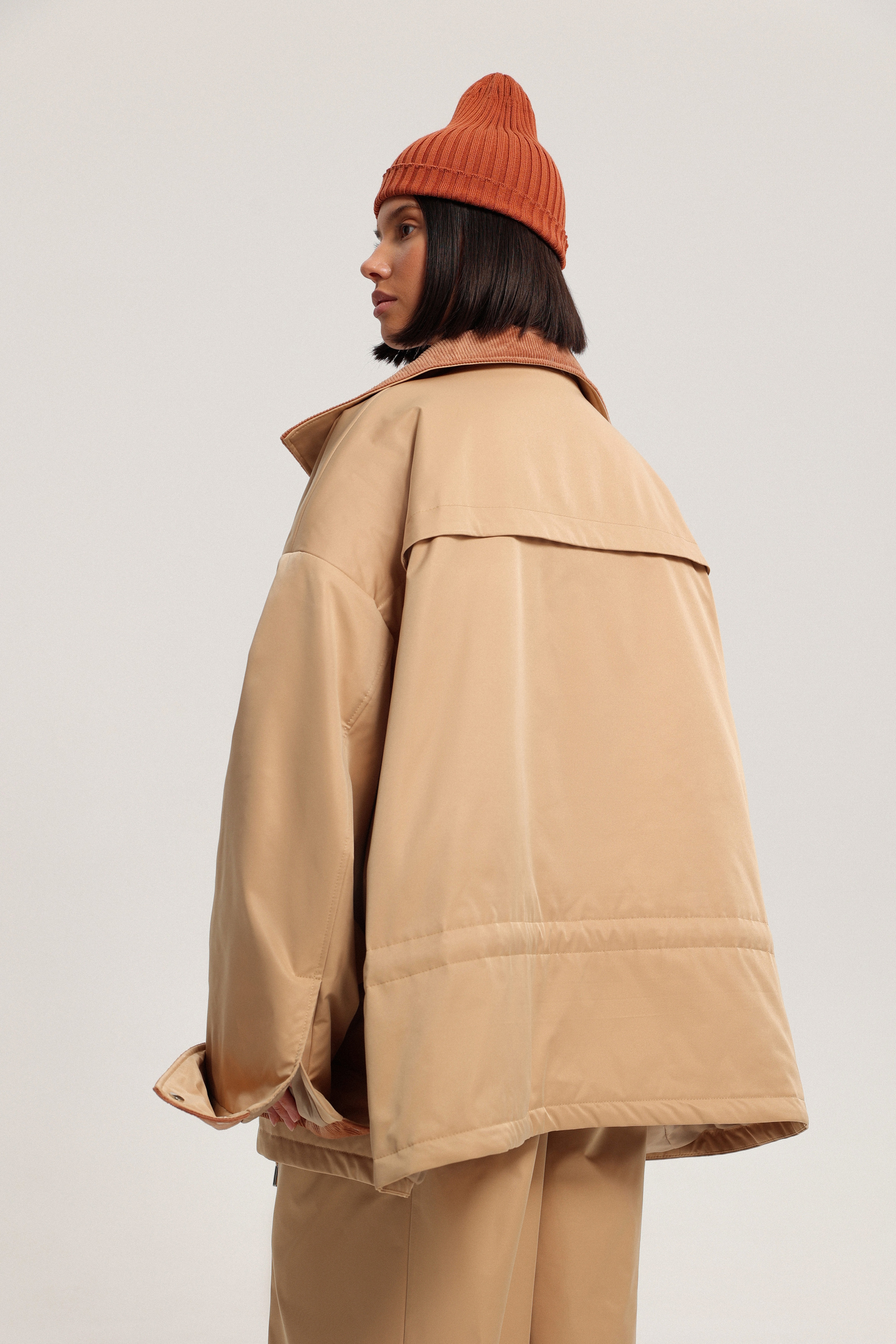 Парка на тонком утеплителе из шелковистой гладкой плащёвки. Манжеты на кнопках и отделка из мягкого хлопкового вельвета внутри рукавов, по планке и воротнику добавляют комфорта. Рукава можно отвернуть, регулируя длину. Парка застёгивается на молнию и кнопки, дополнена отлётными кокетками спереди, боковыми карманами на молнии и кулиской со шнурком на уровне бёдер.