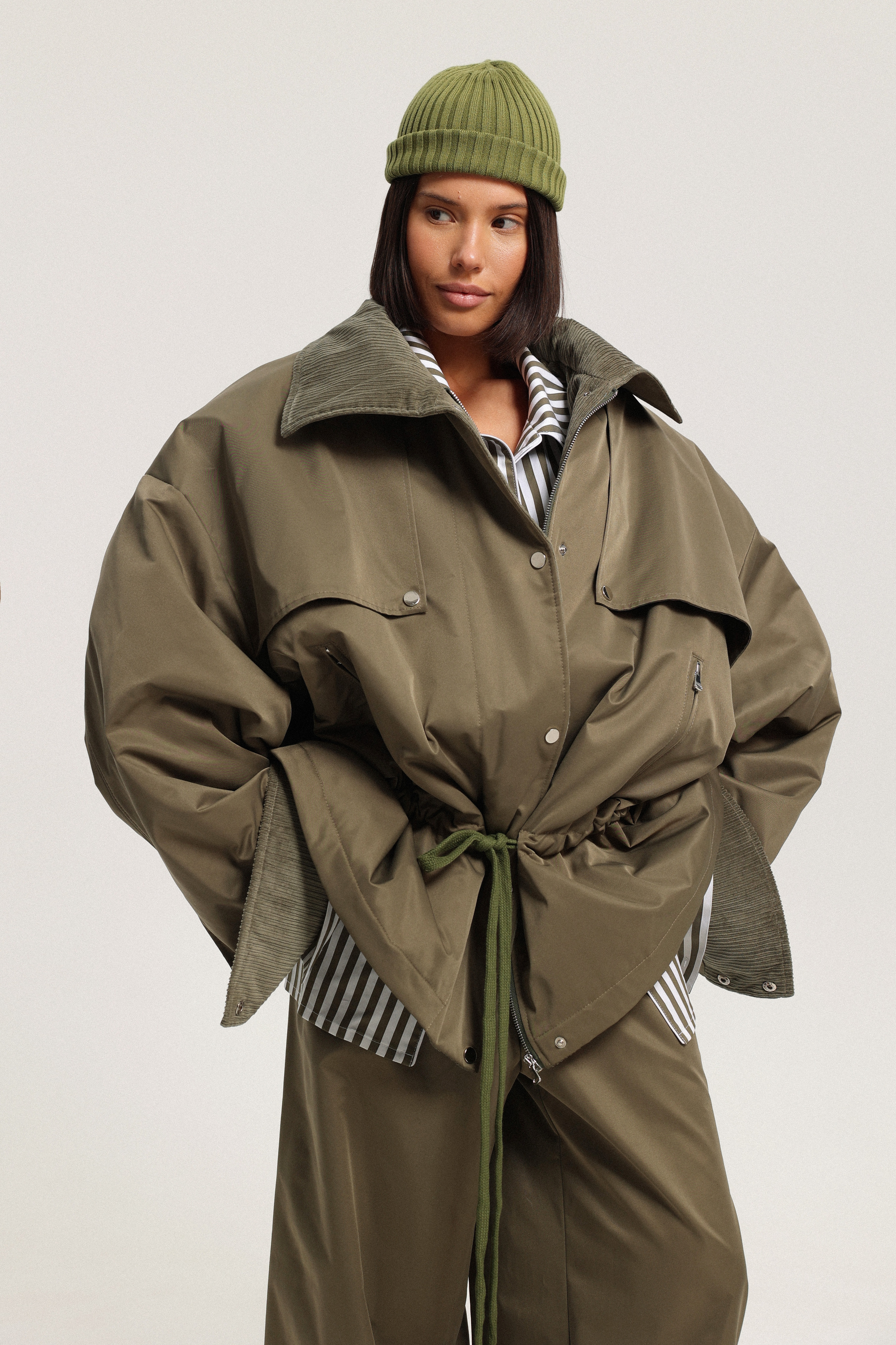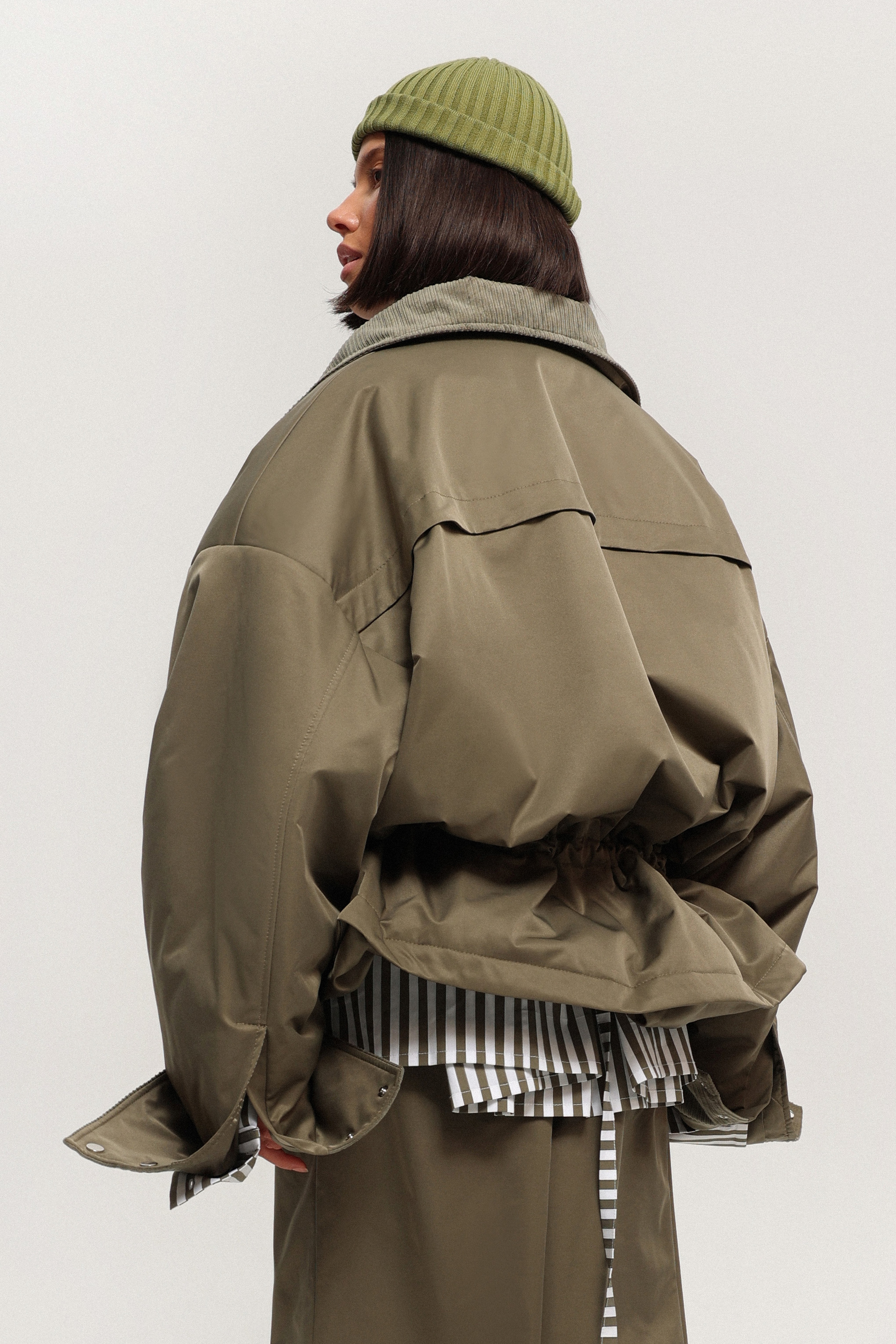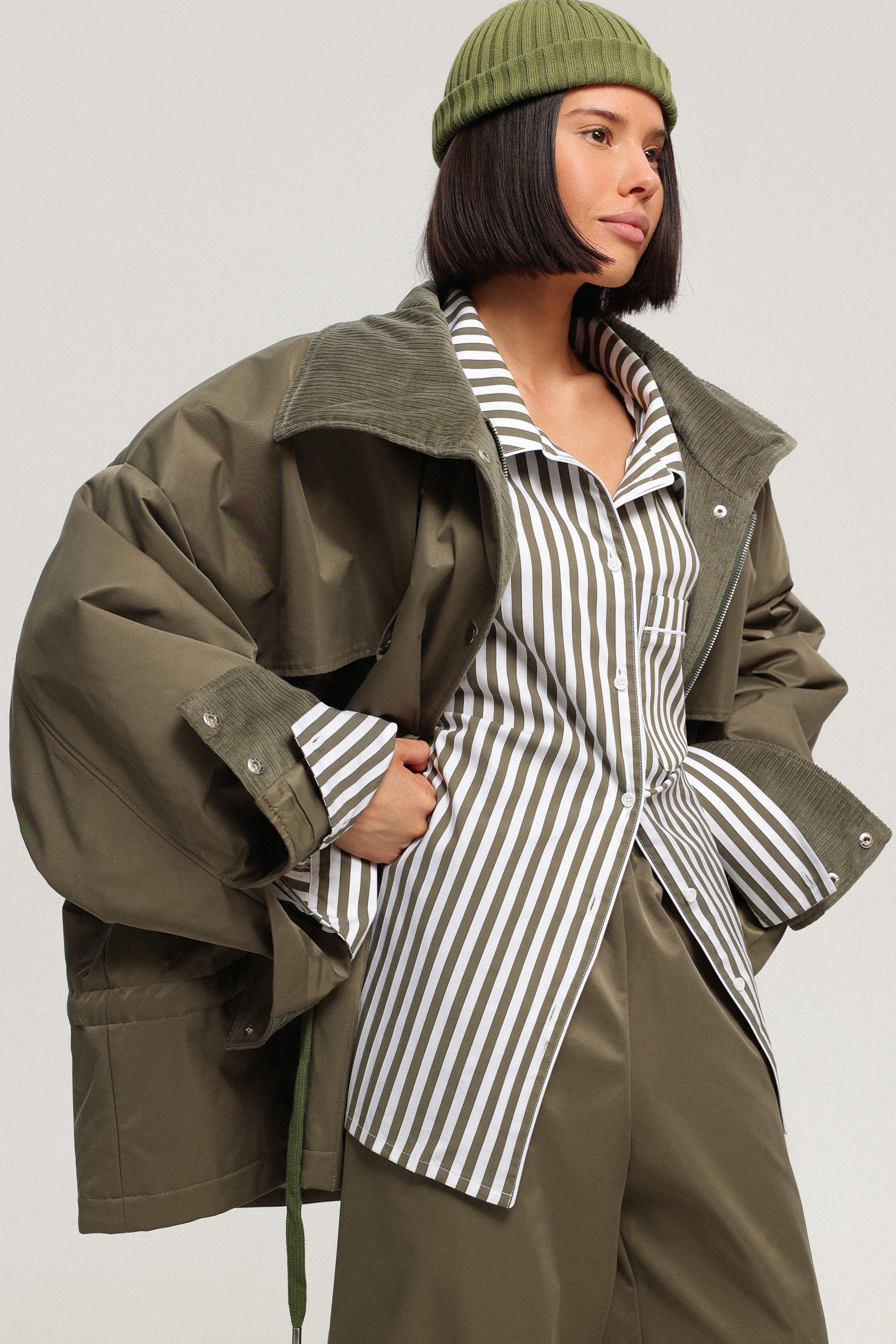 Парка на тонком утеплителе из шелковистой гладкой плащёвки. Манжеты на кнопках и отделка из мягкого хлопкового вельвета внутри рукавов, по планке и воротнику добавляют комфорта. Рукава можно отвернуть, регулируя длину. Парка застёгивается на молнию и кнопки, дополнена отлётными кокетками спереди, боковыми карманами на молнии и кулиской со шнурком на уровне бёдер.