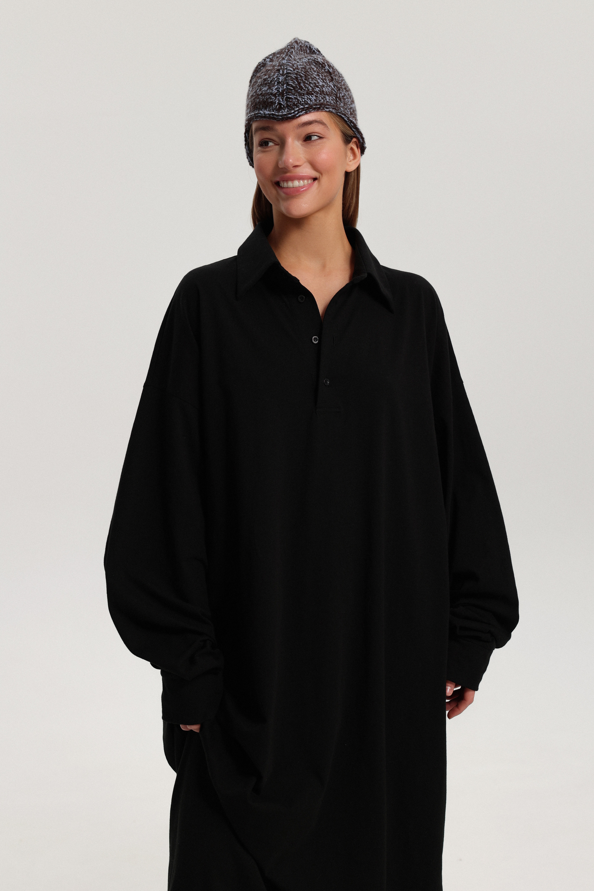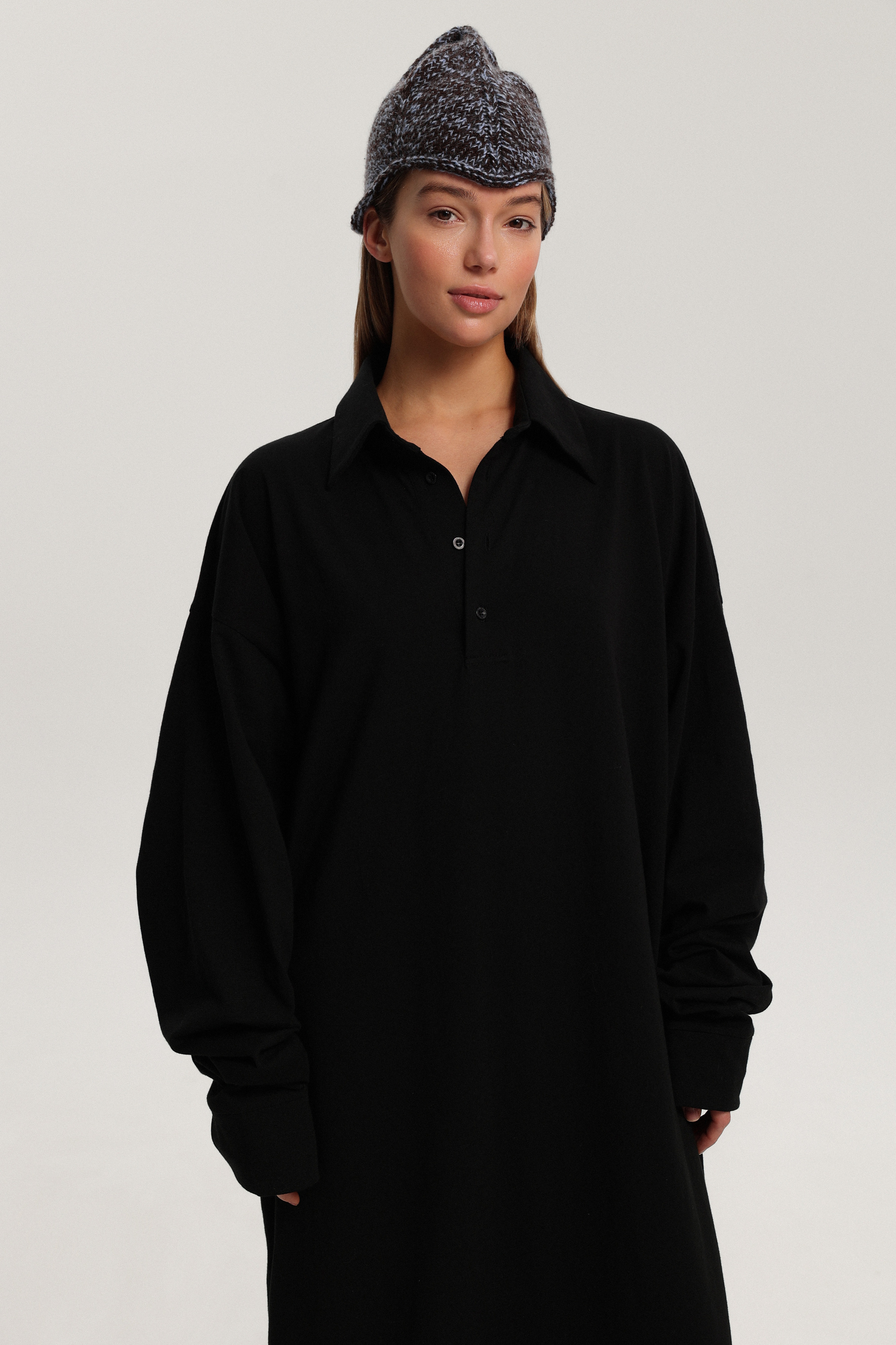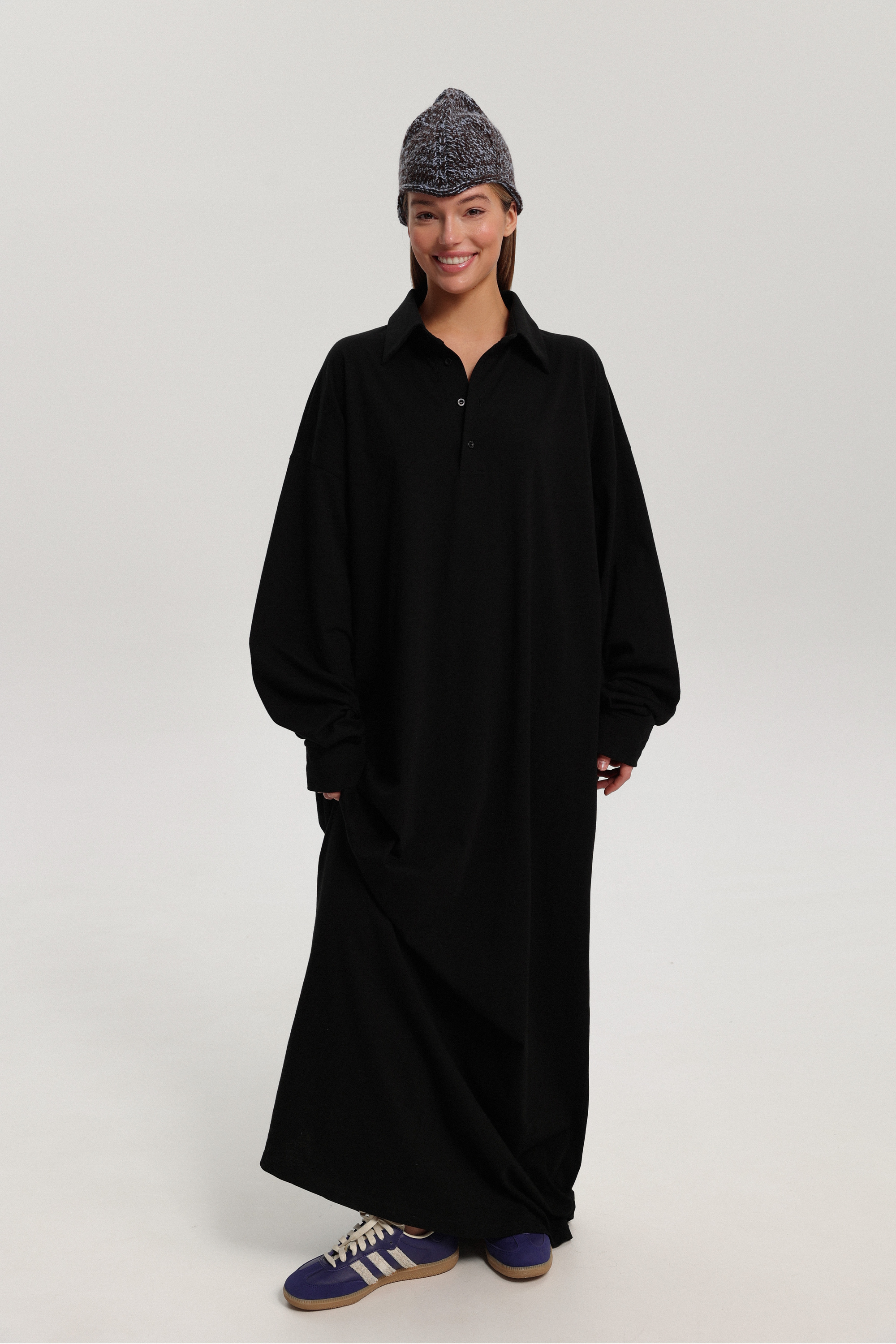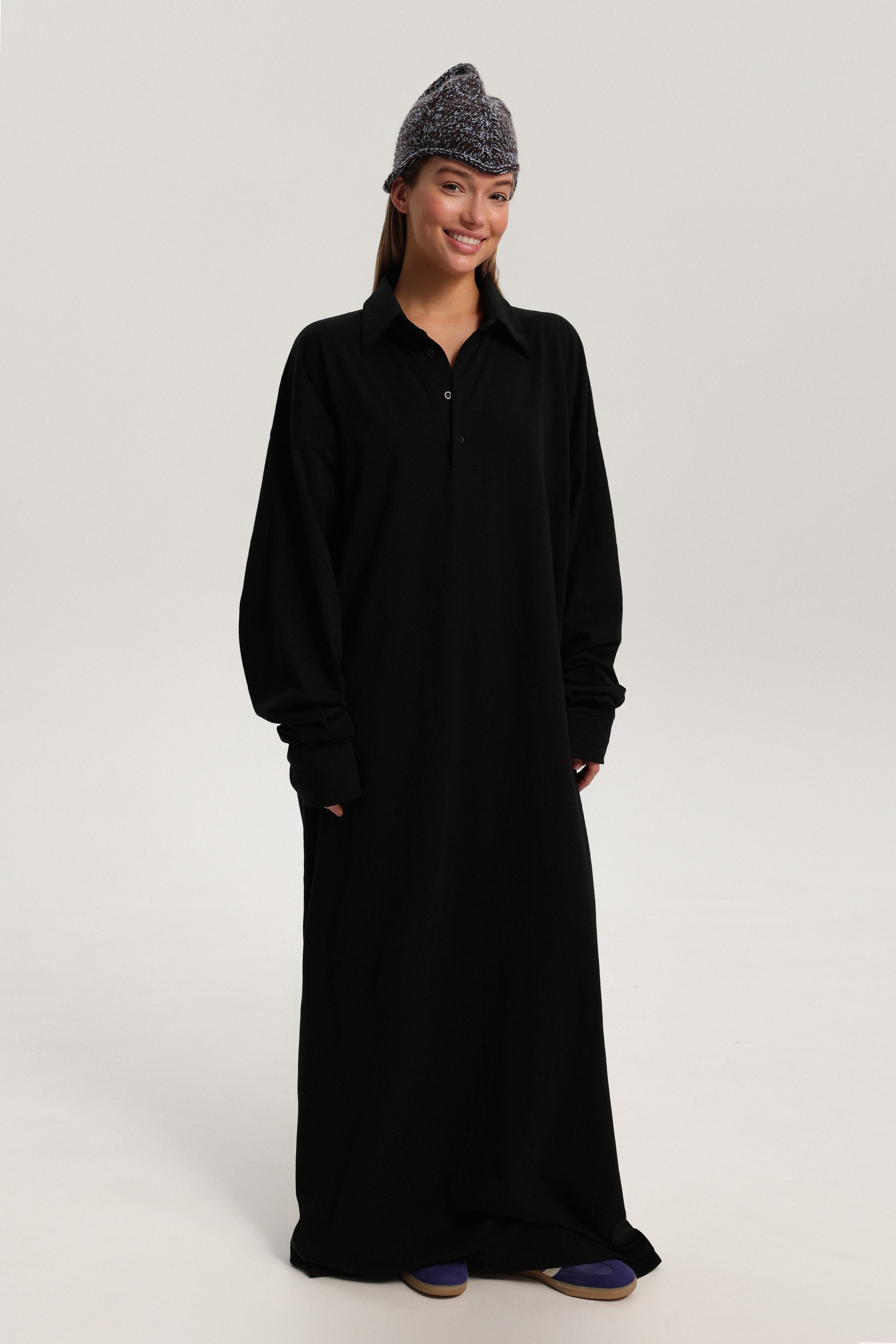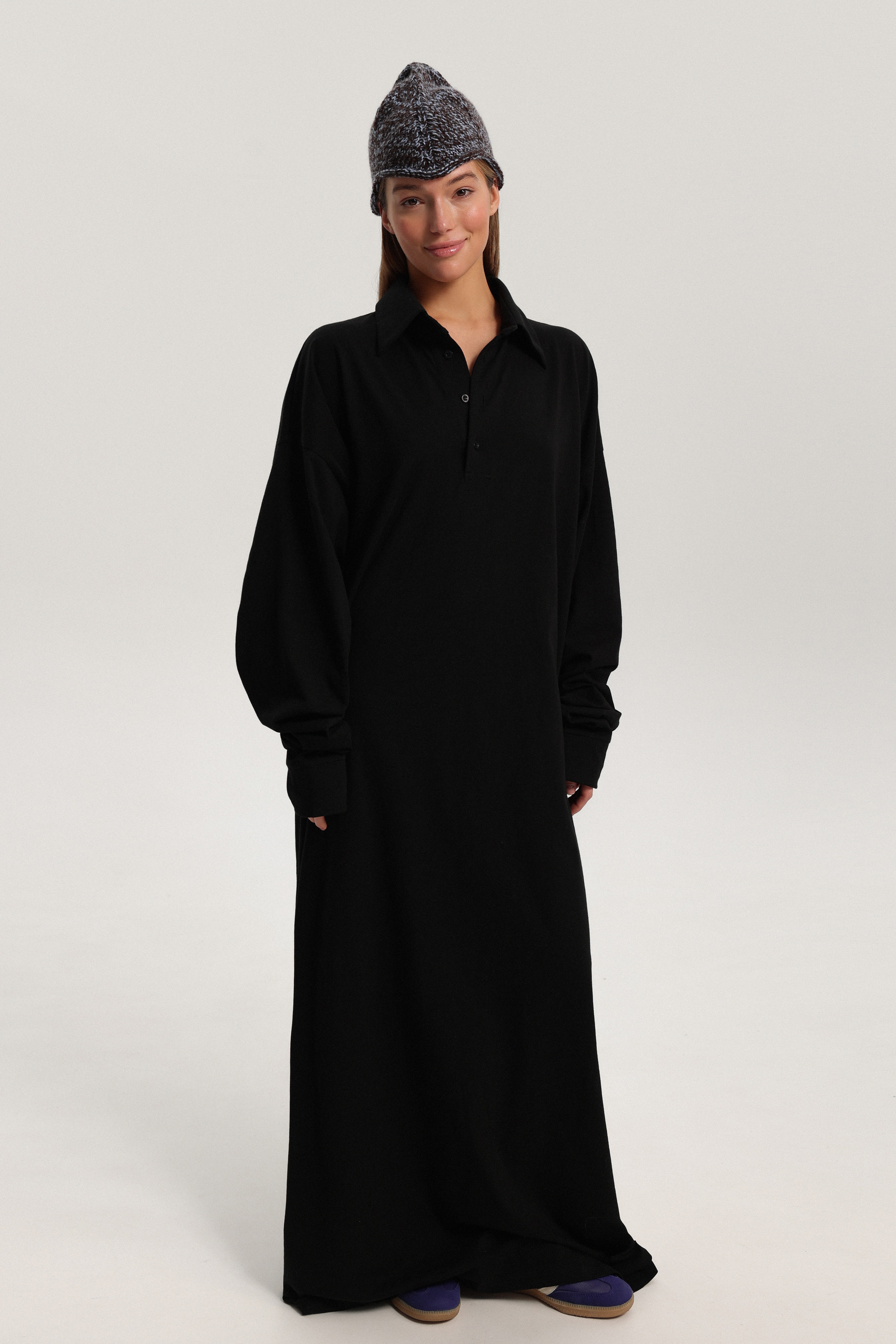 Платье-лонгслив длины макси с застёжкой поло и длинными рукавами. Лаконичная модель вытягивает силуэт и легко вписывается как в повседневные легкие образы, так и в сложные, создавая многослойность в сочетании с вязаным платьем-майка