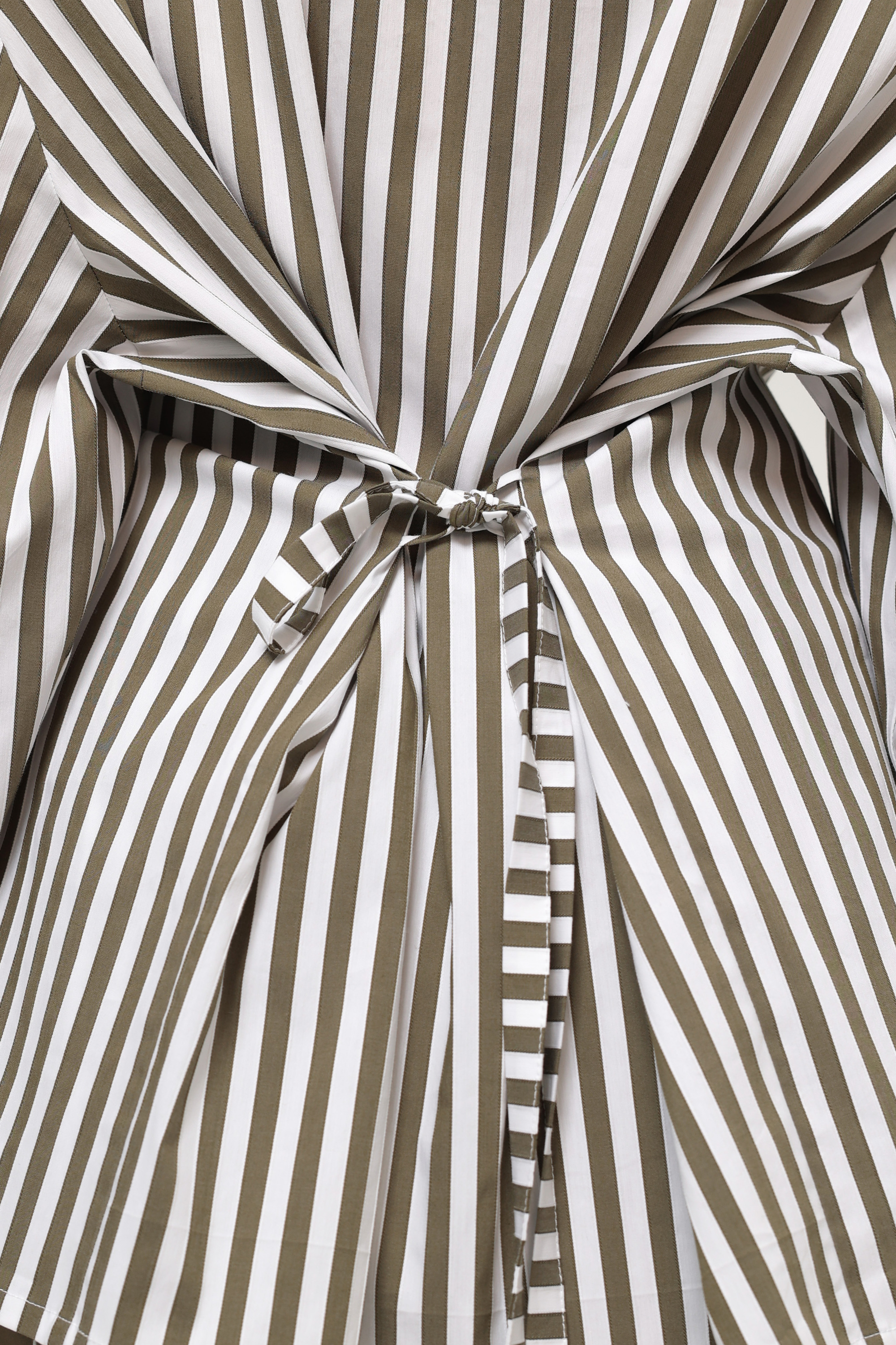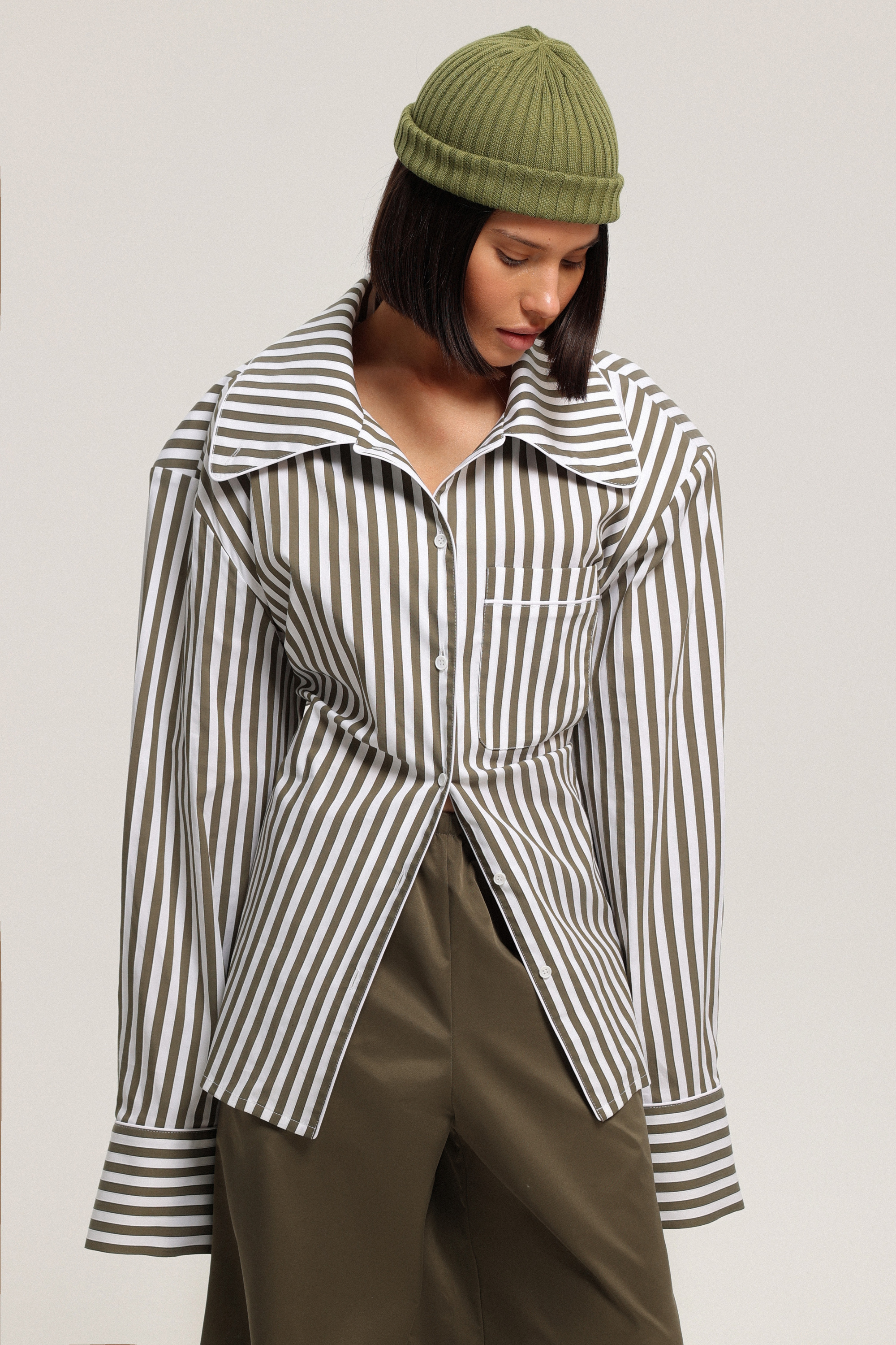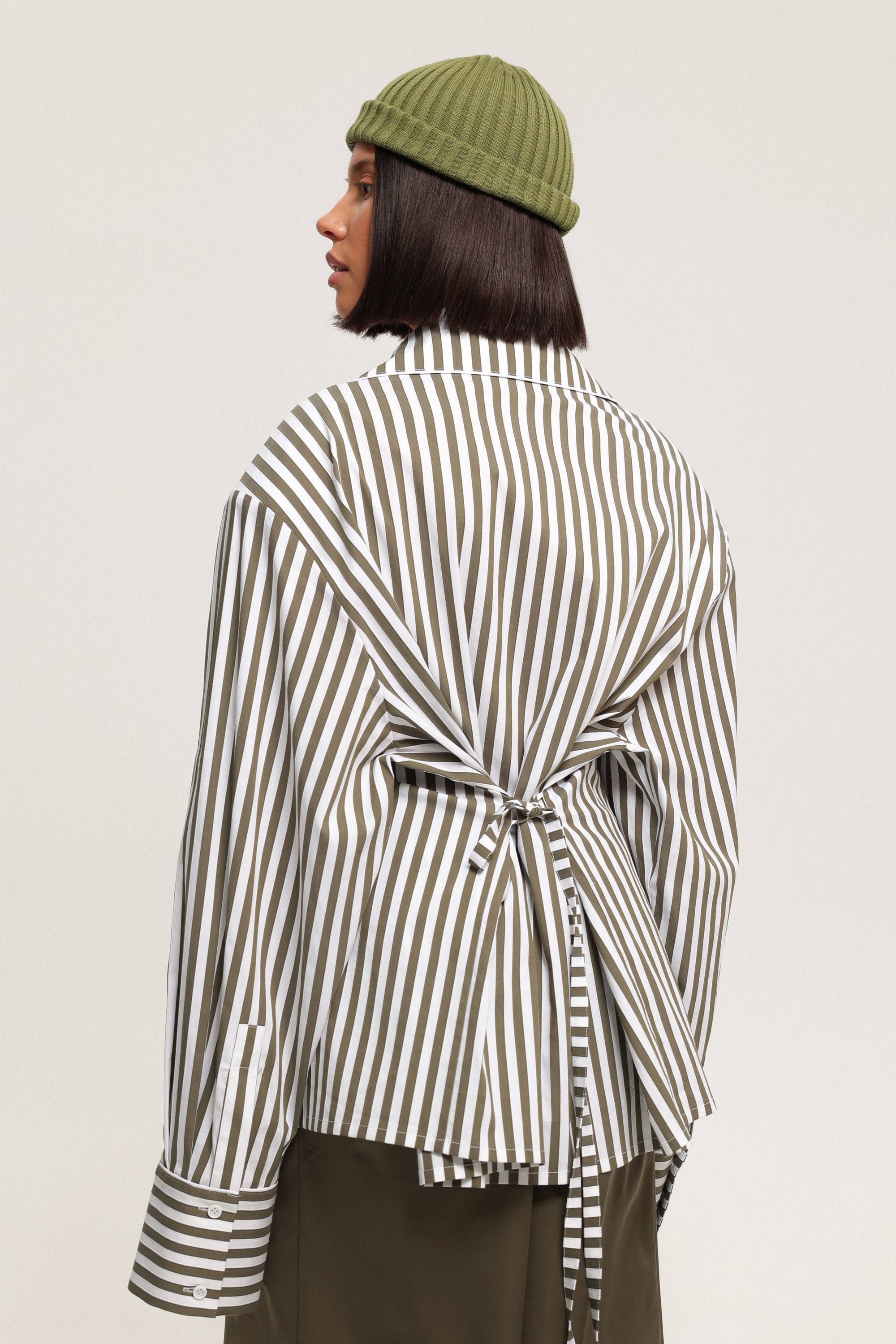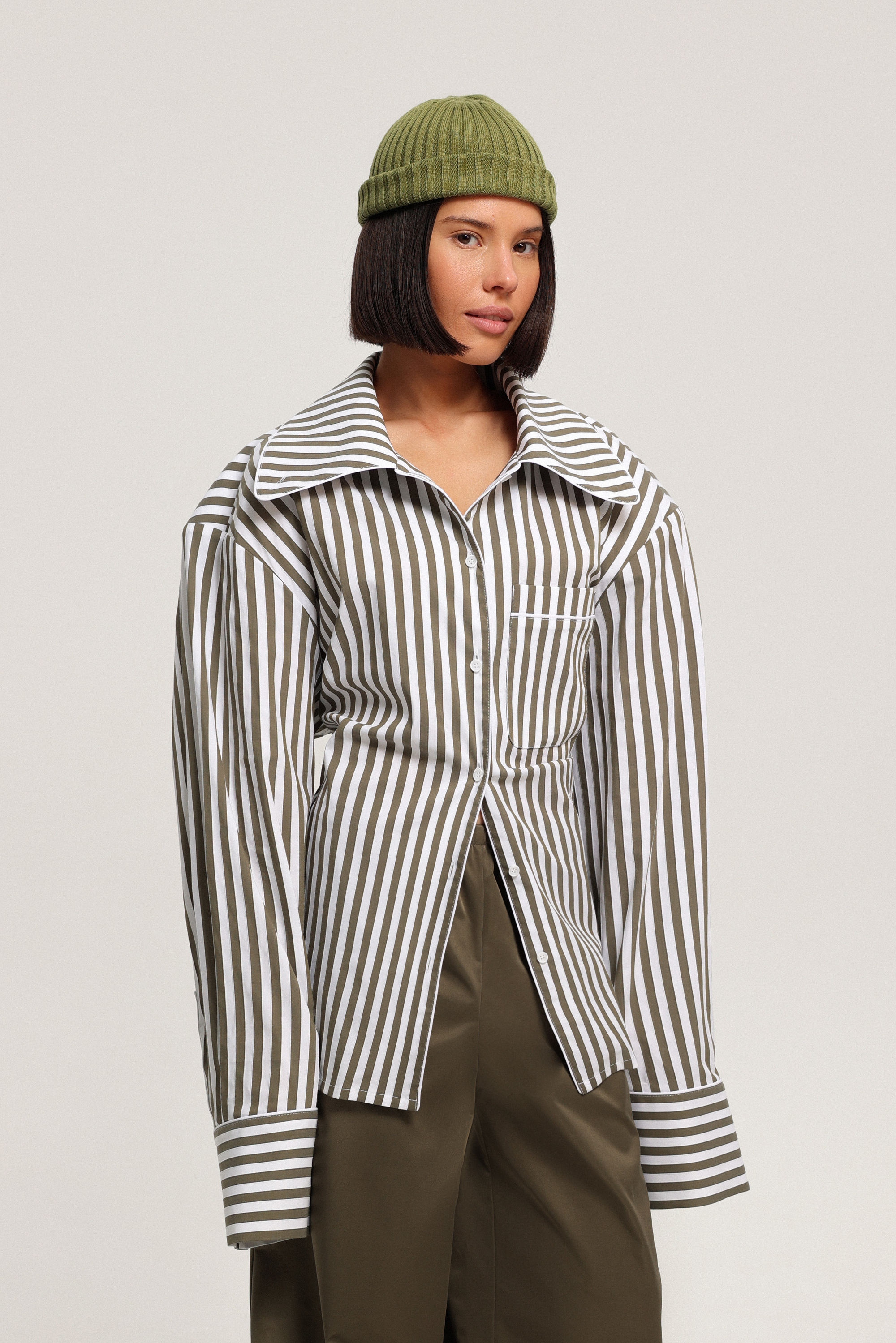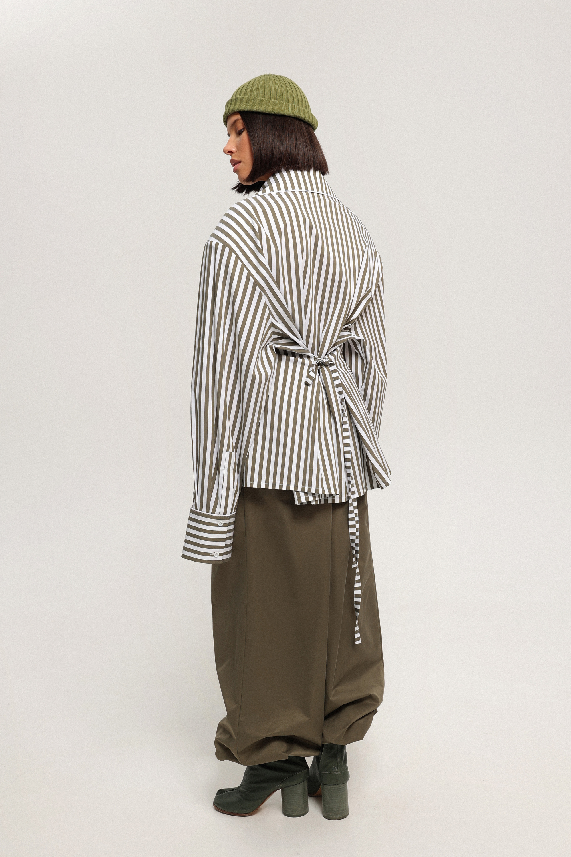 Рубашка в полоску с кантами и увеличенным округлым воротником. Тонкий пояс в комплекте продевается через петельки на спинке, позволяя приталить силуэт. Съёмные подплечники трансформируют модель из акцентной в свободный oversize. Воротник можно застегнуть на пуговицу, опустить или оформить как стойку, меняя характер образа.