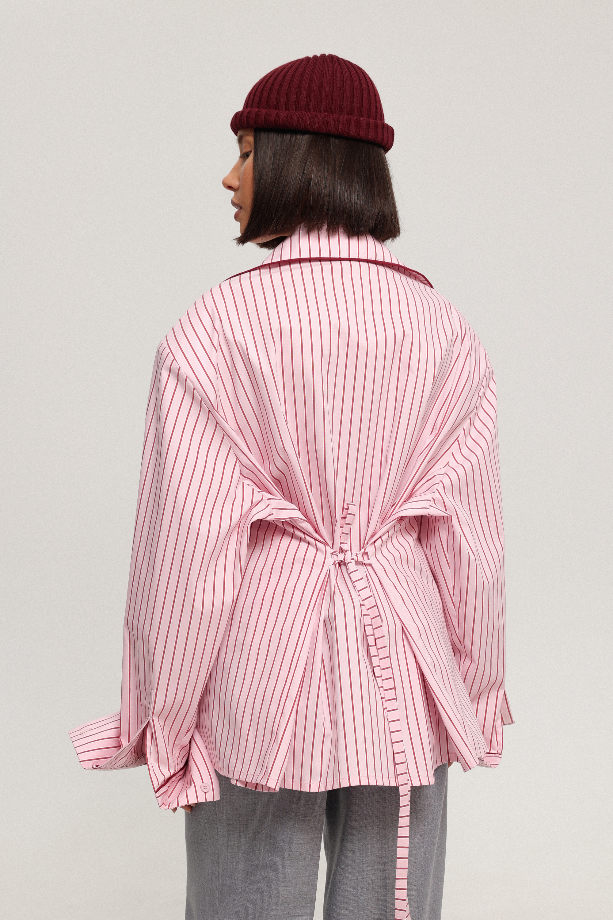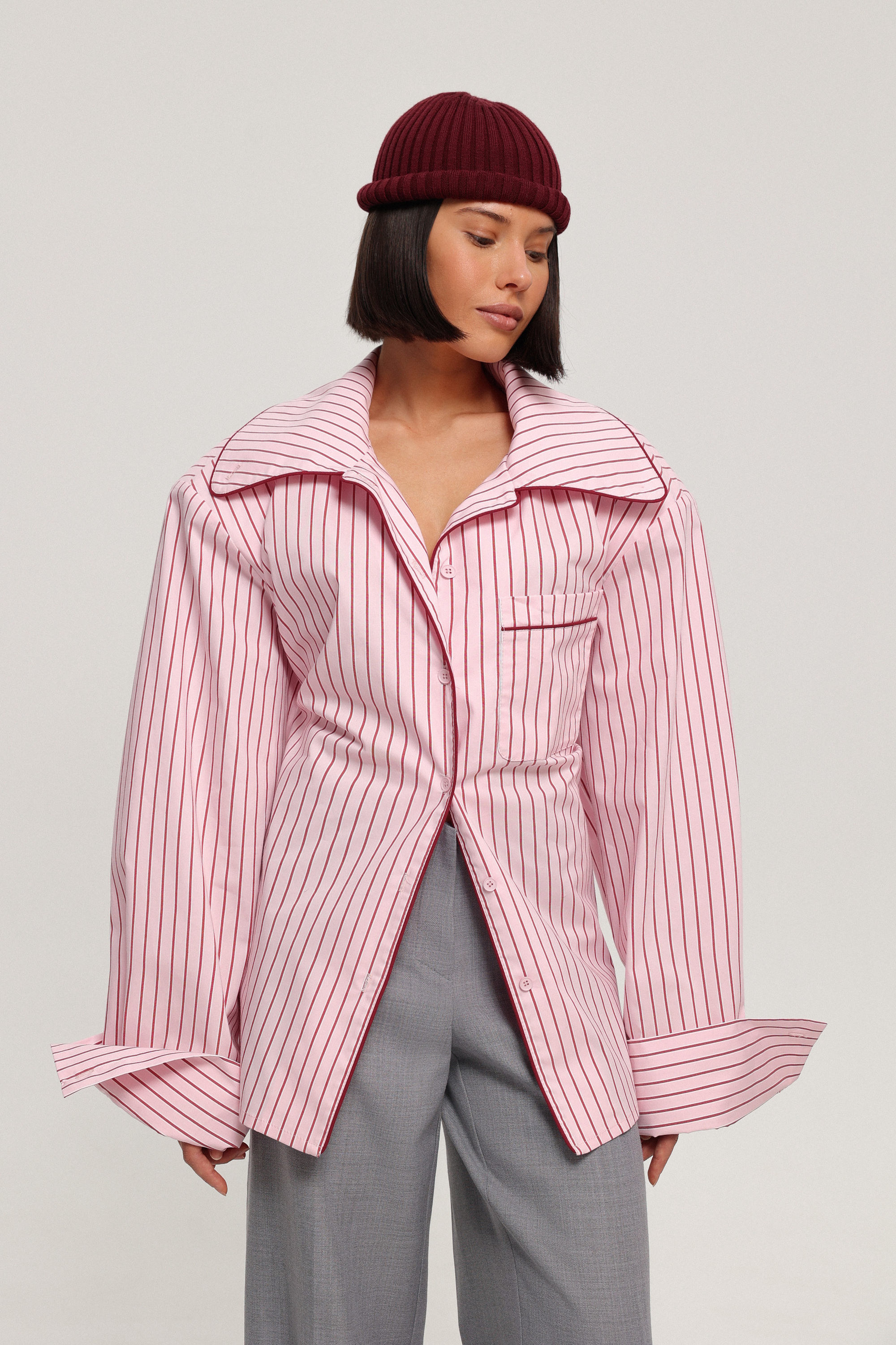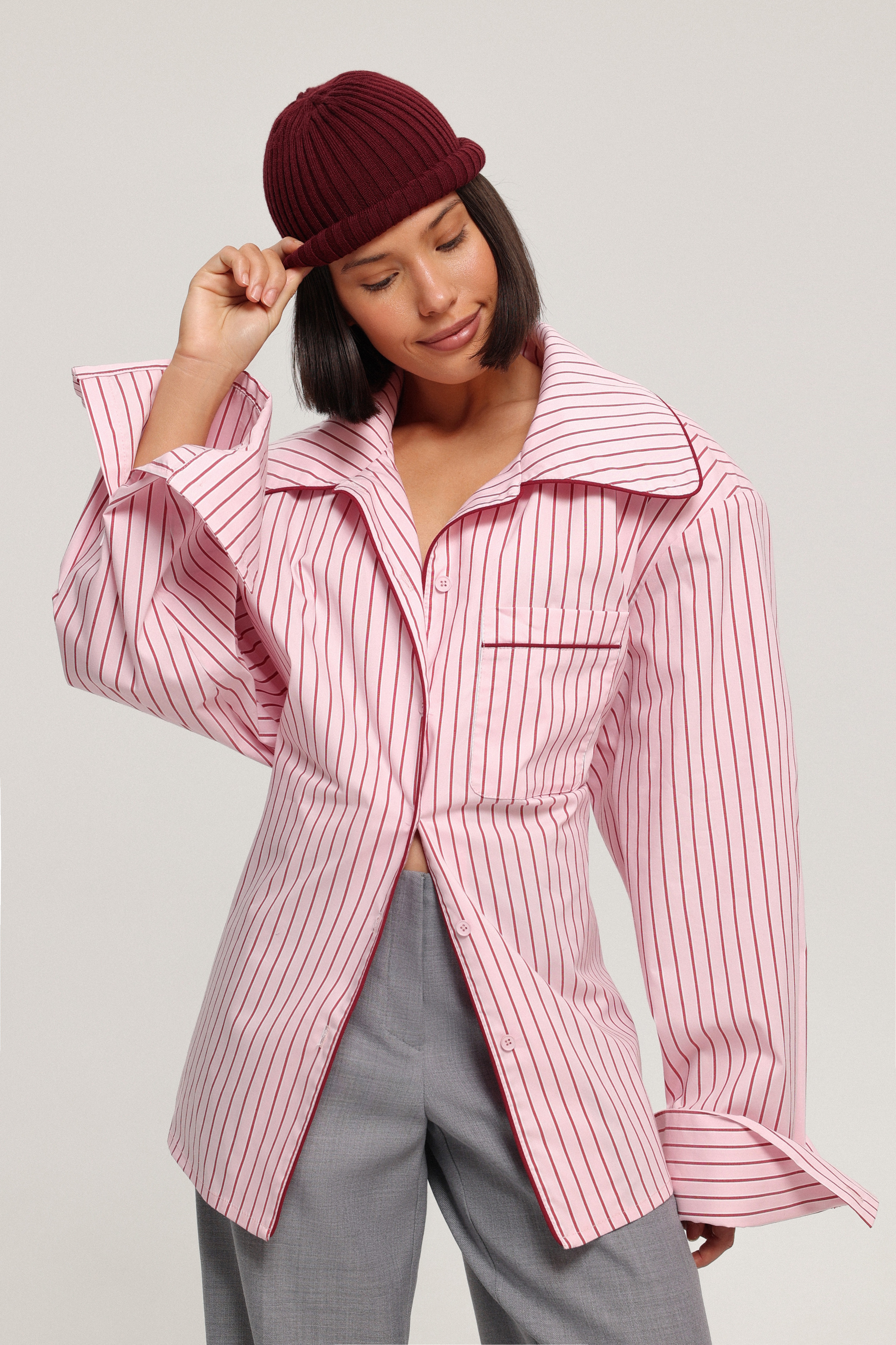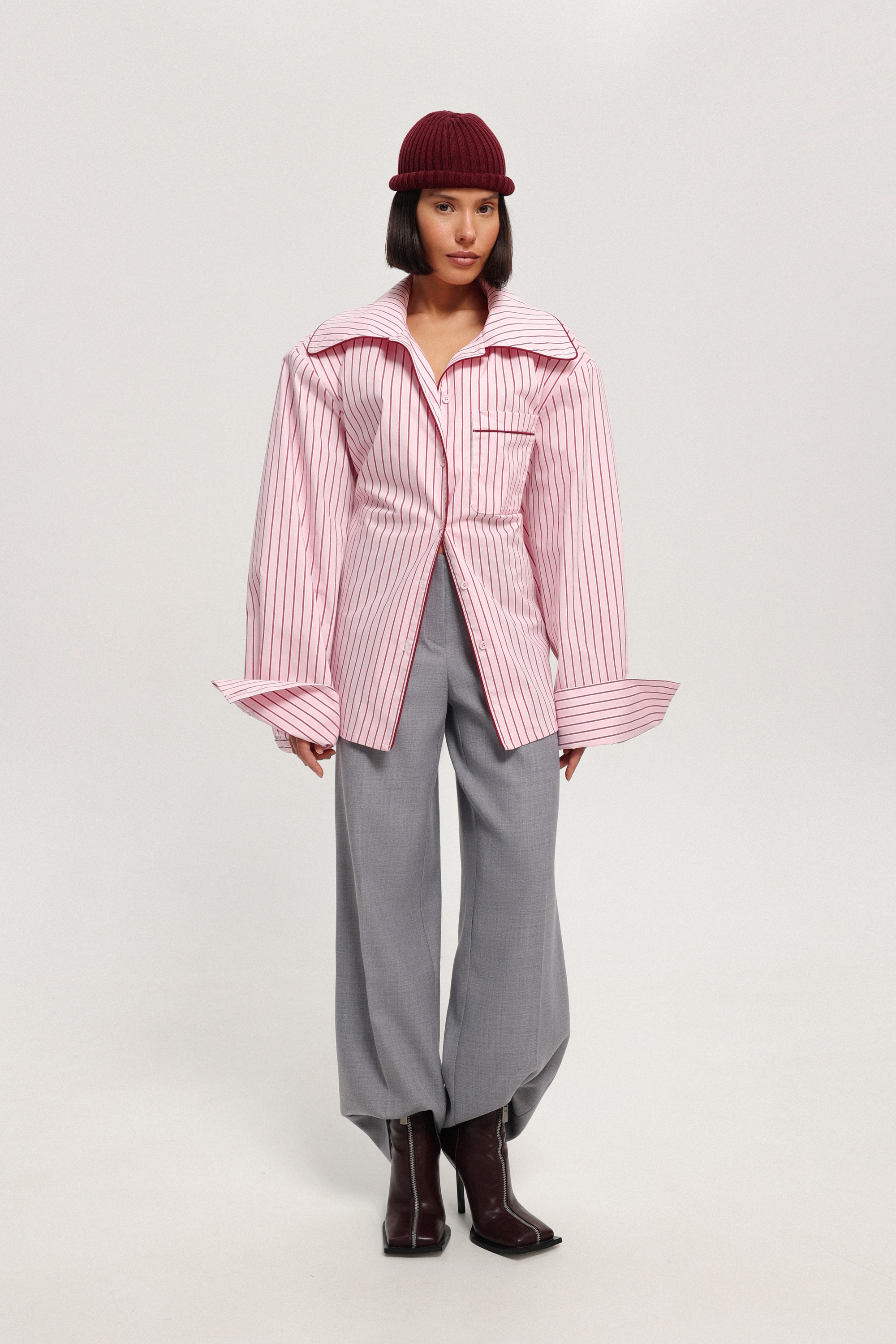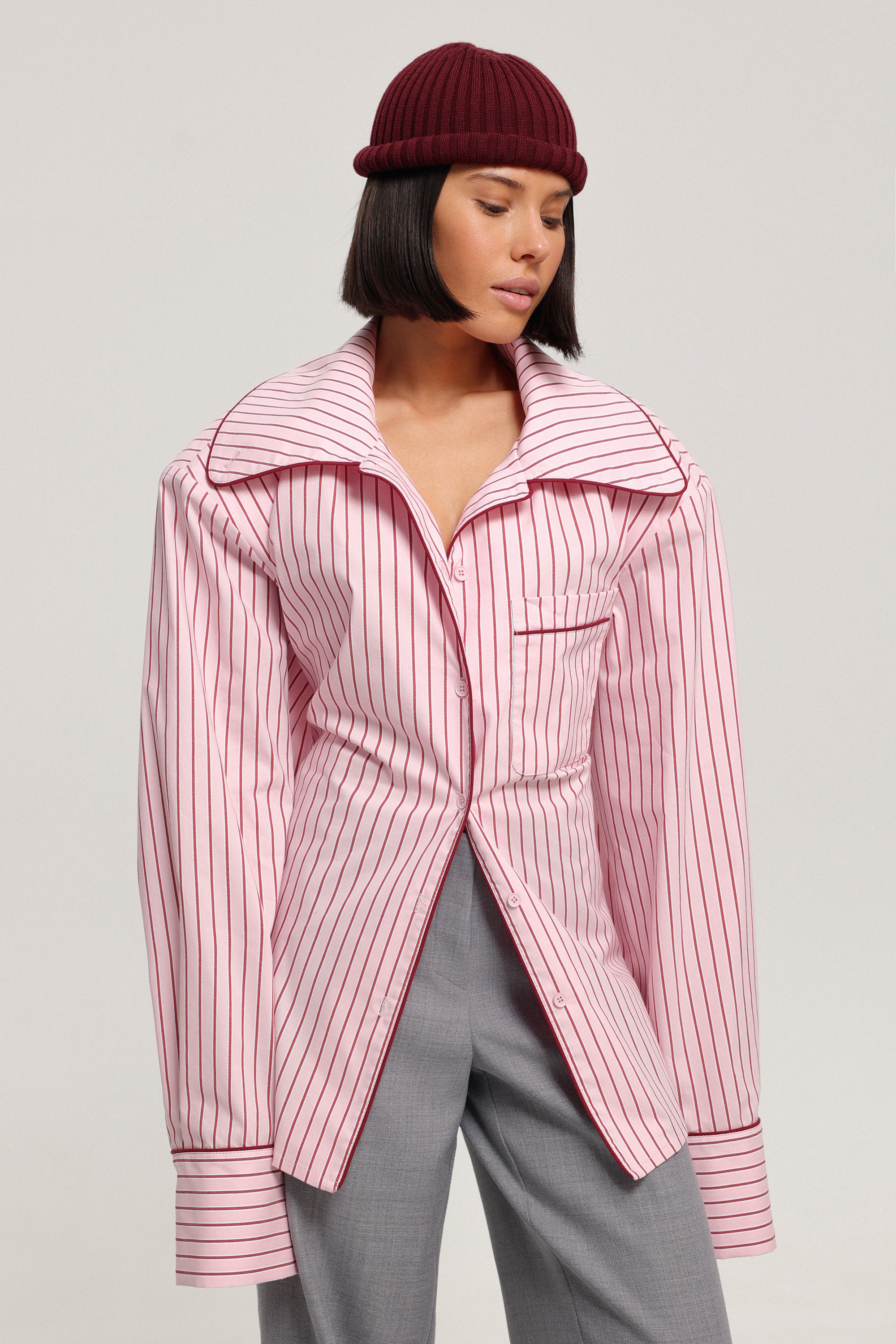 Рубашка в полоску с кантами и увеличенным округлым воротником. Тонкий пояс в комплекте продевается через петельки на спинке, позволяя приталить силуэт. Съёмные подплечники трансформируют модель из акцентной в свободный oversize. Воротник можно застегнуть на пуговицу, опустить или оформить как стойку, меняя характер образа.