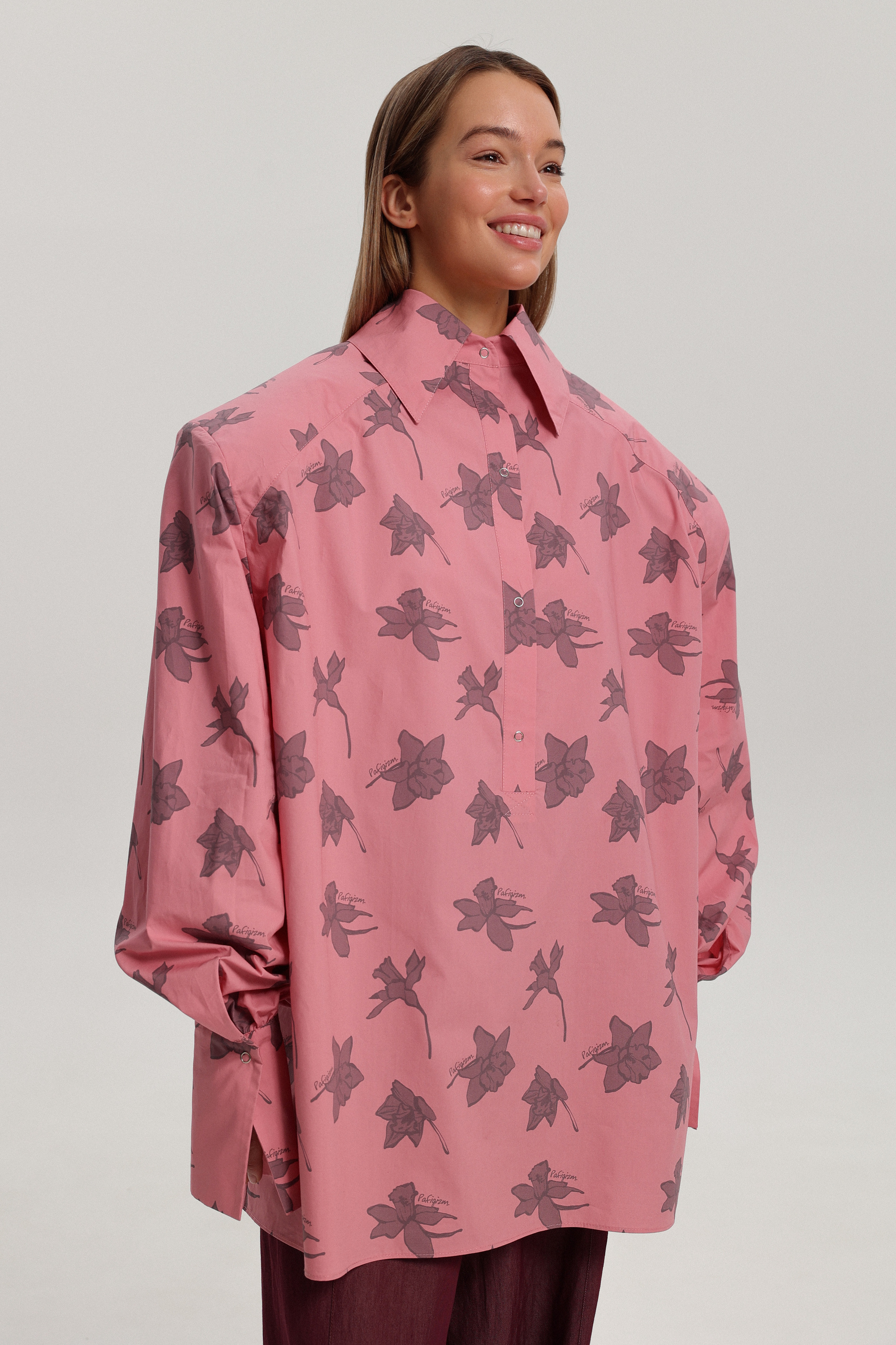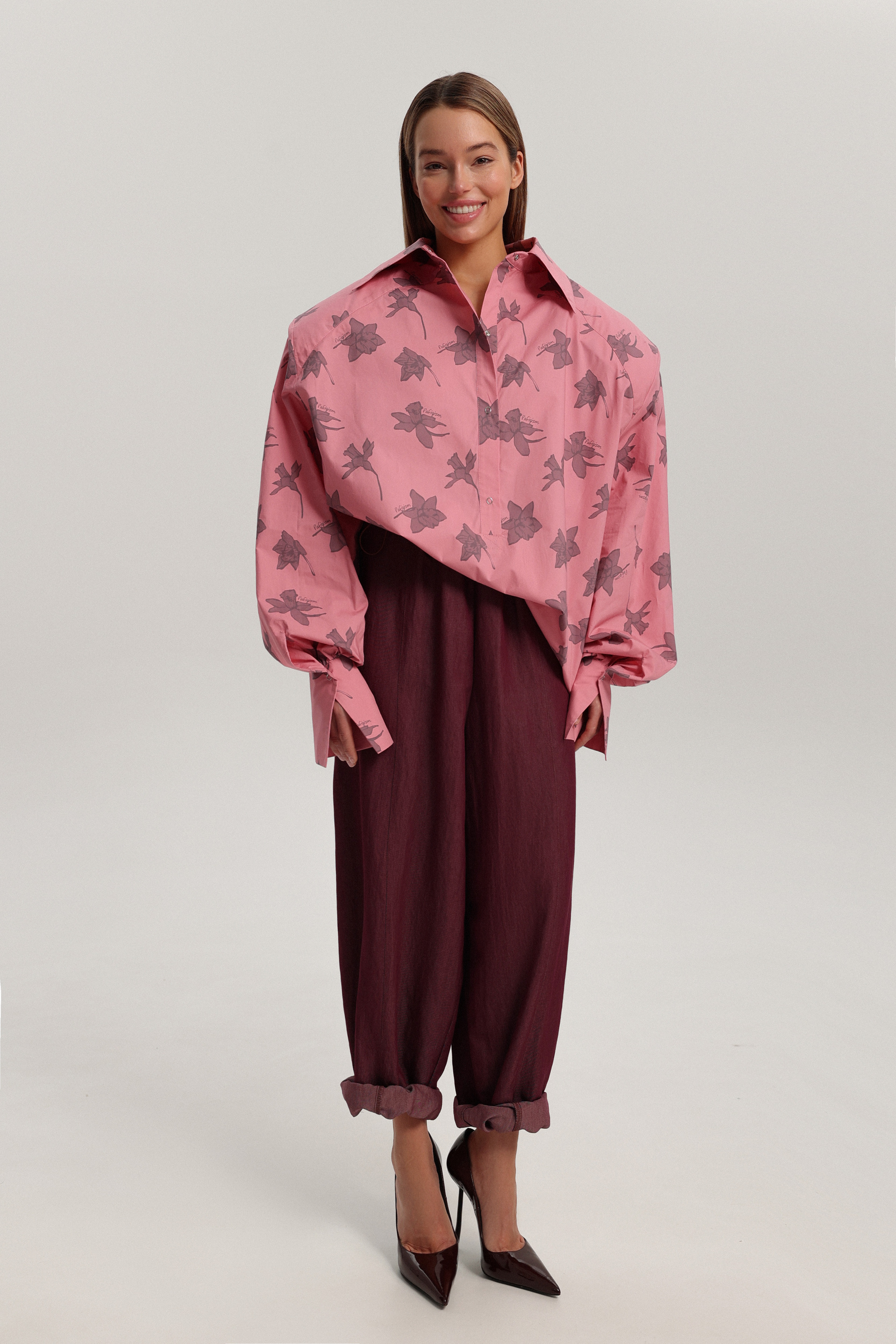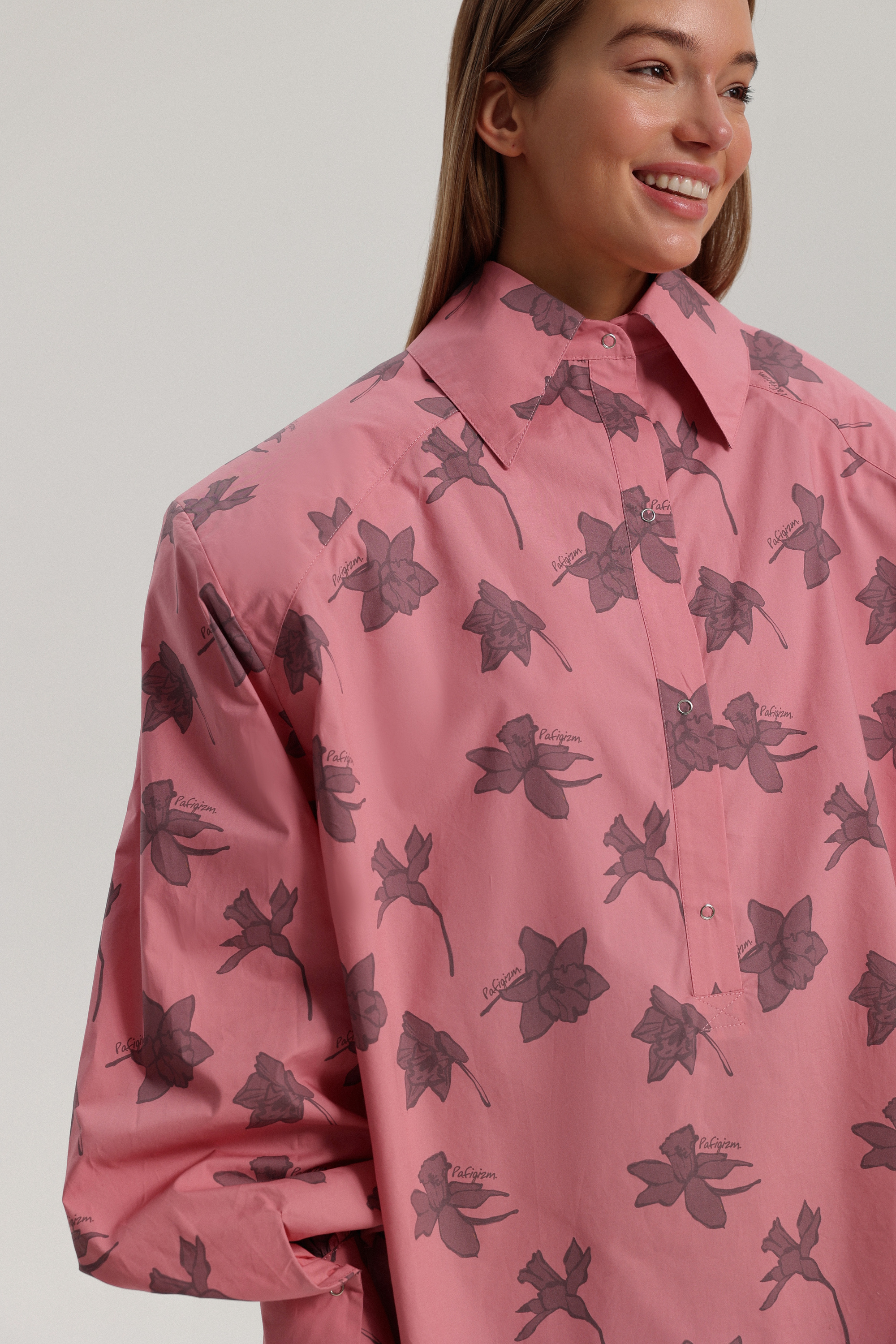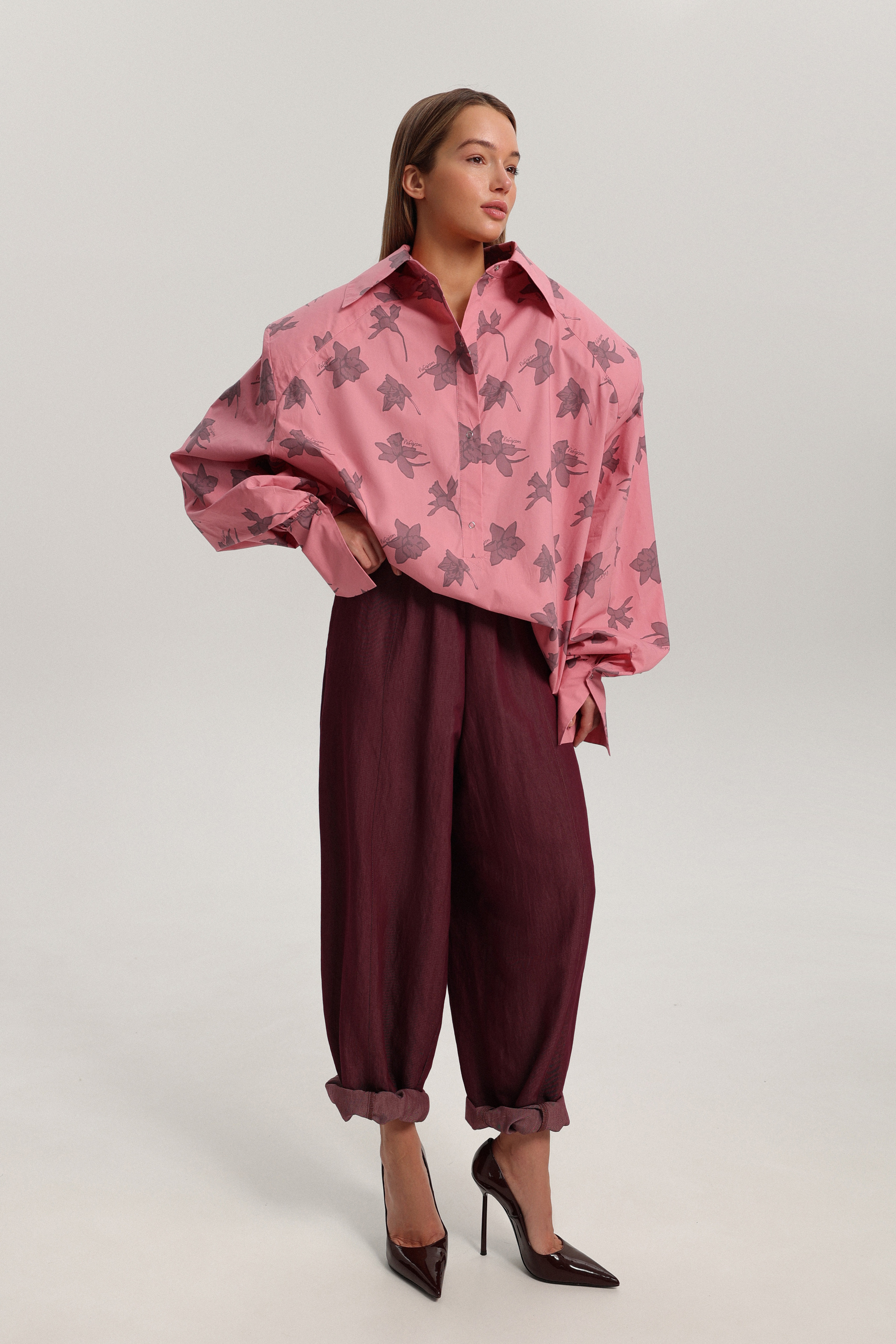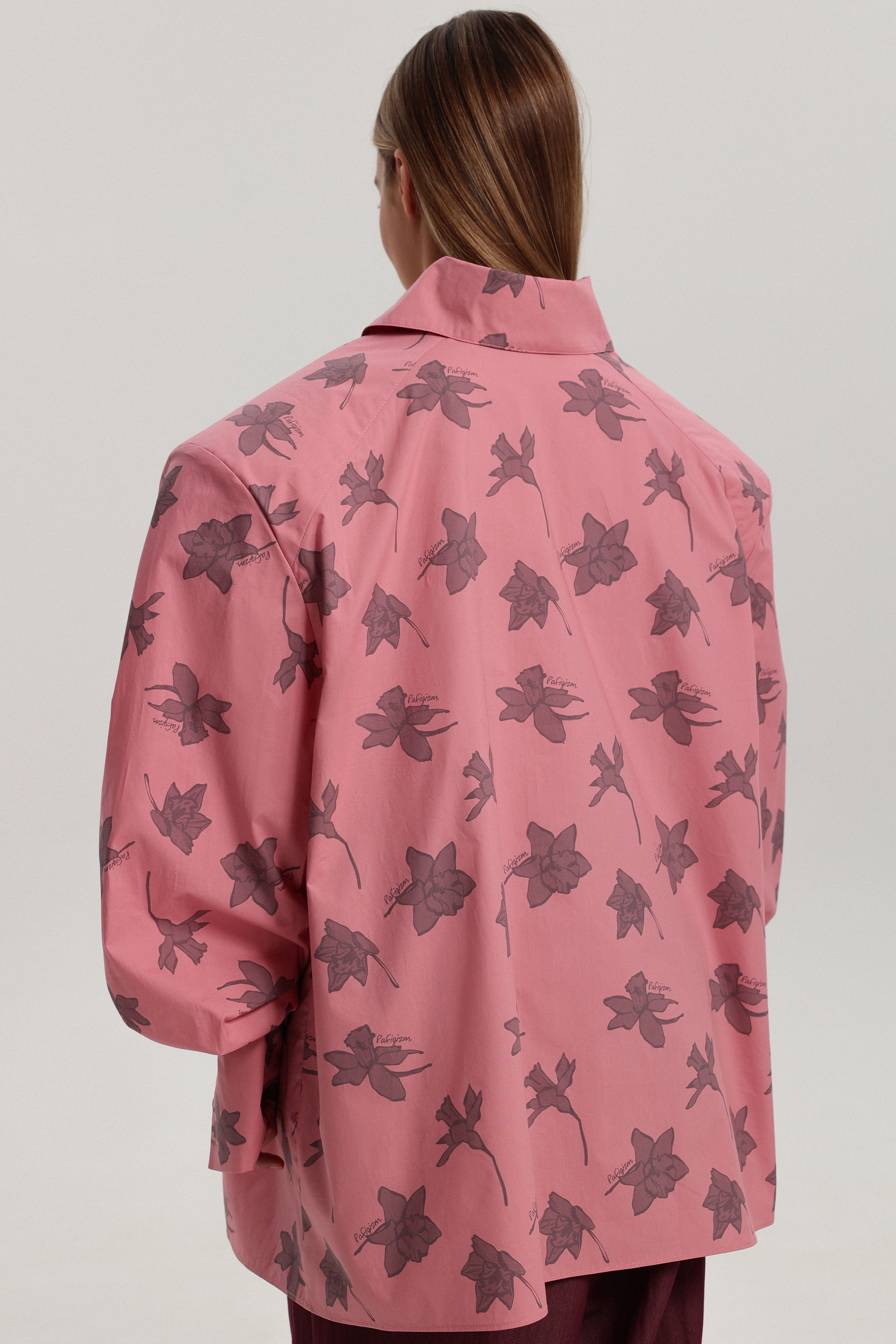 Рубашка оверсайз-силуэта с фирменным брендированным принтом и гиперобъёмной линией плеч. Уникальность модели — её можно носить на две стороны, меняя характер образа. Рубашку легко сочетать с брюками или джинсами, а также носить как мини-платье, дополнив ремнём. Застёжка расположена сзади на кнопках, манжеты также фиксируются на кнопках.
