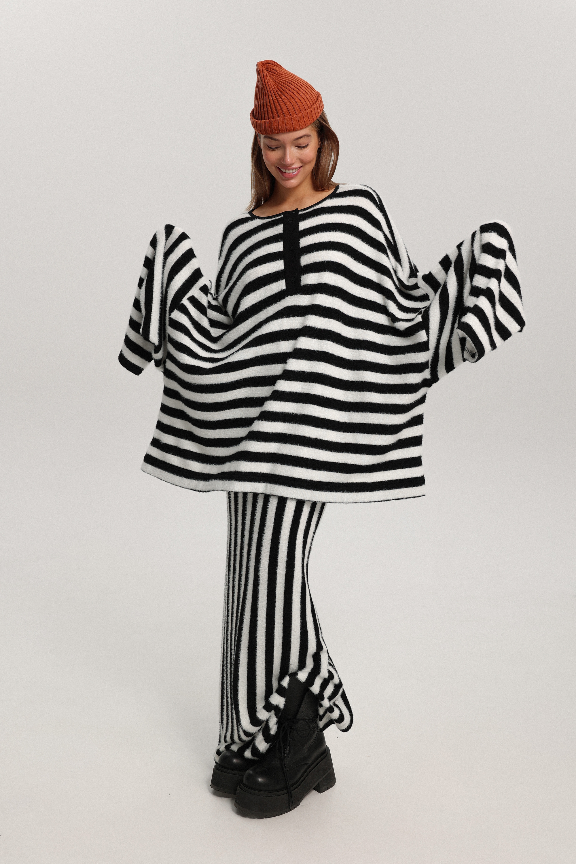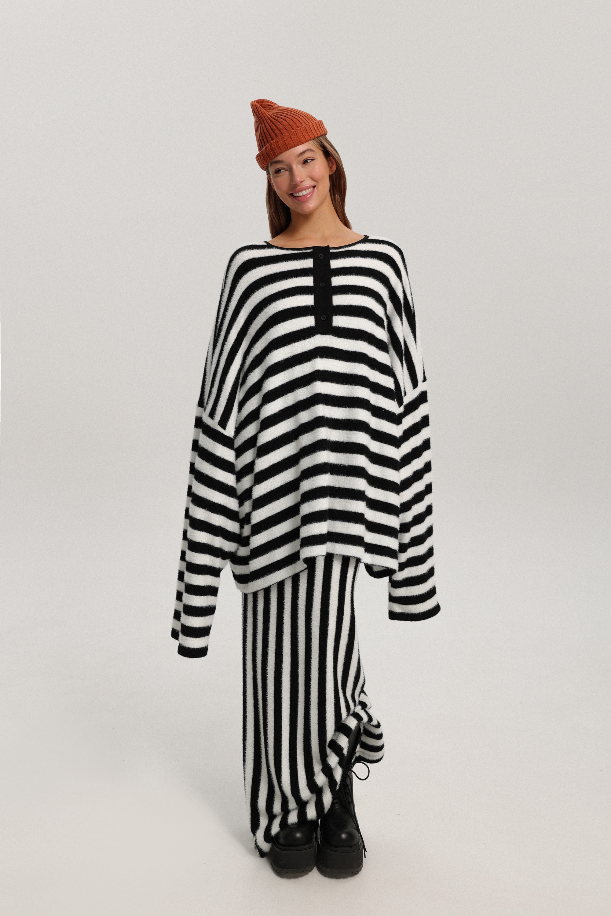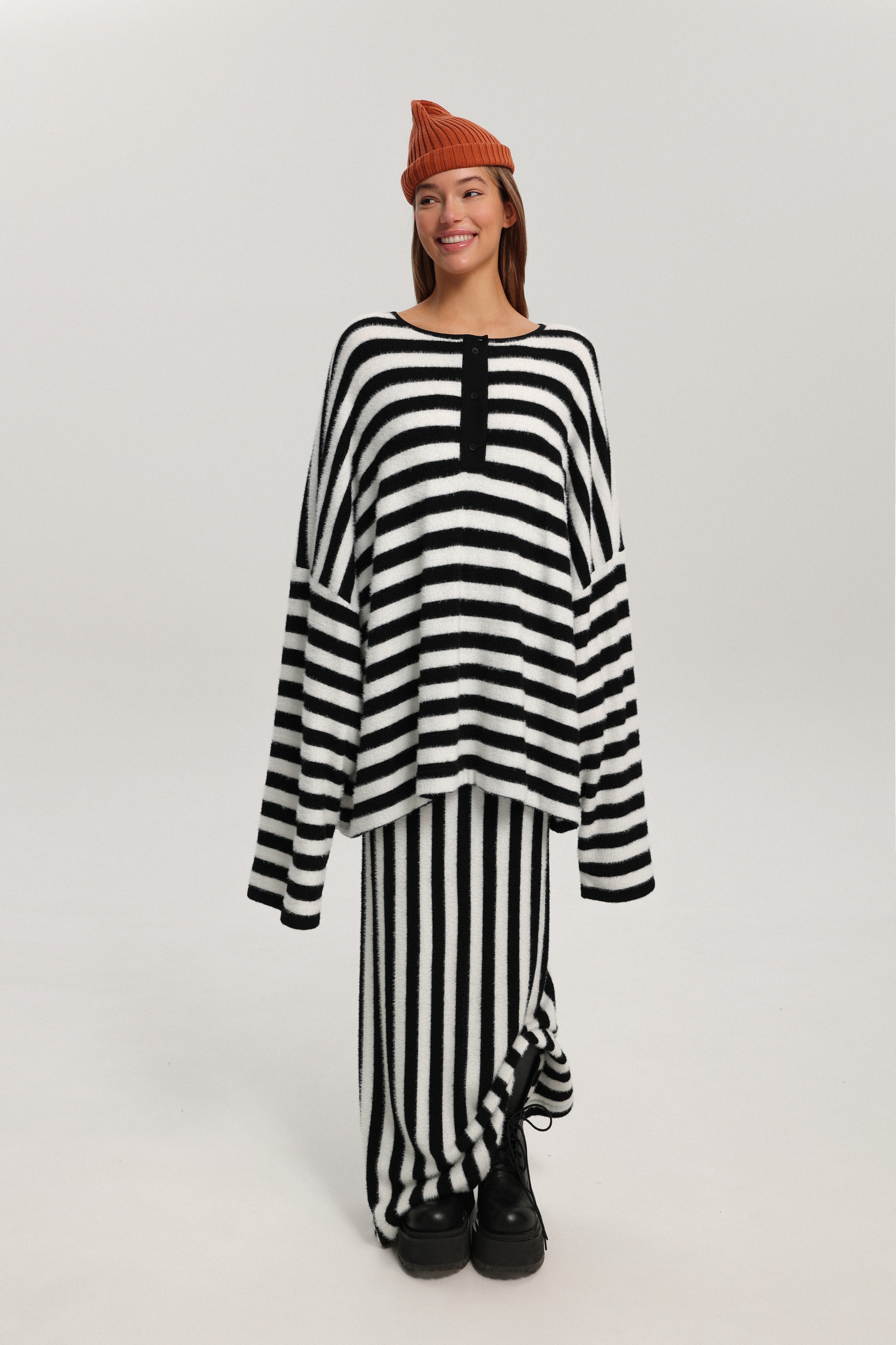 Юбка из пушистой ткани на эластичной резинке по талии. Модель дополнена разрезом сзади, который добавляет свободу движения и подчёркивает силуэт. Идеально сочетается с топом или свитшотом в полоску, образуя цельный комплект.