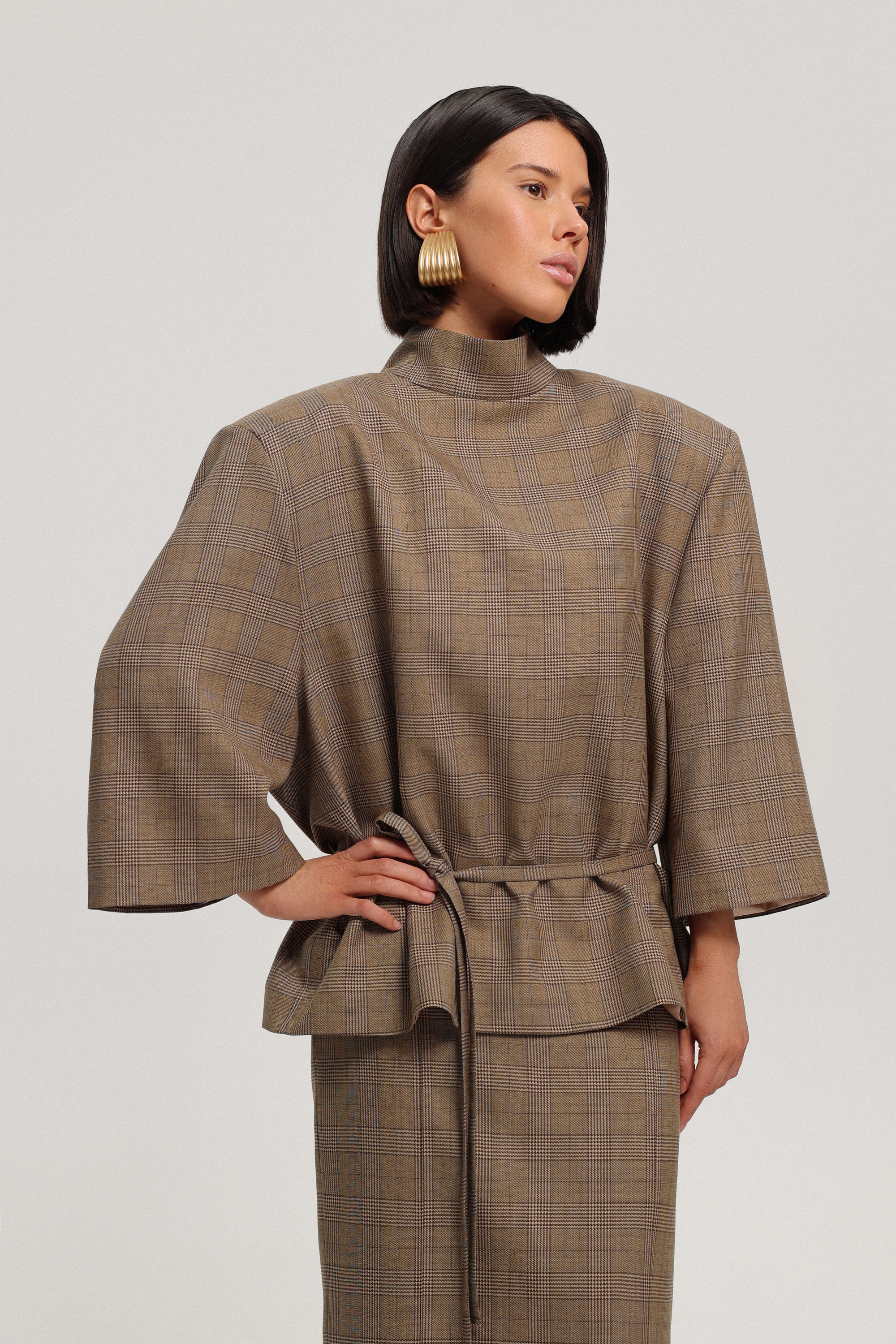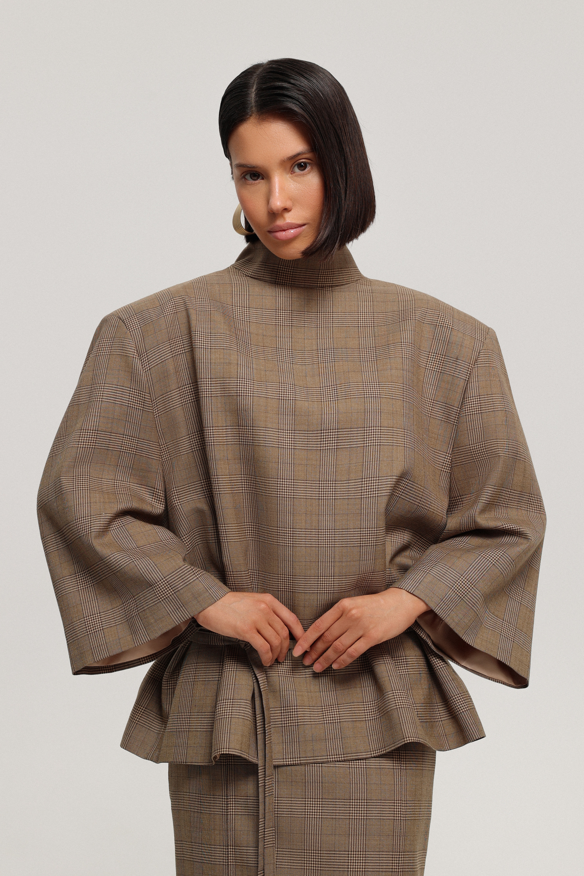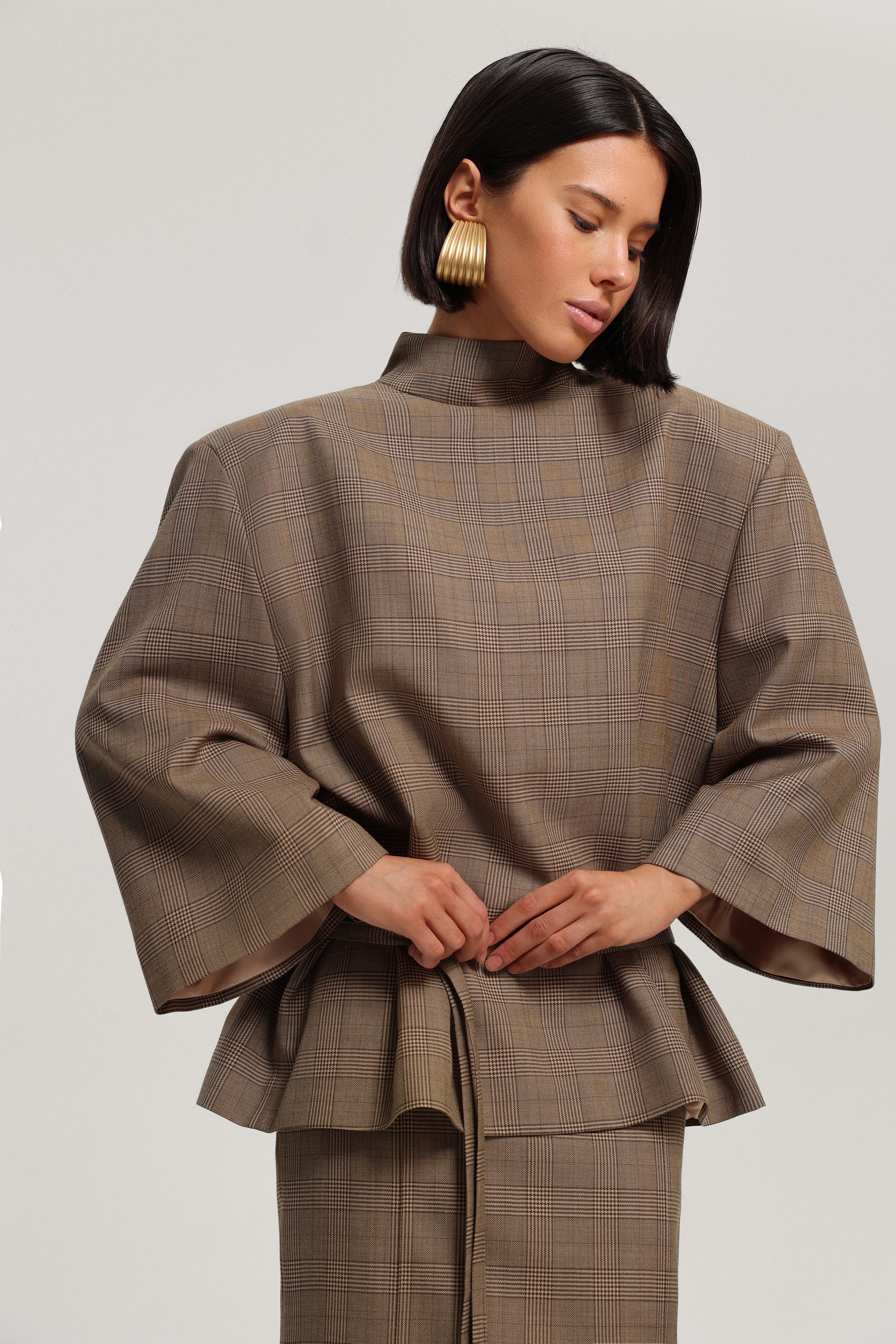 Футболка-жакет с усиленной линией плеча и укороченными рукавами, которые можно подвернуть. Застёжка на пуговице сзади и глубокий разрез добавляют выразительный акцент. Модель можно носить на обе стороны, сочетая с кружевным топ-лифом и меняя настроение образа.