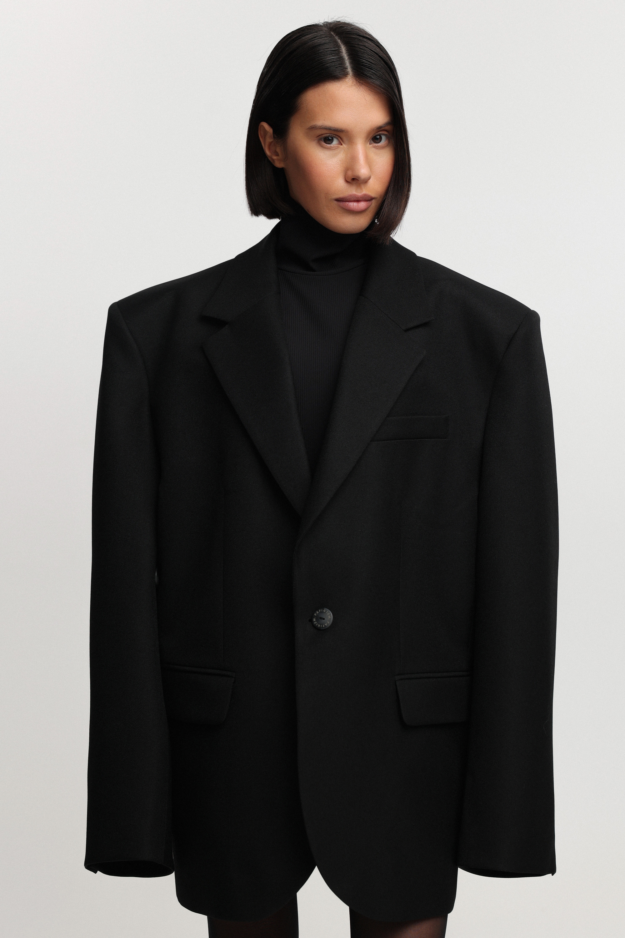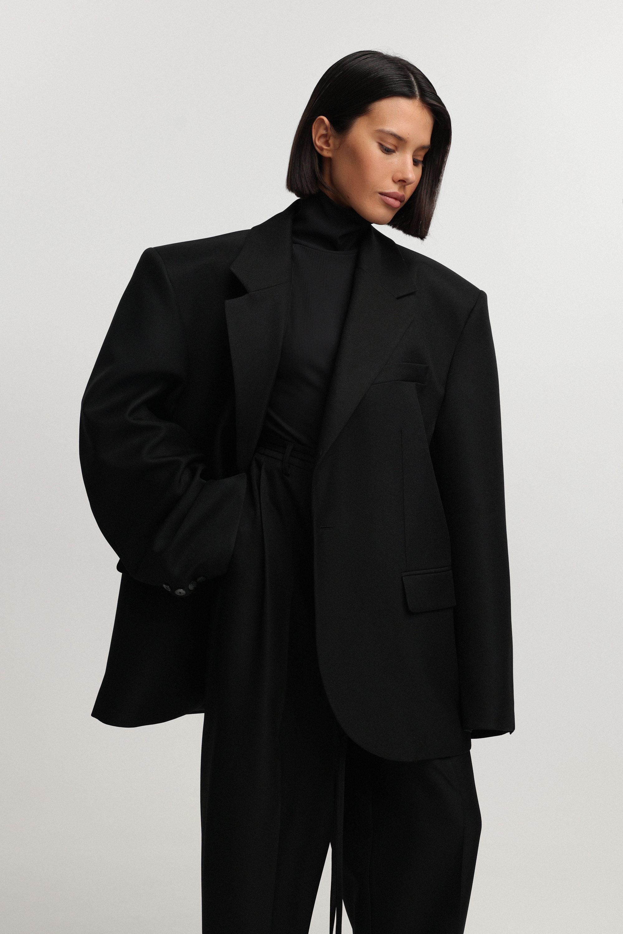 Жакет oversize-силуэта слегка удлинённого формата с расширенными рукавами — для комфортной стилизации со свитерами. Боковая пуговица позволяет дополнительно приталить модель и менять характер посадки.