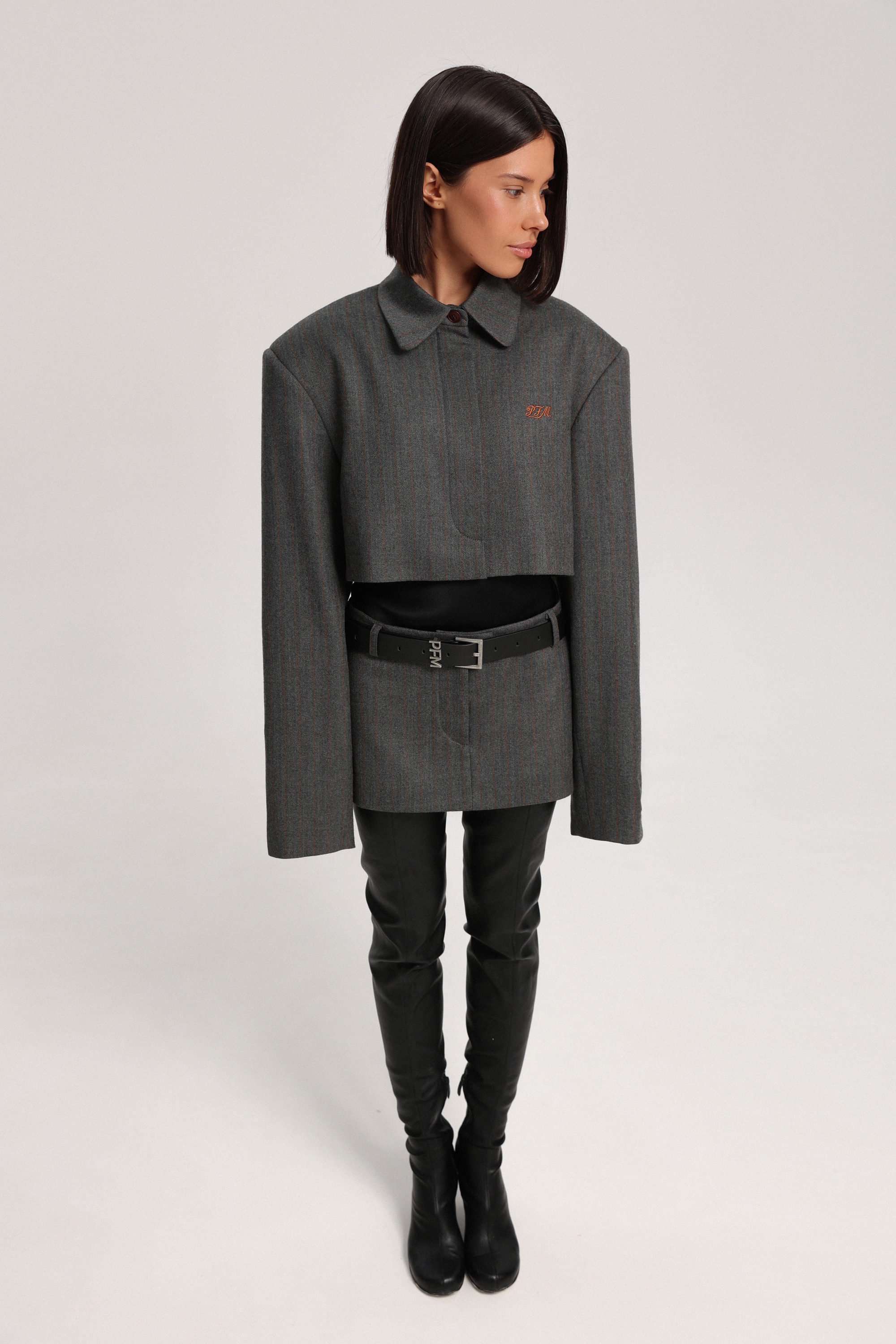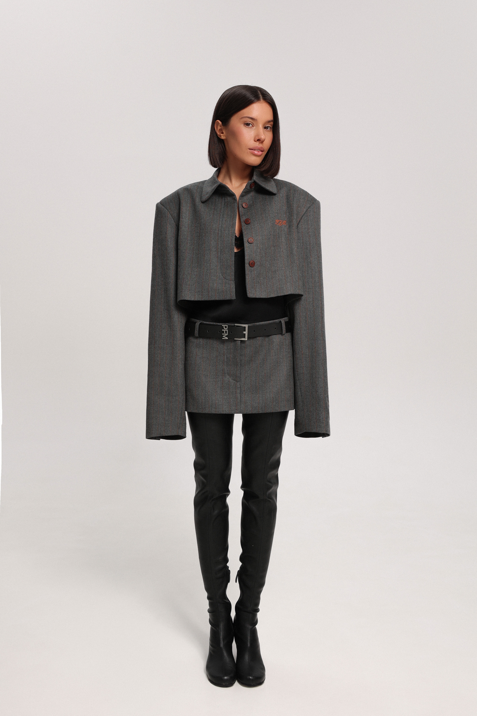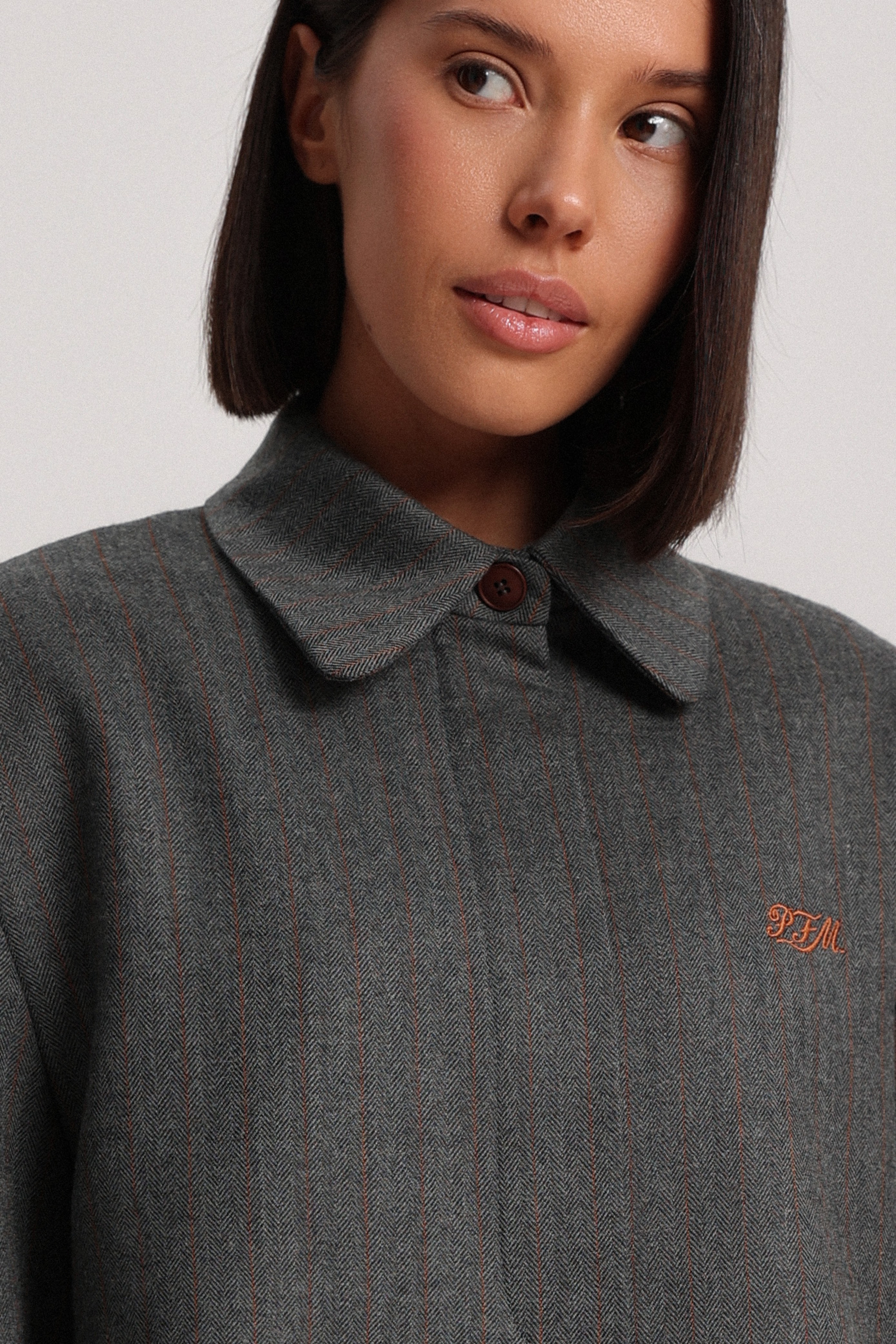 Укороченный жакет из ткани с добавлением шерсти. Застёжка на планке скрыта, благодаря чему модель выглядит аккуратно и лаконично. Жакет дополнен рубашечным воротником и контрастной брендированной вышивкой спереди, которая становится деликатным акцентом изделия.